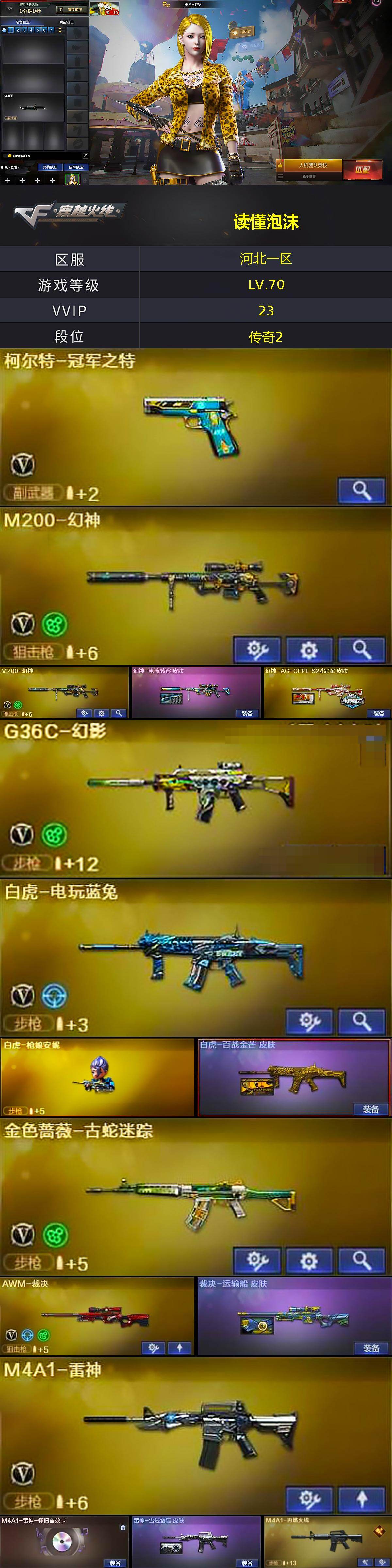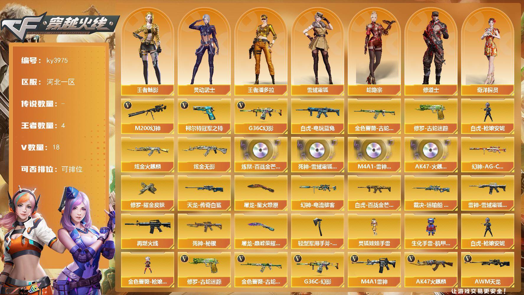 [14394355]河北一区-18V-4王者-2炫金 【热门武器】:G36C-幻影,M200-幻神*2,金色蔷薇-古蛇迷踪,修罗-古蛇迷踪,白虎-电玩蓝兔,柯尔特-冠军之特,白虎-枪娘安妮 【王者炫金武器】:炫金火麒麟,炫金无影 【音效卡】:炼狱-百战金芒-庆典舞曲音效卡,死神-雪域霜狐-怀旧音效卡,M4A1-雷神-怀旧音效卡,AK47-火麒麟-怀旧音效卡 【皮肤】:幻神-电流骇客 皮肤,幻神-AG-CFPL S24冠军 皮肤,白虎-百战金芒 皮肤,裁决-运输船 皮肤,雷神-雪域霜狐 皮肤,M4A1-再燃火线,死神-秘银,AWM-天龙-传奇白鲨,修罗耀金皮肤,屠龙-星火燎原,屠龙-巅峰荣耀 皮肤,轻型军用手斧-再燃火线 【角色】:王者-魅影,王者潘多拉,雪域霜狐,蛇隐宗,奇洋探员,修道士,暗夜-X,电竞少女,风暴女,猎狐者-追月,灵动武士,曼陀罗-X,潘多拉-甜心教官,蛇姬,维纳斯,夜玫瑰-宠粉 【人偶武器】:白虎-枪娘安妮,金色蔷薇-枪娘阿敏,生化手雷-机甲核心,灵狐娃娃手雷*4 【英雄级武器】:AK47-火麒麟,M4A1-雷神,G36C-幻影,黑武士-锦绣游龙,金色蔷薇-古蛇迷踪,死神-雪域霜狐,M4A1-猎神,白虎-电玩蓝兔,AWM-天龙,AWM-裁决,M200-幻神*2,王者凰鸣-觉醒版,炼狱-百战金芒,柯尔特-冠军之特,修罗-古蛇迷踪,麒麟刺-百战金芒,手雷-热带奇洋,高爆手雷-古蛇迷踪,烟雾弹-古蛇迷踪,M4A1-赤狱骑士 【道具】:BS战队炫彩背包,亚洲杯纪念炫彩背包,古蛇迷踪炫彩背包,奇洋探员-海龟背包,百战金芒炫彩背包,超级背包,雪域霜狐炫彩背包,女皇终结者-魔龙之吻,救世主-黑桃战神,黄金生化钩,绿色巨人,灵魂忍者*2,妖姬,迷雾幽灵,夺命之镰,防化服*2,星辰流光-枪王排位,枪王排位28赛季金色流光,枪王排位29赛季金色流光,语音特效-盛典烟火,语音特效-怀旧,古蛇迷踪打击特效,雪域霜狐表情,蛇隐宗表情,萌萌小葵表情,EP战队名片,EP战队喷图,防弹头盔*3,防弹衣*3,C4工具钳*3,手雷包*3 【特殊枪械】: