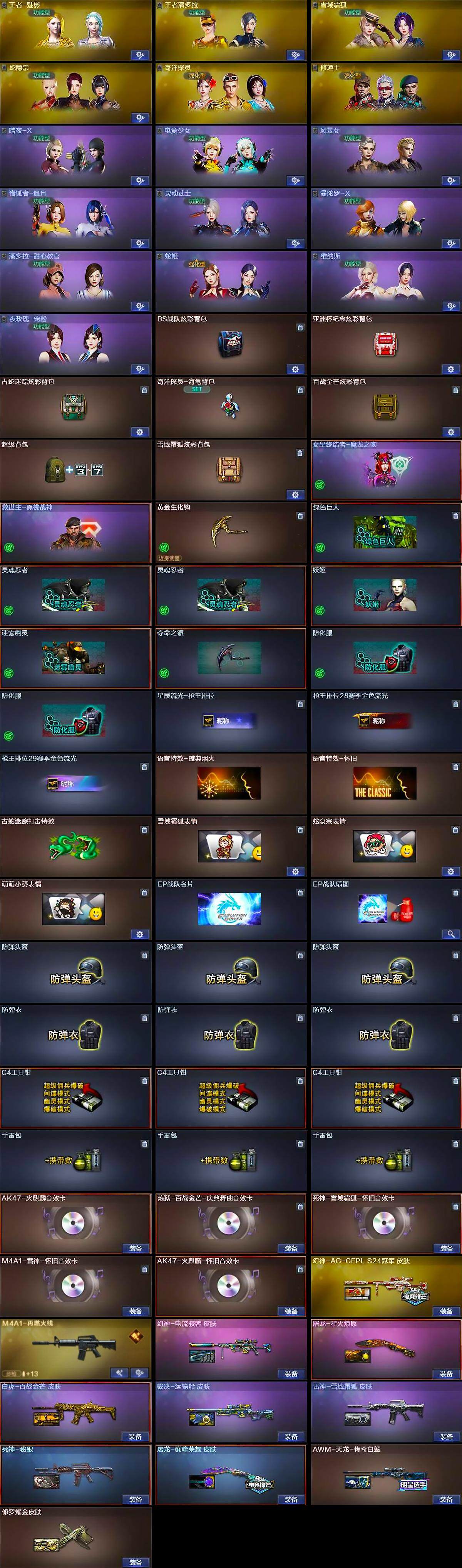 【道具】:BS战队炫彩背包,亚洲杯纪念炫彩背包,古蛇迷踪炫彩背包,奇洋探员-海龟背包,百战金芒炫彩背包,超级背包,雪域霜狐炫彩背包,女皇终结者-魔龙之吻,救世主-黑桃战神,黄金生化钩,绿色巨人,灵魂忍者*2,妖姬,迷雾幽灵,夺命之镰,防化服*2,星辰流光-枪王排位,枪王排位28赛季金色流光,枪王排位29赛季金色流光,语音特效-盛典烟火,语音特效-怀旧,古蛇迷踪打击特效,雪域霜狐表情,蛇隐宗表情,萌萌小葵表情,EP战队名片,EP战队喷图,防弹头盔*3,防弹衣*3,C4工具钳*3,手雷包*3