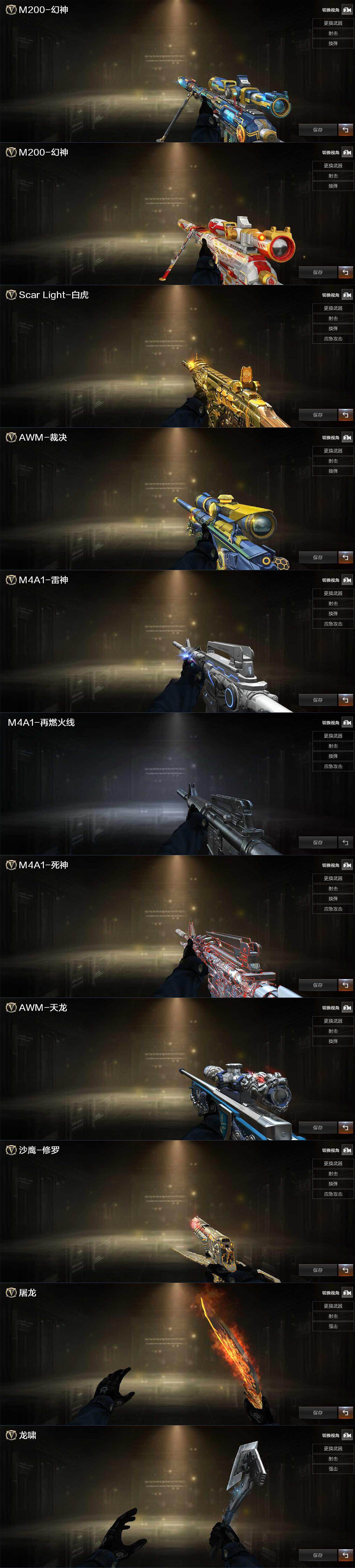 【英雄级武器】:AK47-火麒麟,M4A1-雷神,G36C-幻影,黑武士-锦绣游龙,金色蔷薇-古蛇迷踪,死神-雪域霜狐,M4A1-猎神,白虎-电玩蓝兔,AWM-天龙,AWM-裁决,M200-幻神*2,王者凰鸣-觉醒版,炼狱-百战金芒,柯尔特-冠军之特,修罗-古蛇迷踪,麒麟刺-百战金芒,手雷-热带奇洋,高爆手雷-古蛇迷踪,烟雾弹-古蛇迷踪,M4A1-赤狱骑士
