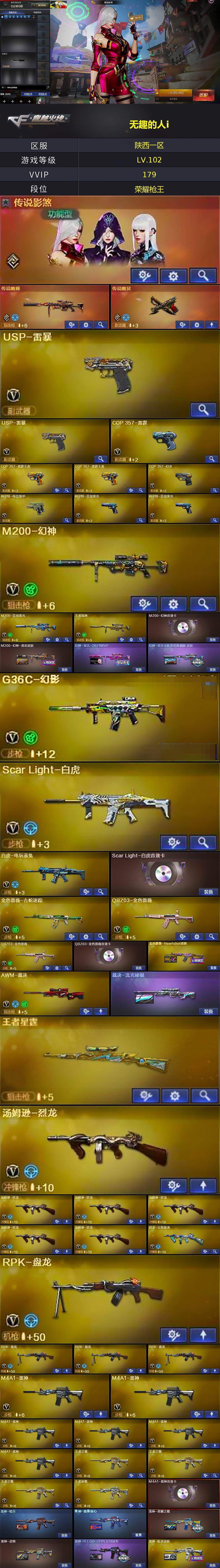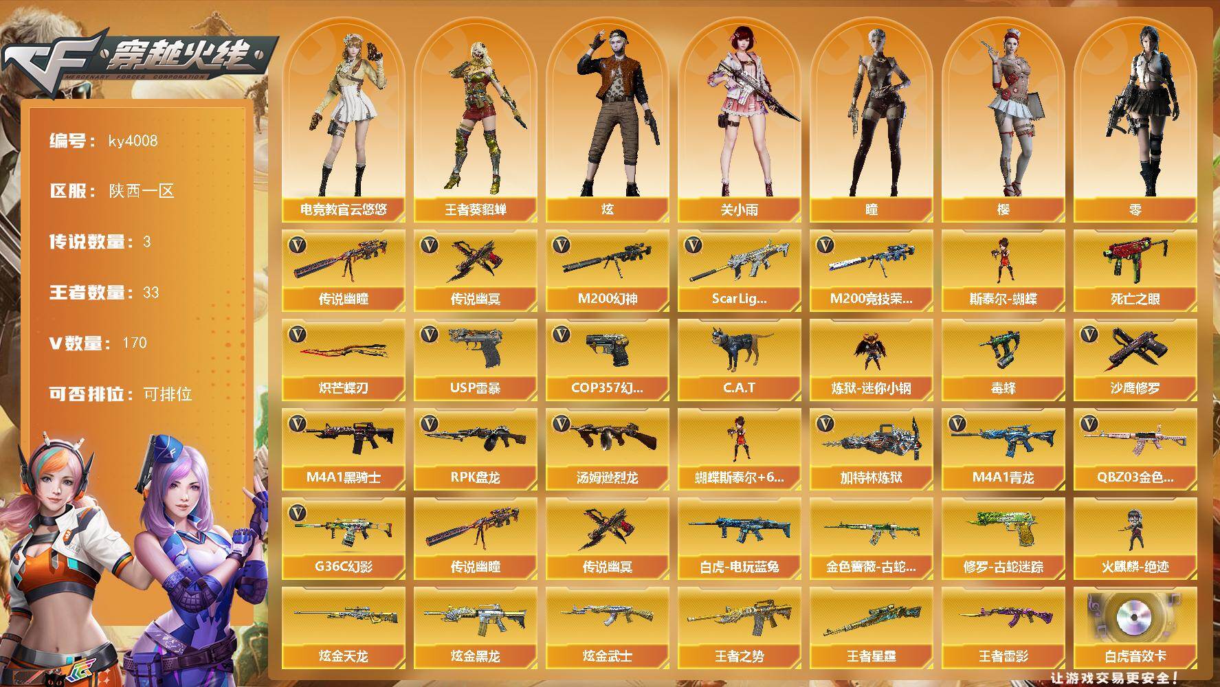[14394447]陕西一区-170V-33王者-4炫金 【传说武器】:传说幽瞳,传说幽冥 【传说角色】:传说影煞 【热门武器】:传说幽瞳,传说幽冥,G36C-幻影,QBZ03-金色蔷薇*2,Scar Light-白虎,M4A1-青龙,M200-幻神,金色蔷薇-古蛇迷踪,修罗-古蛇迷踪,M200-竞技荣光,死亡之眼,白虎-电玩蓝兔,C.A.T,炼狱-迷你小钢,毒蜂,M4A1-黑骑士*3,汤姆逊-烈龙*6,RPK-盘龙*4,加特林-炼狱*3,斯泰尔-蝴蝶,火麒麟-绝迹,USP-雷暴*2,COP 357-幻灵,沙鹰-修罗*6,炽芒蝶刃 【王者炫金武器】:王者之势,王者雷影,王者星霆,炫金黑龙,炫金武士,炫金天龙*2 【音效卡】:黑龙-古蛇迷踪音效卡,M200-幻神音效卡,AK47-火麒麟音效卡,M4A1-雷神音效卡,M4A1-黑骑士音效卡,Barrett-毁灭音效卡,Barrett-极光音效卡,Scar Light-白虎音效卡,M14EBR-玄武音效卡,Barrett-碧霄极光音效卡*3 【皮肤】:M200-幻神-黄忠皮肤,幻神-宠儿-2021MVP,幻神-星火小队签名臻藏版 皮肤,金色蔷薇-Heartshot皮肤,裁决-流光秘银,雷神-暗月,雷神-能量核心,雷神-荣耀之魄,雷神-虎将,雷神-R.LGD-CFPLS18冠军,雷神-航星皮肤,火麒麟-雷神,火麒麟-平天大圣,火麒麟-心动糖果,毁灭-暗月,毁灭-星空,黑龙-冠军之武,黑骑士-暗月*2,黑骑士-冠军之势,无影-能量核心,死神-机甲核心皮肤,玫瑰精灵-粉色浪漫 皮肤,天龙-秘银,AWM-天龙-传奇白鲨,修罗-能量核心*2,修罗-冠军之魂,屠龙-星火燎原,屠龙-春桃 皮肤,龙啸-冠军之啸,擎天-冠军之击,擎天-蒸汽钟表 皮肤 【角色】:零,樱,瞳,炫,电竞教官-云悠悠,关小雨,王者-葵-貂蝉,王者云悠悠,王者岚兮儿,蛇隐宗,奇洋探员,修道士,云海玲珑,北极狐-X,初恋灵狐,电竞少女,芳心审判者,嘉年华灵狐,兰妹妹,零-水下丽影,灵狐-花神,灵狐者-黄金海岸,龙儿-小淘气,潘多拉-X,潘多拉-甜心教官,蛇姬,斯沃特-X,铁骑荣耀,五号兵器-赛博朋克,夜玫瑰-幻能朋克,幽 【人偶武器】:火麒麟-绝迹,火麒麟-灵狐,炼狱-迷你小钢,斯泰尔-蝴蝶,Scar Light-马枪,AWM-灵狐-15周年嘉年华,COP-旗袍,C.A.T,迷你波特博