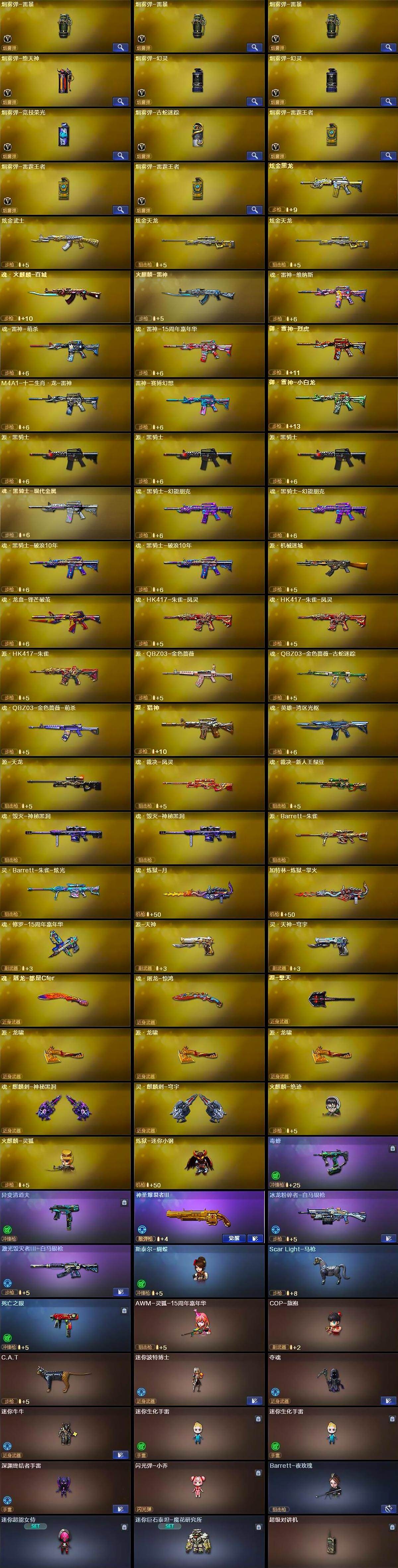 【热门武器】:传说幽瞳,传说幽冥,G36C-幻影,QBZ03-金色蔷薇*2,Scar Light-白虎,M4A1-青龙,M200-幻神,金色蔷薇-古蛇迷踪,修罗-古蛇迷踪,M200-竞技荣光,死亡之眼,白虎-电玩蓝兔,C.A.T,炼狱-迷你小钢,毒蜂,M4A1-黑骑士*3,汤姆逊-烈龙*6,RPK-盘龙*4,加特林-炼狱*3,斯泰尔-蝴蝶,火麒麟-绝迹,USP-雷暴*2,COP 357-幻灵,沙鹰-修罗*6,炽芒蝶刃