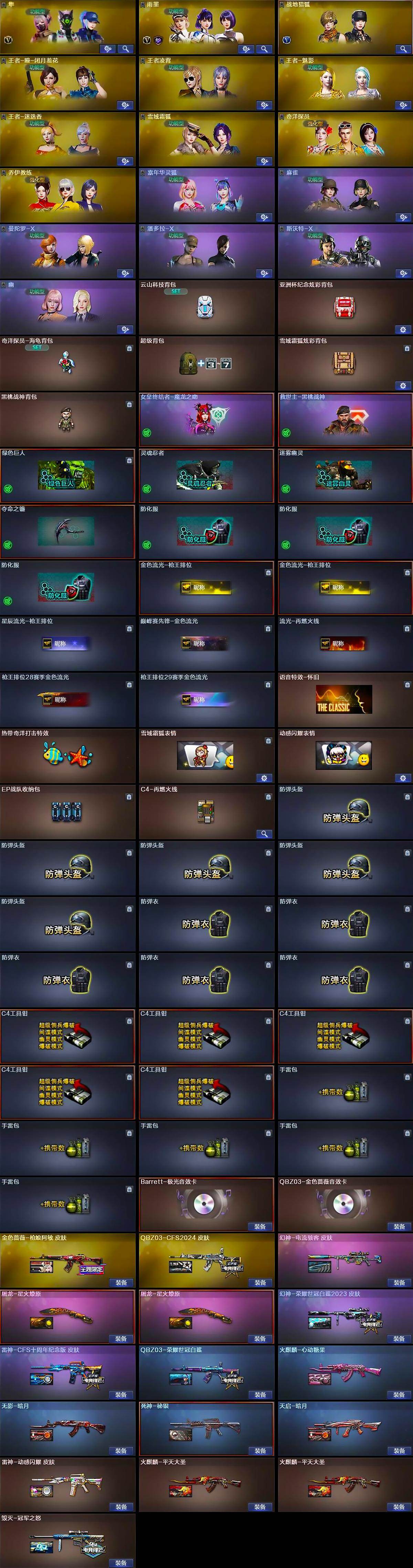 【道具】:云山科技背包,亚洲杯纪念炫彩背包,奇洋探员-海龟背包,超级背包,雪域霜狐炫彩背包,黑桃战神背包,女皇终结者-魔龙之吻,救世主-黑桃战神,绿色巨人,灵魂忍者,迷雾幽灵,夺命之镰,防化服*3,金色流光-枪王排位*2,星辰流光-枪王排位,巅峰赛先锋-金色流光,流光-再燃火线,枪王排位28赛季金色流光,枪王排位29赛季金色流光,语音特效-