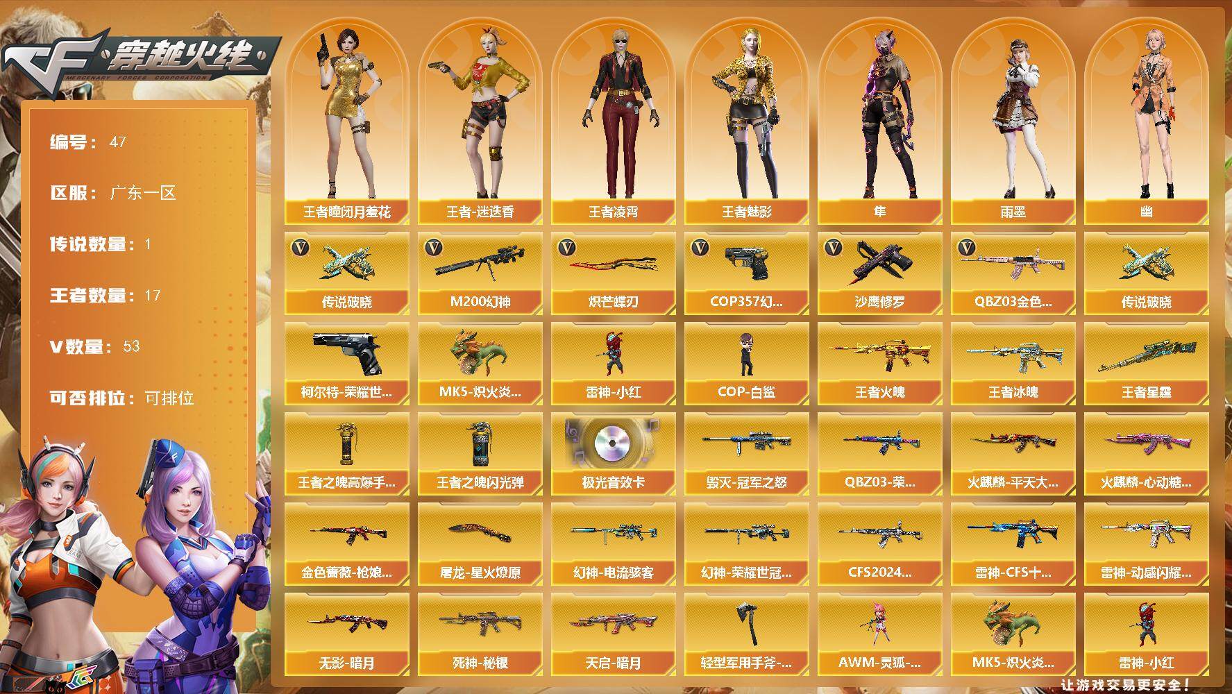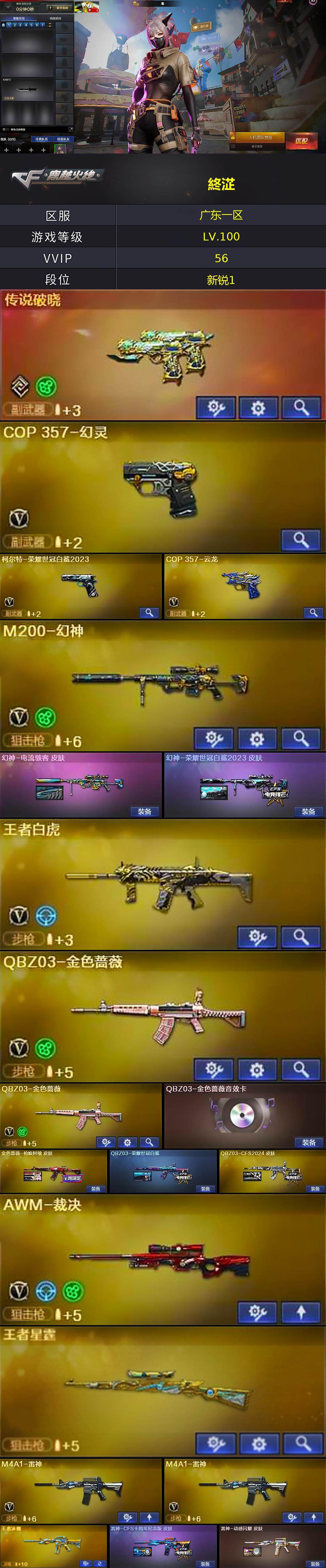 [14397169]广东一区-53V-17王者-0炫金 【传说武器】:传说破晓 【热门武器】:传说破晓,QBZ03-金色蔷薇*2,M200-幻神,柯尔特-荣耀世冠白鲨2023,MK5-炽火炎龙,雷神-小红,COP-白鲨,COP 357-幻灵,沙鹰-修罗,炽芒蝶刃 【王者炫金武器】:王者冰魄,王者火魄,王者星霆,王者之魄高爆手雷*3,王者之魄闪光弹*3 【音效卡】:Barrett-极光音效卡 【皮肤】:幻神-电流骇客 皮肤,幻神-荣耀世冠白鲨2023 皮肤,金色蔷薇-枪娘阿敏 皮肤,QBZ03-荣耀世冠白鲨,QBZ03-CFS2024 皮肤,雷神-CFS十周年纪念版 皮肤,雷神-动感闪耀 皮肤,火麒麟-平天大圣*2,火麒麟-心动糖果,毁灭-冠军之怒,无影-暗月,死神-秘银,天启-暗月,屠龙-星火燎原*2,轻型军用手斧-再燃火线 【角色】:隼,雨墨,战地猎狐,王者-瞳-闭月羞花,王者凌霄,王者-魅影,王者-迷迭香,雪域霜狐,奇洋探员,乔伊教练,嘉年华灵狐,疾风,麻雀,曼陀罗-X,潘多拉-X,斯沃特-X,幽 【人偶武器】:雷神-小红,COP-白鲨,MK5-炽火炎龙,AWM-灵狐-15周年嘉年华 【英雄级武器】:AK47-火麒麟*2,M4A1-雷神*2,无影-神兵利器,M4A1-玫瑰精灵,QBZ03-金色蔷薇*2,烈火-动感闪耀,王者之鲨-觉醒版,王者白虎-觉醒版,Barrett-极光,AWM-裁决,M200-幻神,沙鹰-修罗,沙鹰-天神*2,COP 357-幻灵,柯尔特-荣耀世冠白鲨2023,COP 357-云龙,天神-动感闪耀,屠龙,幻灵之锋*2,炽芒蝶刃,屠龙-动感闪耀,斩神刀-雷暴,王者之锋-觉醒版,高爆手雷-雷暴,高爆手雷-幻灵,高爆手雷-竞技荣光,手雷-动感闪耀,高爆手雷-云龙*4,手雷-热带奇洋,闪光弹-雷霆,闪光弹-雷暴,闪光弹-幻灵,闪光弹-竞技荣光,闪光弹-云龙*4,烟雾弹-雷暴,烟雾弹-幻灵*2,烟雾弹-云龙*4,M4A1-赤狱骑士 【道具】:云山科技背包,亚洲杯纪念炫彩背包,奇洋探员-海龟背包,超级背包,雪域霜狐炫彩背包,黑桃战神背包,女皇终结者-魔龙之吻,救世主-黑桃战神,绿色巨人,灵魂忍者,迷雾幽灵,夺命之镰,防化服*3,金色流光-枪王排位*2,星辰流光-枪王排位,巅峰赛先锋-金色流光,流光-再燃火线,枪王排位28赛季金色流光,枪王排位29赛季金色流光,语音特效-