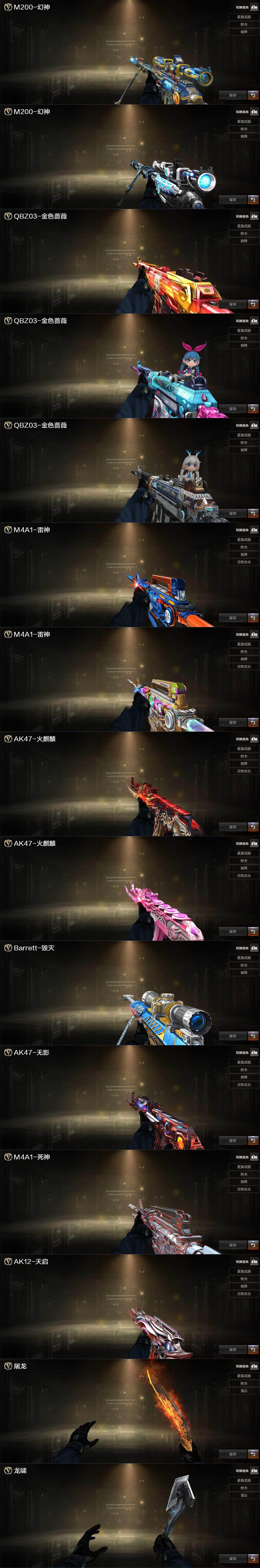 【热门武器】:传说破晓,QBZ03-金色蔷薇*2,M200-幻神,柯尔特-荣耀世冠白鲨2023,MK5-炽火炎龙,雷神-小红,COP-白鲨,COP 357-幻灵,沙鹰-修罗,炽芒蝶刃