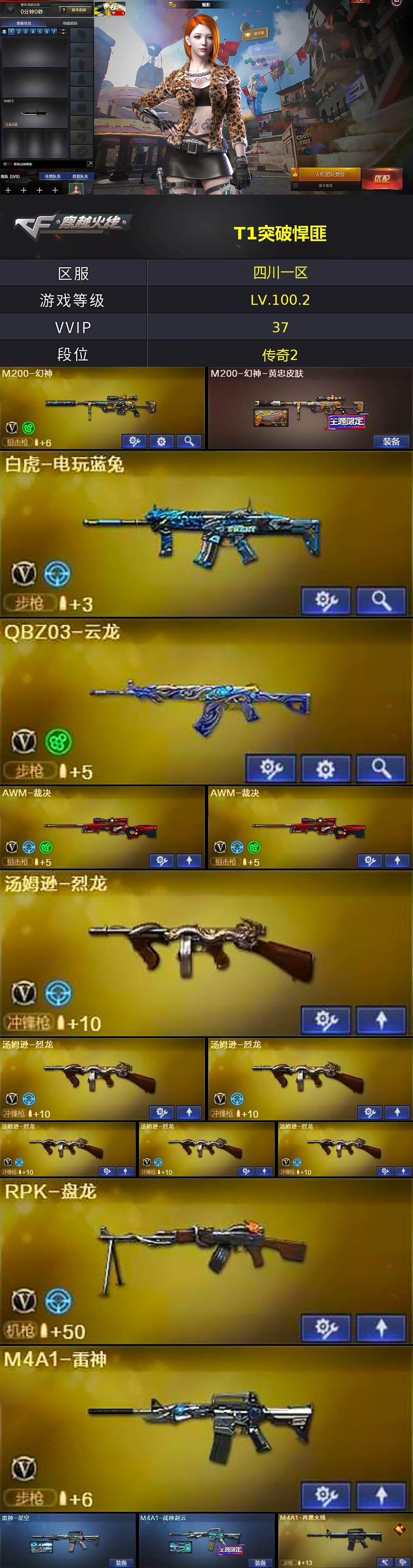 [14400031]四川一区-34V-0王者-0炫金 【热门武器】:M200-幻神,死亡之眼,白虎-电玩蓝兔,毒蜂,M4A1-黑骑士,汤姆逊-烈龙*6,RPK-盘龙,加特林-炼狱,沙鹰-修罗 【音效卡】:M4A1-黑骑士音效卡,Barrett-毁灭音效卡,炼狱-百战金芒-庆典舞曲音效卡 【皮肤】:M200-幻神-黄忠皮肤,雷神-星空,M4A1-战神赵云,M4A1-再燃火线,火麒麟-战神关羽,毁灭-战神张飞,黑骑士-战神马超,无影-暗月,天启-暗月,修罗-百战金芒 皮肤,轻型军用手斧-再燃火线 【角色】:魅影,奇洋探员,乔伊教练,初恋灵狐,芳心审判者,风暴女,嘉年华灵狐,娟娟,兰-海滩派对,猎狐者-追月,0号玩家,龙儿,兔囡囡,樱-缤纷夏日 【人偶武器】:AWM-灵狐-15周年嘉年华,迷你生化手雷,生化手雷-机甲核心 【暴走生化】:毒蜂,死亡之眼,超级对讲机 【挑战大师】:激光毁灭者III*2 【英雄级武器】:AK47-火麒麟,M4A1-雷神,M4A1-黑骑士,QBZ03-云龙,超新星-热带奇洋,白虎-电玩蓝兔,Barrett-毁灭,Barrett-极光,AWM-裁决*2,M200-幻神,Barrett-金色蔷薇*2,RPK-盘龙,加特林-炼狱,炼狱-百战金芒,汤姆逊-烈龙*6,沙鹰-修罗,屠龙,龙啸,擎天,麒麟刺,龙啸-热带奇洋,麒麟刺-百战金芒,高爆手雷-云龙,手雷-热带奇洋,闪光弹-云龙,烟雾弹-云龙 【道具】:BS战队炫彩背包,CFS限定背包,云山科技背包,奇洋探员-海龟背包,战舰背包,炫彩背包,热带奇洋炫彩背包,百战金芒炫彩背包,超级背包*2,迷你冰龙背包,女皇终结者-魔龙之吻,救世主-黑桃战神,绿色巨人,灵魂忍者,迷雾幽灵,生化弹匣,夺命之镰,防化服*3,星辰流光-枪王排位,枪王排位28赛季金色流光,语音特效-盛典烟火,萌萌小葵表情,热带奇洋表情,EP战队名片,EP战队喷图,EP战队击杀图标,C4-再燃火线,防弹头盔*3,防弹衣*3,C4工具钳*4,手雷包*3 【特殊枪械】:1黑骑士,6烈龙,1盘龙,1炼狱