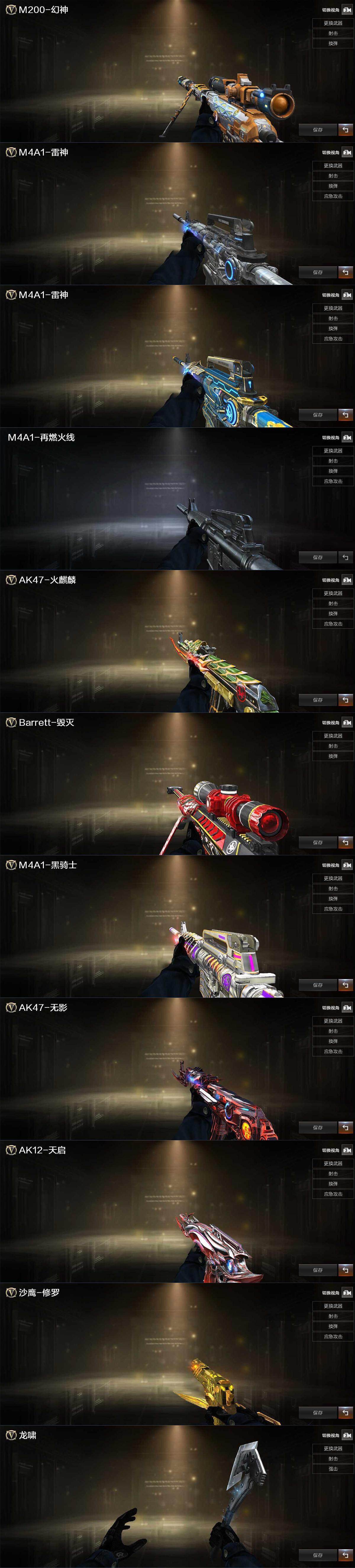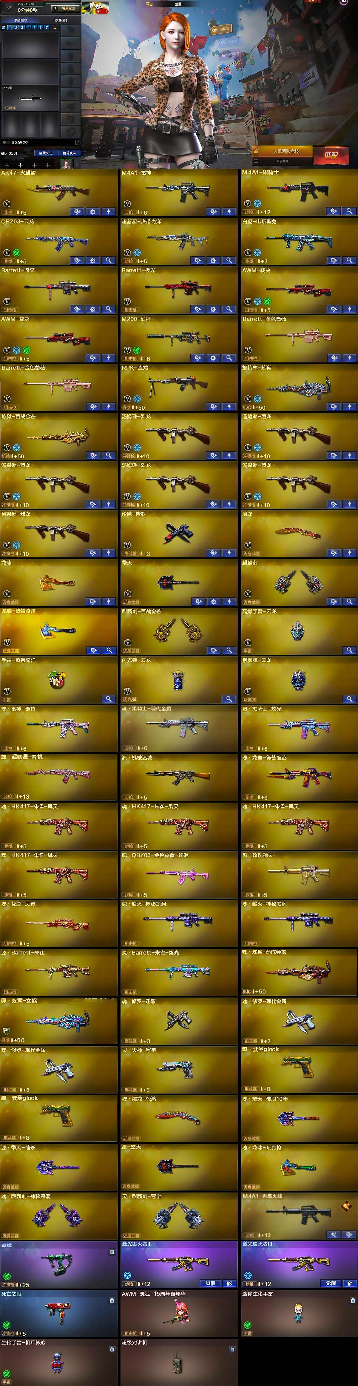 【英雄级武器】:AK47-火麒麟,M4A1-雷神,M4A1-黑骑士,QBZ03-云龙,超新星-热带奇洋,白虎-电玩蓝兔,Barrett-毁灭,Barrett-极光,AWM-裁决*2,M200-幻神,Barrett-金色蔷薇*2,RPK-盘龙,加特林-炼狱,炼狱-百战金芒,汤姆逊-烈龙*6,沙鹰-修罗,屠龙,龙啸,擎天,麒麟刺,龙啸-热带奇洋,麒麟刺-百战金芒,高爆手雷-云龙,手雷-热带奇洋,闪光弹-云龙,烟雾弹-云龙