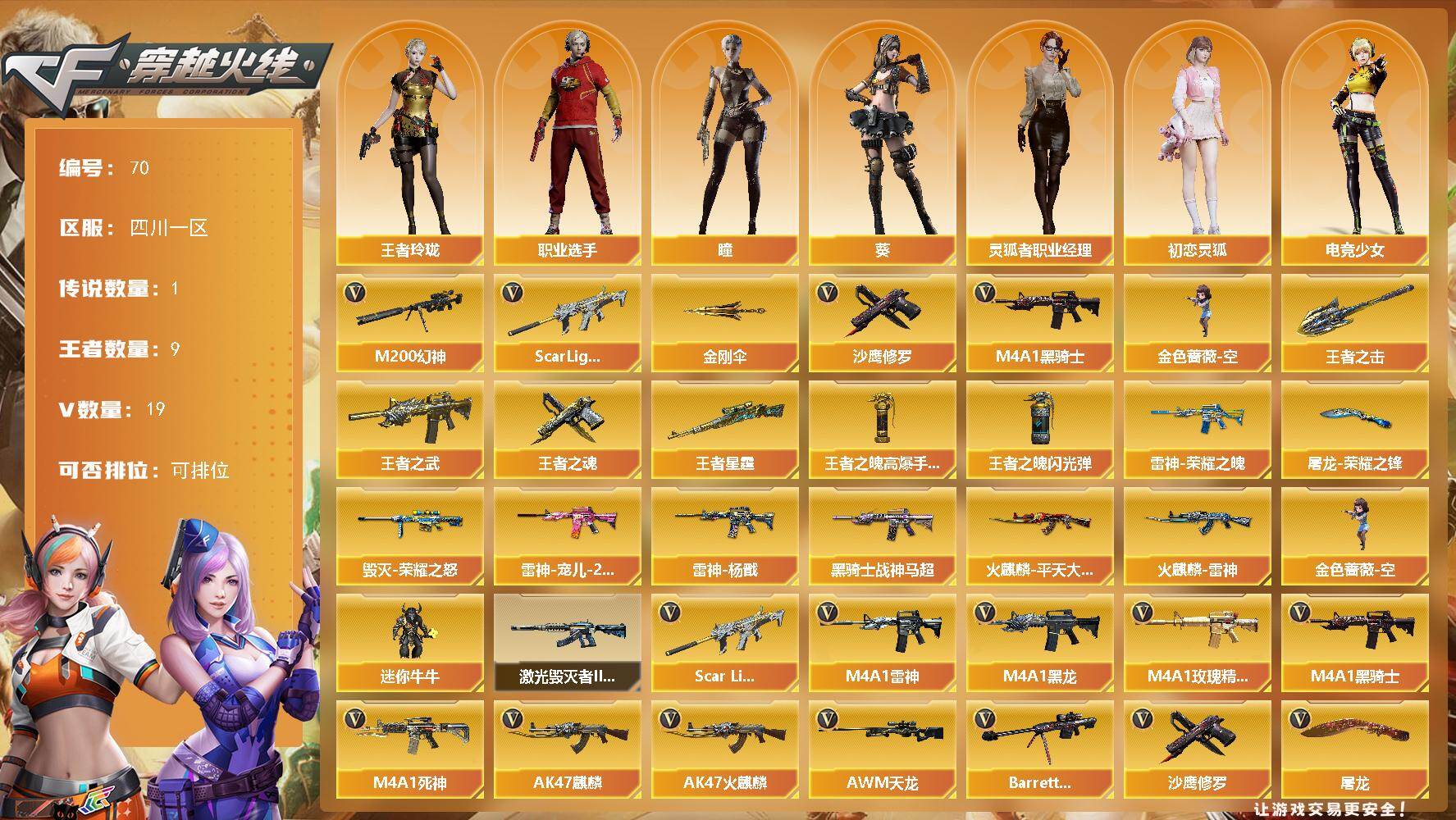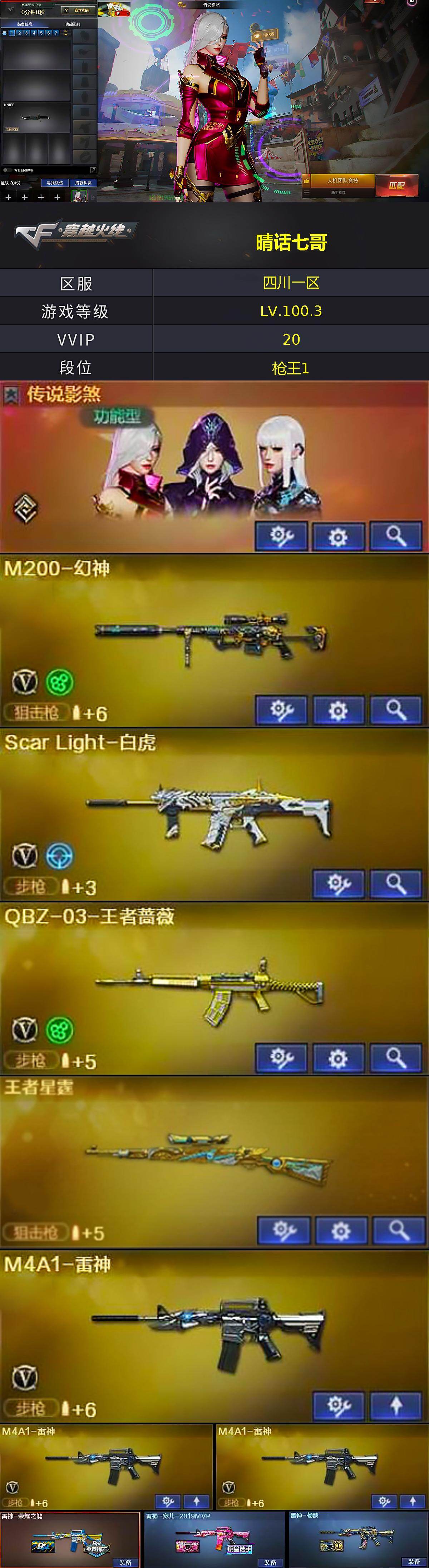 [14401083]四川一区-19V-9王者-0炫金 【传说角色】:传说影煞 【热门武器】:Scar Light-白虎,M200-幻神,M4A1-黑骑士,金色蔷薇-空,沙鹰-修罗*2,金刚伞 【王者炫金武器】:王者之武,王者星霆,王者之魂,王者之击,王者之魄高爆手雷,王者之魄闪光弹 【皮肤】:雷神-荣耀之魄,雷神-宠儿-2019MVP,雷神-杨戬,火麒麟-雷神,火麒麟-平天大圣,毁灭-荣耀之怒,黑骑士-战神马超,屠龙-荣耀之锋 【角色】:葵,瞳,王者玲珑,初恋灵狐,电竞少女,飞虎队-X,嘉年华灵狐,灵狐者-职业经理,龙儿,游珑儿,职业选手 【人偶武器】:金色蔷薇-空,迷你牛牛 【挑战大师】:激光毁灭者III-白马银枪 【英雄级武器】:AK47-火麒麟,AK47-麒麟,M4A1-黑龙,M4A1-雷神*3,M4A1-黑骑士,M4A1-死神,Scar Light-白虎,M4A1-玫瑰精灵,王者火魄-觉醒版,QBZ-03-王者蔷薇-觉醒版,AWM-天龙,Barrett-毁灭,M200-幻神,沙鹰-修罗*2,屠龙 【道具】:CFS限定背包,战舰背包,黄金超能特工背包,绿色巨人,夺命之镰,防化服*2,金色流光-枪王排位*2,星辰流光-枪王排位,枪王排位28赛季金色流光,枪王排位29赛季金色流光,防弹头盔*4,防弹衣*4,C4工具钳*4,手雷包*4 【特殊枪械】:1白虎,1黑骑士