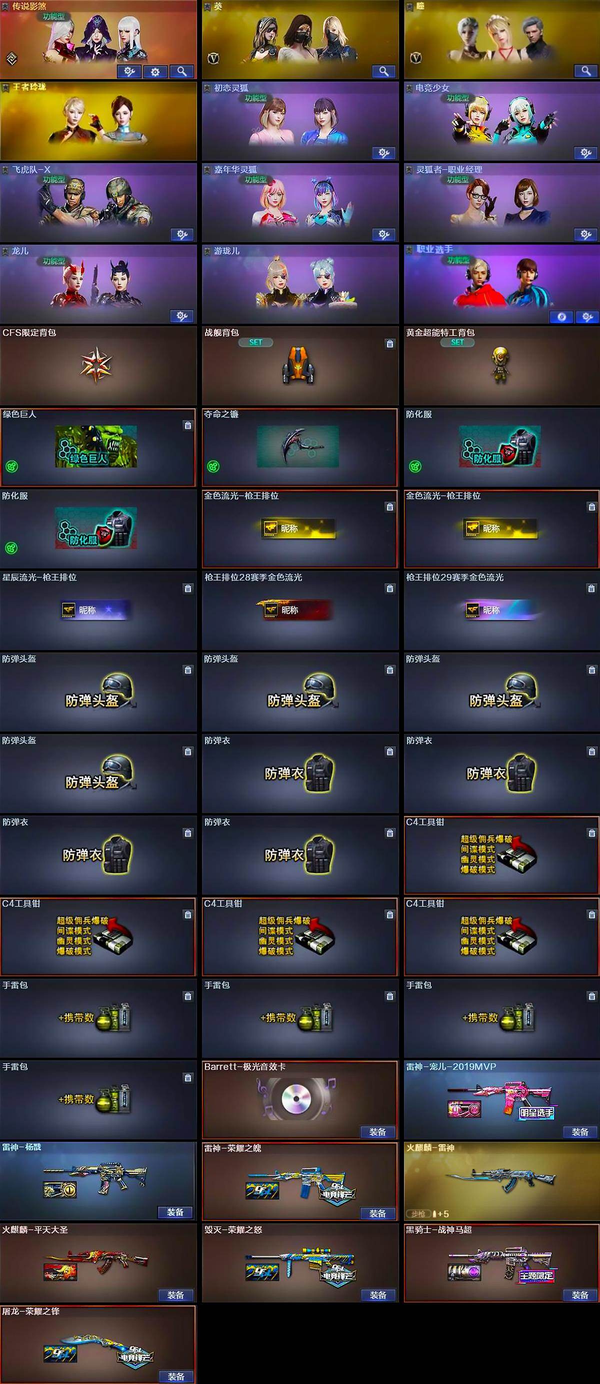 【道具】:CFS限定背包,战舰背包,黄金超能特工背包,绿色巨人,夺命之镰,防化服*2,金色流光-枪王排位*2,星辰流光-枪王排位,枪王排位28赛季金色流光,枪王排位29赛季金色流光,防弹头盔*4,防弹衣*4,C4工具钳*4,手雷包*4