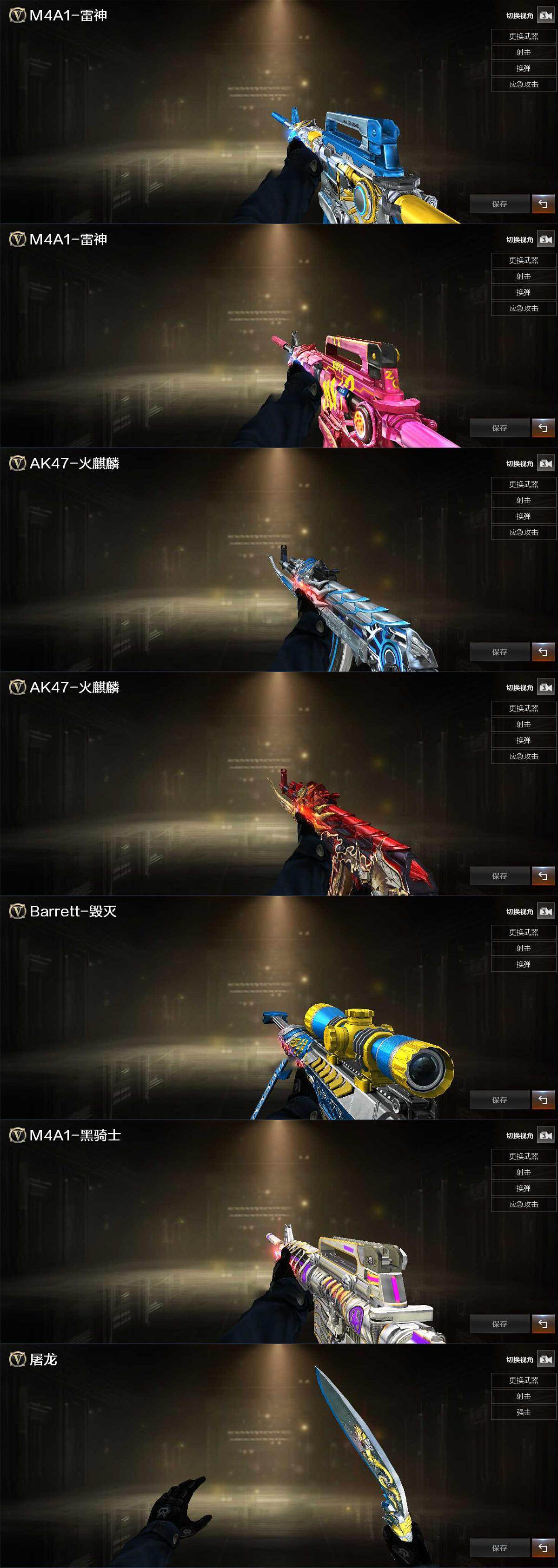 【英雄级武器】:AK47-火麒麟,AK47-麒麟,M4A1-黑龙,M4A1-雷神*3,M4A1-黑骑士,M4A1-死神,Scar Light-白虎,M4A1-玫瑰精灵,王者火魄-觉醒版,QBZ-03-王者蔷薇-觉醒版,AWM-天龙,Barrett-毁灭,M200-幻神,沙鹰-修罗*2,屠龙