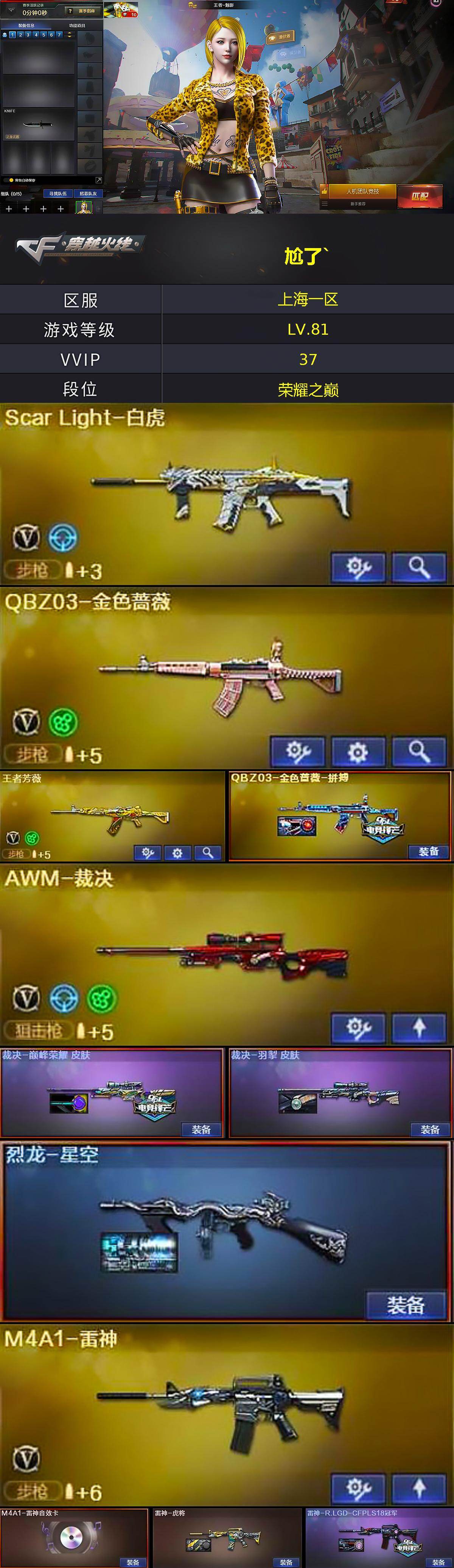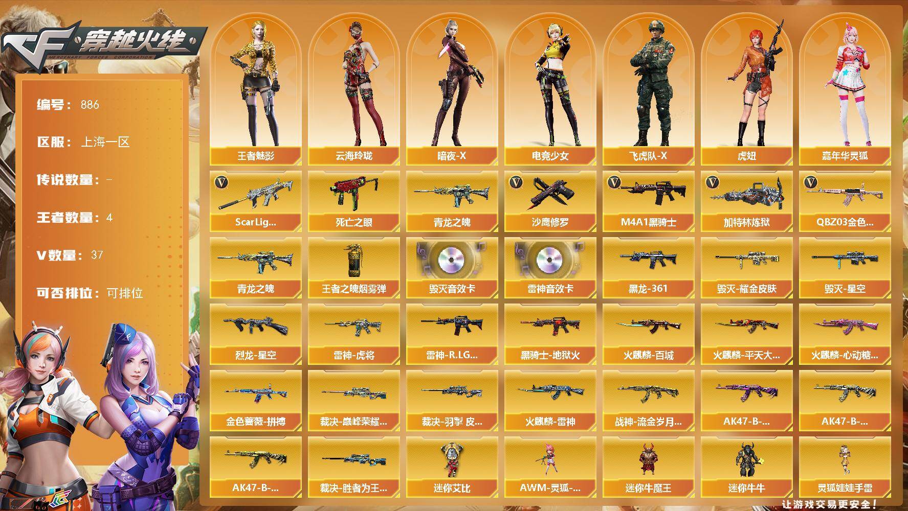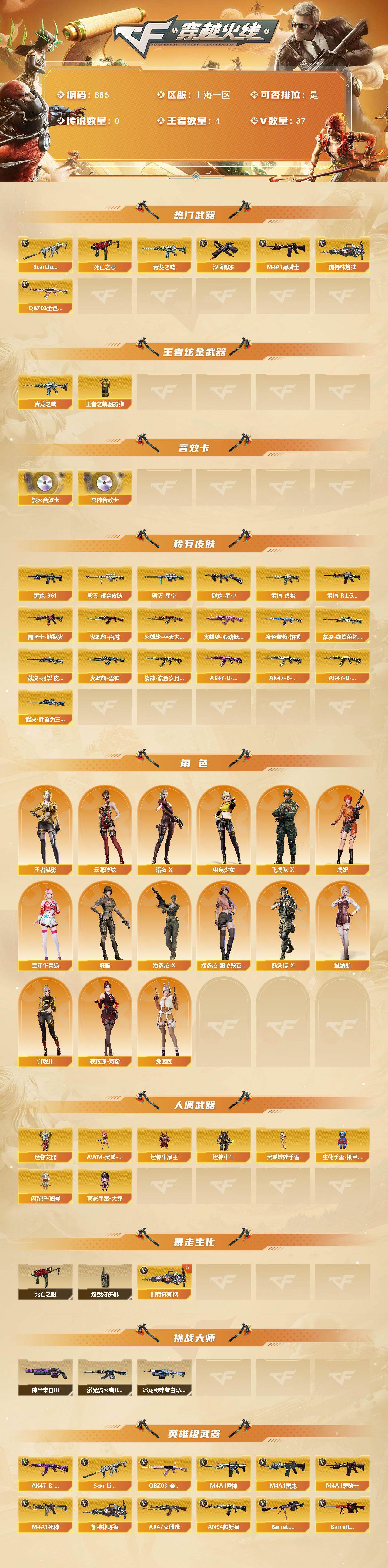 [14410944]上海一区-37V-4王者-0炫金 【热门武器】:QBZ03-金色蔷薇,Scar Light-白虎,死亡之眼,青龙之魄,M4A1-黑骑士*3,加特林-炼狱*5,沙鹰-修罗*4 【王者炫金武器】:青龙之魄,王者之魄烟雾弹 【音效卡】:M4A1-雷神音效卡,Barrett-毁灭音效卡 【皮肤】:QBZ03-金色蔷薇-拼搏,裁决-巅峰荣耀 皮肤,裁决-羽掣 皮肤,裁决-胜者为王 皮肤,烈龙-星空,雷神-虎将,雷神-R.LGD-CFPLS18冠军,火麒麟-雷神,火麒麟-平天大圣,火麒麟-百城,火麒麟-心动糖果,毁灭耀金皮肤,毁灭-星空,M4A1-黑龙-361,黑骑士-地狱火,战神-流金岁月皮肤,AK47-B-常胜将军-曹操,AK47-B-常胜将军-刘备,AK47-B-常胜将军-孙权 【角色】:王者-魅影,云海玲珑,暗夜-X,电竞少女,飞虎队-X,虎妞,嘉年华灵狐,麻雀,潘多拉-X,潘多拉-甜心教官,斯沃特-X,兔囡囡,维纳斯,夜玫瑰-宠粉,游珑儿 【人偶武器】:AWM-灵狐-15周年嘉年华,迷你牛魔王,迷你牛牛,生化手雷-机甲核心,闪光弹-貂蝉,高爆手雷-大乔,迷你艾比,灵狐娃娃手雷 【暴走生化】:死亡之眼,超级对讲机 【挑战大师】:冰龙粉碎者-白马银枪,激光毁灭者III-白马银枪,神圣爆裂者-末日III 【英雄级武器】:AK47-火麒麟,M4A1-黑龙,M4A1-雷神,M4A1-黑骑士*3,M4A1-死神,AN94-超新星*2,Scar Light-白虎,无影-神兵利器,黑武士-锦绣游龙,QBZ03-金色蔷薇,AK-47-猩红传说,AK47-B-常胜将军,王者芳薇-觉醒版,Barrett-毁灭,Barrett-极光,AWM-裁决,加特林-炼狱*5,沙鹰-修罗*4,沙鹰-天神,屠龙*2,擎天,麒麟刺,高爆手雷-云龙 【道具】:CFS限定背包,云山科技背包,亚洲杯纪念炫彩背包,冰冰企鹅背包,背包-洛丽塔,超级背包,女皇终结者-魔龙之吻,救世主-黑桃战神,绿色巨人,灵魂忍者*2,变异宝贝,迷雾幽灵*2,生化弹匣,夺命之镰,防化服*3,金色流光-枪王排位*2,星辰流光-枪王排位,枪王排位28赛季金色流光,枪王排位29赛季金色流光,语音特效-机器人,动感闪耀表情,云海游龙表情,EP战队击杀图标,C4-红龙,防弹头盔*3,防弹衣*3,C4工具钳*3,手雷包*3 【特殊枪械】:1白虎,