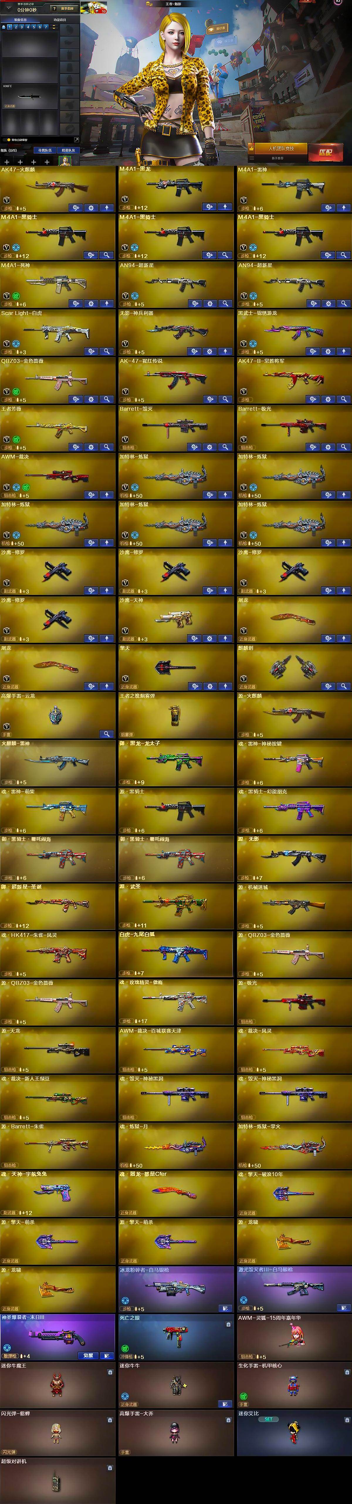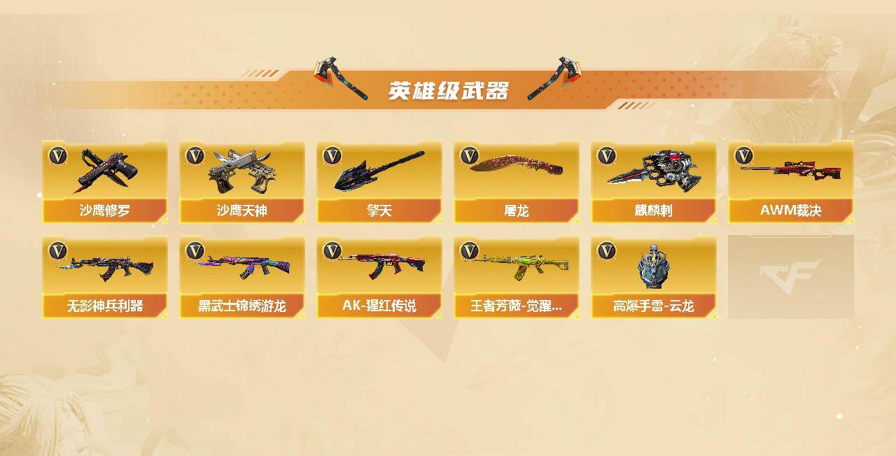 【英雄级武器】:AK47-火麒麟,M4A1-黑龙,M4A1-雷神,M4A1-黑骑士*3,M4A1-死神,AN94-超新星*2,Scar Light-白虎,无影-神兵利器,黑武士-锦绣游龙,QBZ03-金色蔷薇,AK-47-猩红传说,AK47-B-常胜将军,王者芳薇-觉醒版,Barrett-毁灭,Barrett-极光,AWM-裁决,加特林-炼狱*5,沙鹰-修罗*4,沙鹰-天神,屠龙*2,擎天,麒麟刺,高爆手雷-云龙