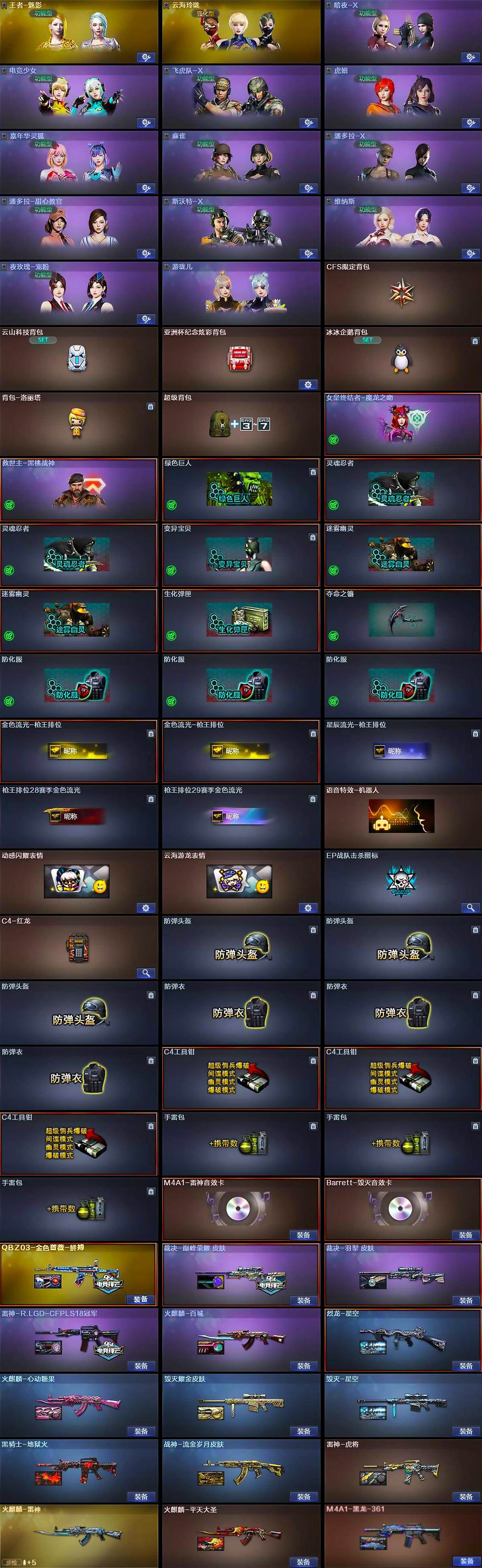 【道具】:CFS限定背包,云山科技背包,亚洲杯纪念炫彩背包,冰冰企鹅背包,背包-洛丽塔,超级背包,女皇终结者-魔龙之吻,救世主-黑桃战神,绿色巨人,灵魂忍者*2,变异宝贝,迷雾幽灵*2,生化弹匣,夺命之镰,防化服*3,金色流光-枪王排位*2,星辰流光-枪王排位,枪王排位28赛季金色流光,枪王排位29赛季金色流光,语音特效-机器人,动感闪耀表情,云海游龙表情,EP战队击杀图标,C4-红龙,防弹头盔*3,防弹衣*3,C4工具钳*3,手雷包*3