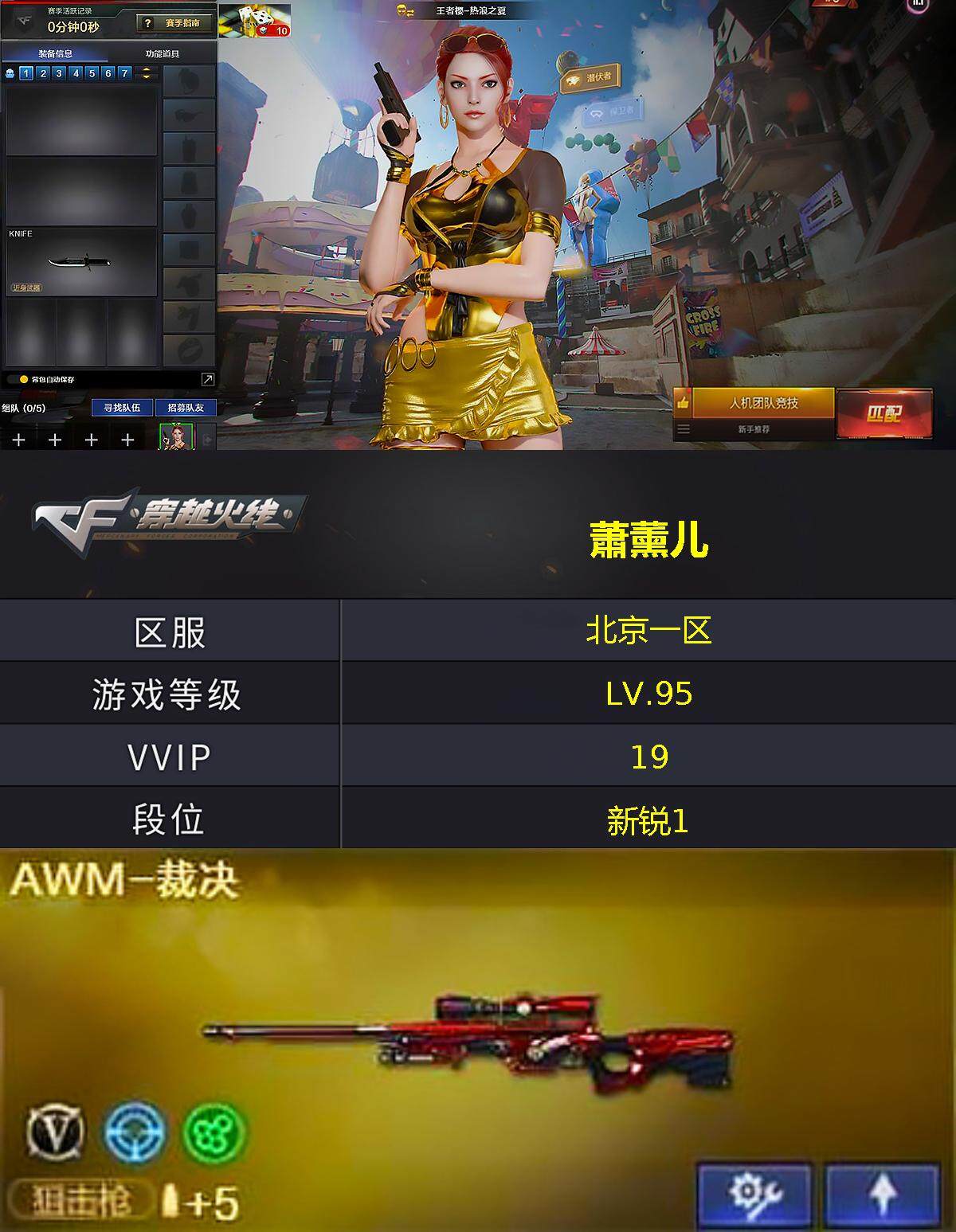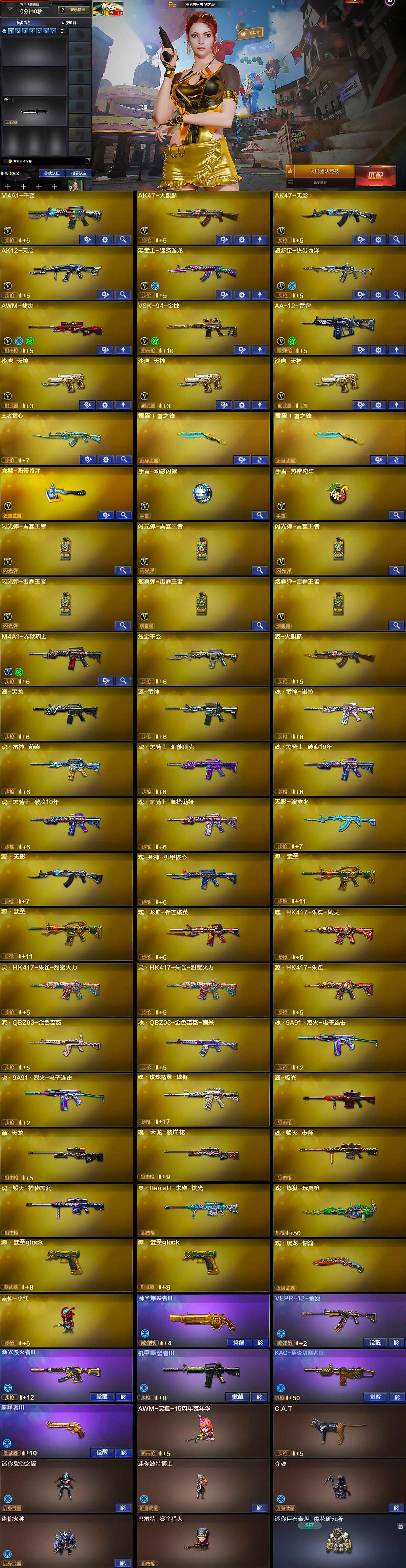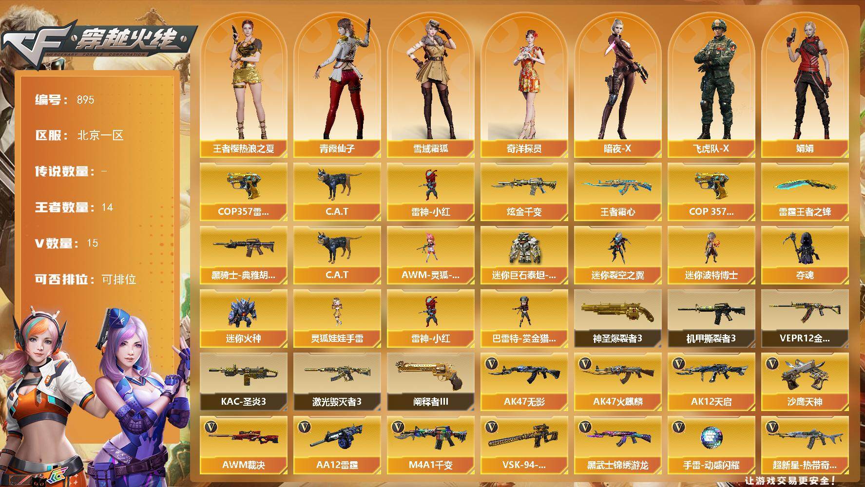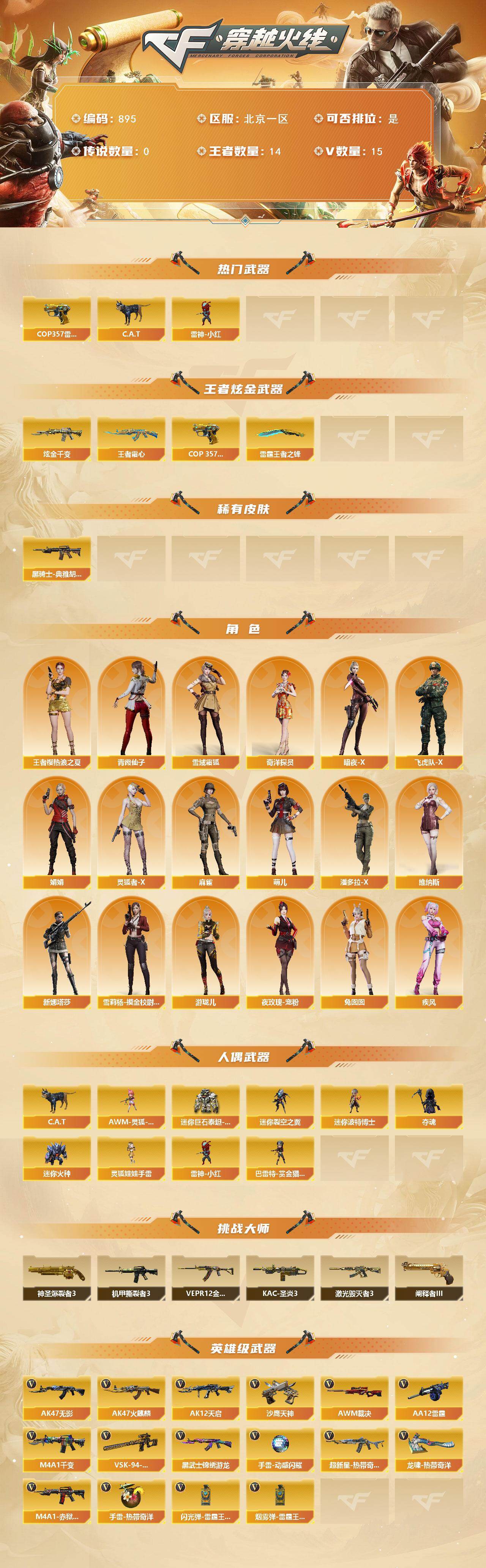 [14415192]北京一区-15V-14王者-1炫金 【热门武器】:C.A.T,雷神-小红,COP 357-雷霆王者 【王者炫金武器】:王者霜心,COP 357-雷霆王者,雷霆王者之锋*2,炫金千变 【皮肤】:黑骑士-典雅胡桃 皮肤 【角色】:王者樱-热浪之夏,雪域霜狐,奇洋探员,暗夜-X,飞虎队-X,疾风,娟娟,灵狐者-X,麻雀,萌儿,潘多拉-X,青霞仙子,兔囡囡,维纳斯,新娜塔莎,雪莉杨-摸金校尉,夜玫瑰-宠粉,游珑儿 【人偶武器】:雷神-小红,AWM-灵狐-15周年嘉年华,C.A.T,迷你裂空之翼,迷你波特博士,夺魂,迷你火种,巴雷特-赏金猎人,迷你巨石泰坦-魔花研究所,灵狐娃娃手雷 【挑战大师】:神圣爆裂者III,VEPR-12-金魔,激光毁灭者III,机甲撕裂者III,KAC-圣炎切割者III,阐释者III 【英雄级武器】:M4A1-千变,AK47-火麒麟,AK47-无影,AK12-天启,黑武士-锦绣游龙,超新星-热带奇洋,AWM-裁决,VSK-94-金蚀,AA-12-雷霆,沙鹰-天神*3,龙啸-热带奇洋,手雷-动感闪耀,手雷-热带奇洋,闪光弹-雷霆王者-觉醒版*4,烟雾弹-雷霆王者-觉醒版*2,M4A1-赤狱骑士 【道具】:亚洲杯纪念炫彩背包,奇洋探员-海龟背包,热带奇洋炫彩背包,超级背包,救世主-黑桃战神,黄金生化钩,绿色巨人,灵魂忍者*2,变异宝贝,迷雾幽灵*2,生化弹匣,夺命之镰,防化服*2,流光-再燃火线,枪王排位28赛季金色流光,枪王排位29赛季金色流光,语音特效-热带奇洋,热带奇洋表情,防弹头盔*2,防弹衣*2,C4工具钳*2,手雷包*2 【特殊枪械】:
