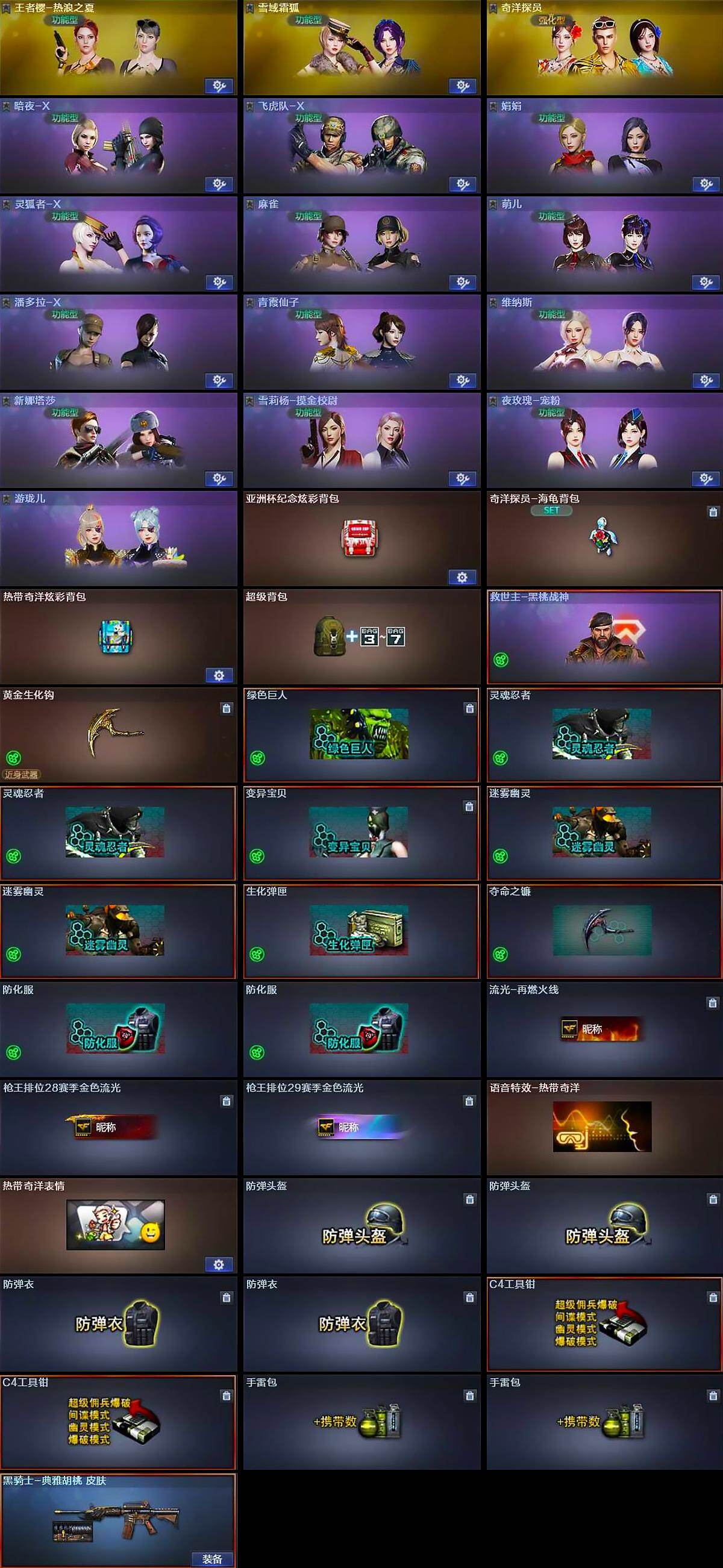 【道具】:亚洲杯纪念炫彩背包,奇洋探员-海龟背包,热带奇洋炫彩背包,超级背包,救世主-黑桃战神,黄金生化钩,绿色巨人,灵魂忍者*2,变异宝贝,迷雾幽灵*2,生化弹匣,夺命之镰,防化服*2,流光-再燃火线,枪王排位28赛季金色流光,枪王排位29赛季金色流光,语音特效-热带奇洋,热带奇洋表情,防弹头盔*2,防弹衣*2,C4工具钳*2,手雷包*2