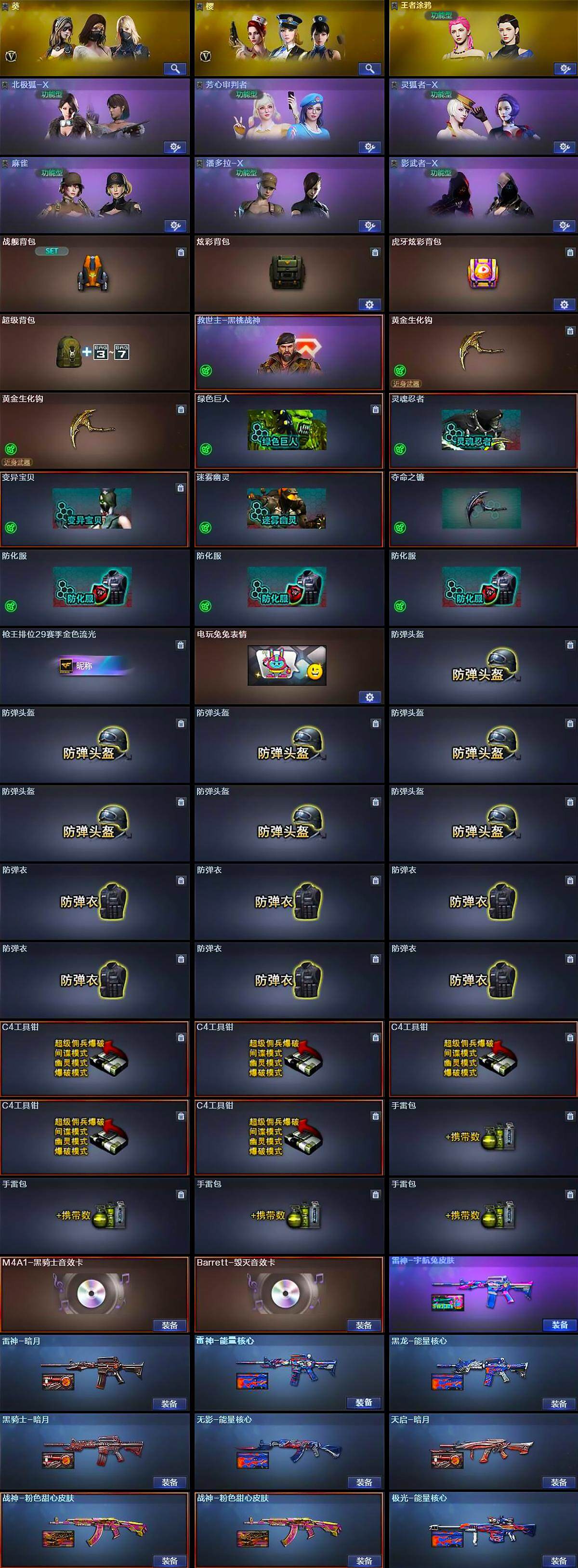 【道具】:战舰背包,炫彩背包,虎牙炫彩背包,超级背包,救世主-黑桃战神,黄金生化钩*2,绿色巨人,灵魂忍者,变异宝贝,迷雾幽灵,夺命之镰,防化服*3,枪王排位29赛季金色流光,电玩兔兔表情,防弹头盔*7,防弹衣*6,C4工具钳*5,手雷包*4