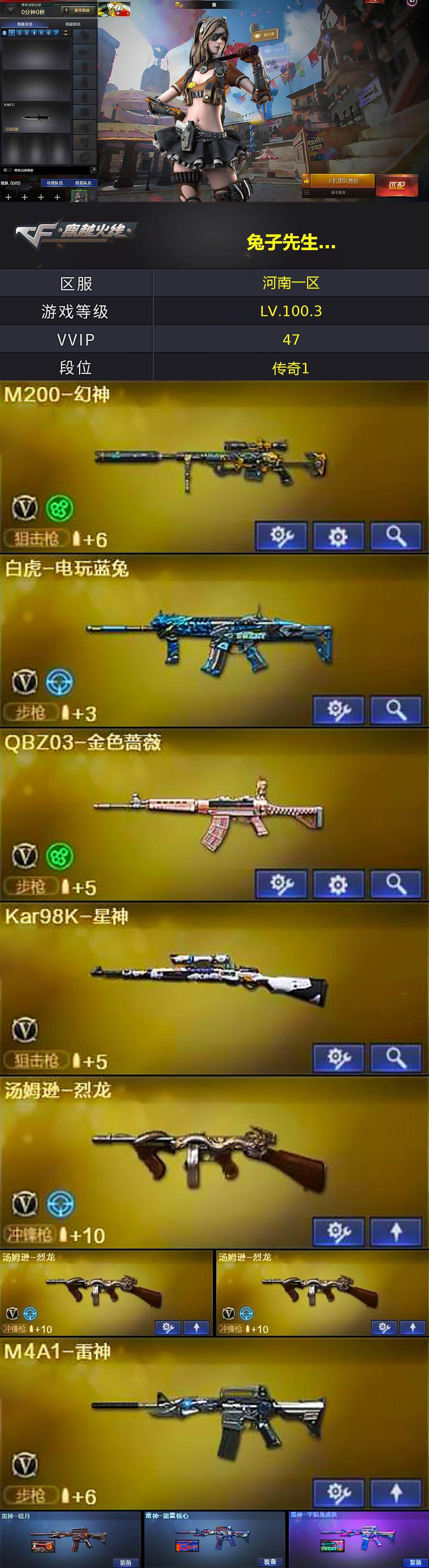【热门武器】:QBZ03-金色蔷薇,M200-幻神,死亡之眼,白虎-电玩蓝兔,Kar98K-星神,M4A1-黑骑士,汤姆逊-烈龙*3,加特林-炼狱*7,沙鹰-修罗*2