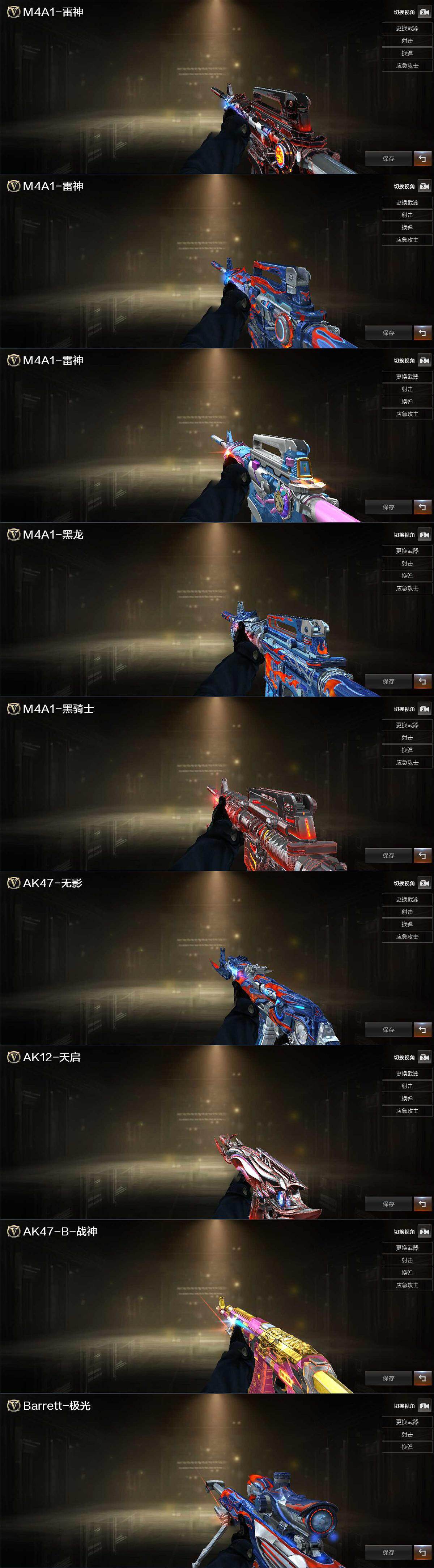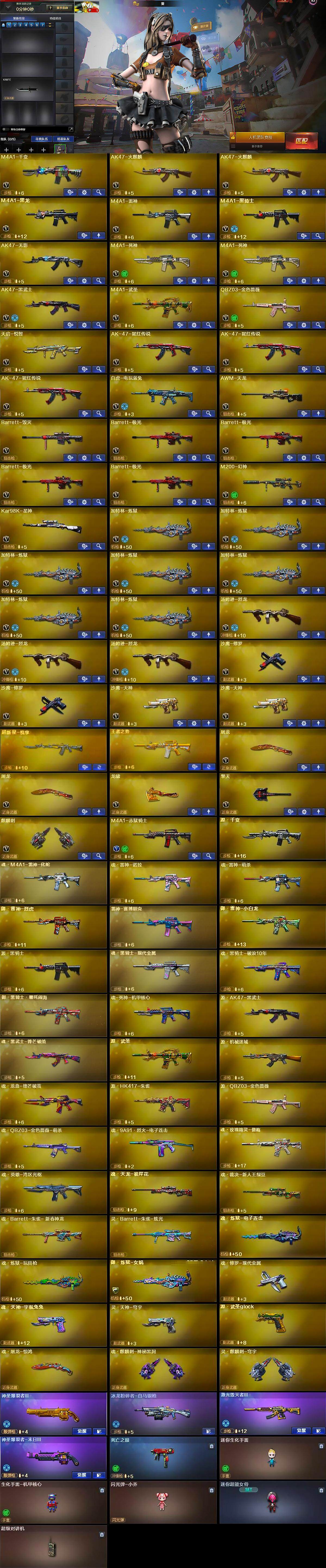 【英雄级武器】:M4A1-千变,AK47-火麒麟*2,M4A1-黑龙,M4A1-雷神,M4A1-黑骑士,AK47-无影,M4A1-死神*2,AK47-黑武士,M4A1-武圣,QBZ03-金色蔷薇,天启-悦智-觉醒版,AK-47-猩红传说*3,白虎-电玩蓝兔,AWM-天龙,Barrett-毁灭,Barrett-极光*4,M200-幻神,Kar98K-星神,加特林-炼狱*7,汤姆逊-烈龙*3,沙鹰-修罗*2,沙鹰-天神*2,屠龙*2,龙啸,擎天,麒麟刺,M4A1-赤狱骑士