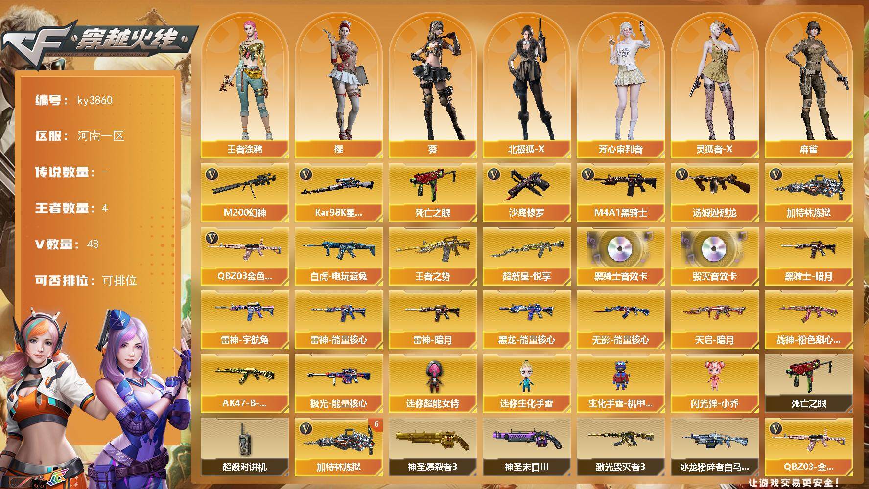 [14417019]河南一区-48V-4王者-0炫金 【热门武器】:QBZ03-金色蔷薇,M200-幻神,死亡之眼,白虎-电玩蓝兔,Kar98K-星神,M4A1-黑骑士,汤姆逊-烈龙*3,加特林-炼狱*7,沙鹰-修罗*2 【王者炫金武器】:超新星-悦享,王者之势 【音效卡】:M4A1-黑骑士音效卡,Barrett-毁灭音效卡 【皮肤】:雷神-暗月,雷神-能量核心,雷神-宇航兔皮肤,黑龙-能量核心,黑骑士-暗月,无影-能量核心,天启-暗月,战神-粉色甜心皮肤*2,AK47-B-常胜将军-孙权,极光-能量核心 【角色】:葵,樱,王者涂鸦,北极狐-X,芳心审判者,灵狐者-X,麻雀,潘多拉-X,兔囡囡,影武者-X 【人偶武器】:迷你生化手雷,生化手雷-机甲核心,闪光弹-小乔,迷你超能女侍 【暴走生化】:死亡之眼,超级对讲机 【挑战大师】:神圣爆裂者III,冰龙粉碎者-白马银枪,激光毁灭者III,神圣爆裂者-末日III 【英雄级武器】:M4A1-千变,AK47-火麒麟*2,M4A1-黑龙,M4A1-雷神,M4A1-黑骑士,AK47-无影,M4A1-死神*2,AK47-黑武士,M4A1-武圣,QBZ03-金色蔷薇,天启-悦智-觉醒版,AK-47-猩红传说*3,白虎-电玩蓝兔,AWM-天龙,Barrett-毁灭,Barrett-极光*4,M200-幻神,Kar98K-星神,加特林-炼狱*7,汤姆逊-烈龙*3,沙鹰-修罗*2,沙鹰-天神*2,屠龙*2,龙啸,擎天,麒麟刺,M4A1-赤狱骑士 【道具】:战舰背包,炫彩背包,虎牙炫彩背包,超级背包,救世主-黑桃战神,黄金生化钩*2,绿色巨人,灵魂忍者,变异宝贝,迷雾幽灵,夺命之镰,防化服*3,枪王排位29赛季金色流光,电玩兔兔表情,防弹头盔*7,防弹衣*6,C4工具钳*5,手雷包*4 【特殊枪械】:1黑骑士,3烈龙,6炼狱