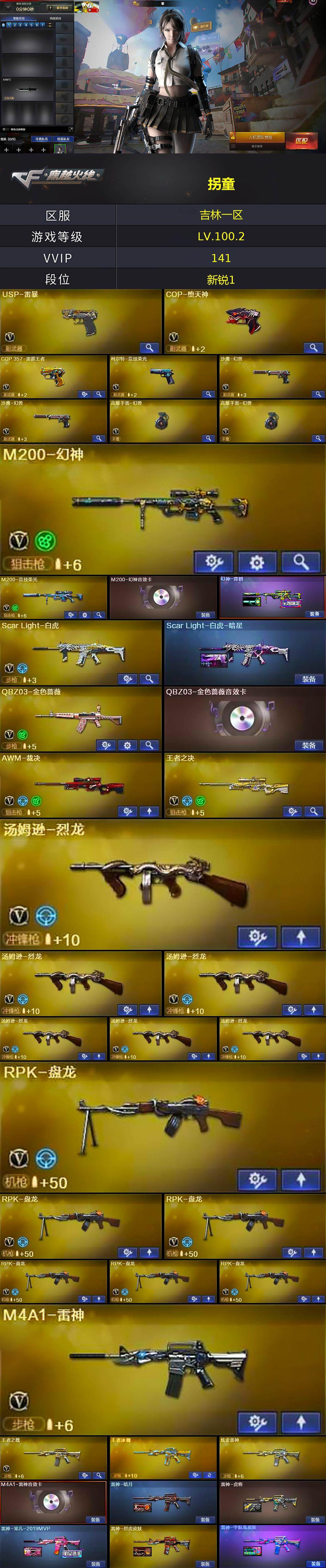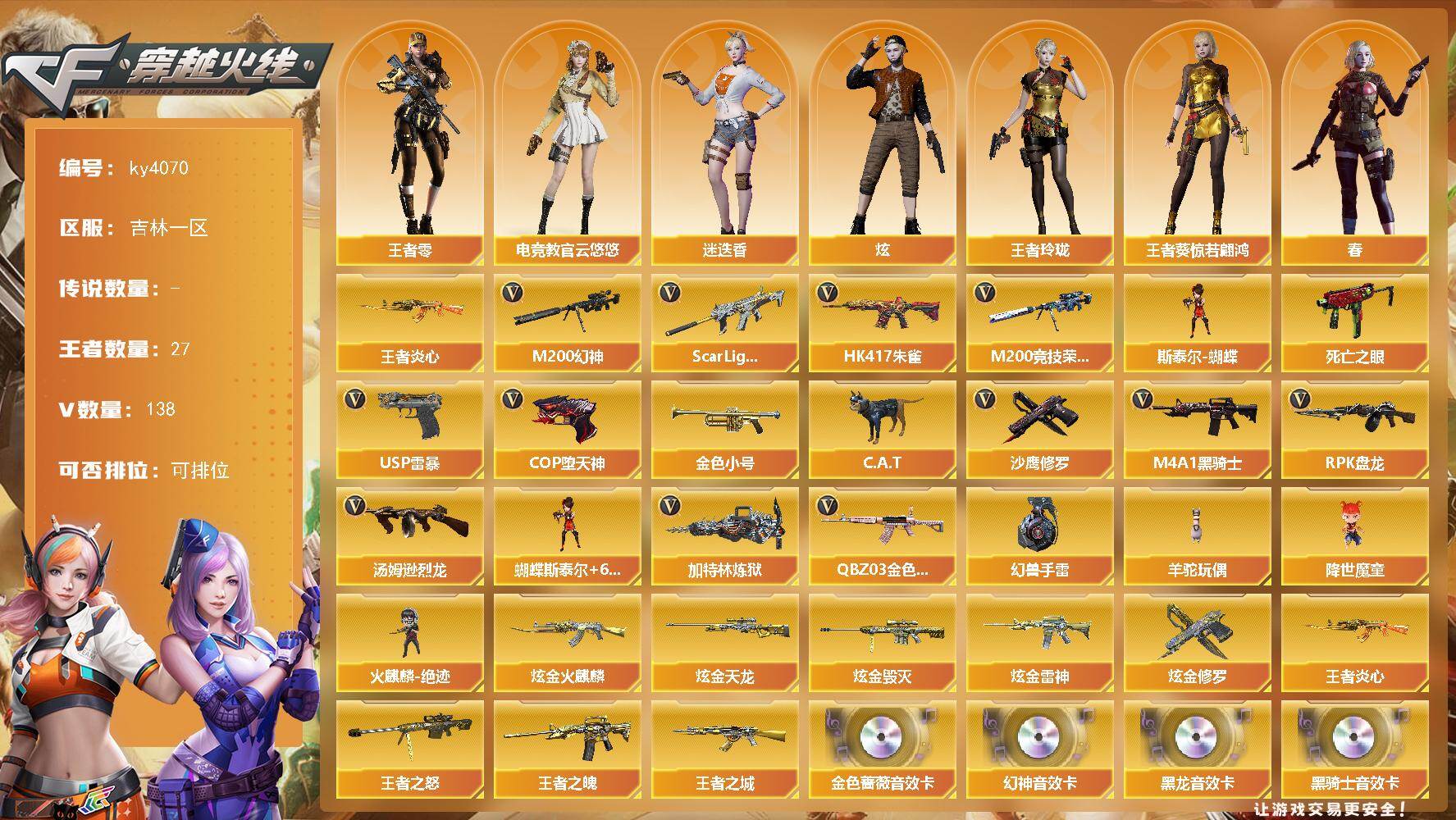 [14417260]吉林一区-138V-27王者-6炫金 【热门武器】:QBZ03-金色蔷薇,Scar Light-白虎,HK417-朱雀,M200-幻神,M200-竞技荣光,死亡之眼,王者炎心,金色小号,C.A.T,M4A1-黑骑士*2,汤姆逊-烈龙*6,RPK-盘龙*6,加特林-炼狱*3,斯泰尔-蝴蝶,羊驼玩偶*2,降世魔童,火麒麟-绝迹,USP-雷暴,COP-堕天神,沙鹰-修罗*7,高爆手雷-幻兽*2 【王者炫金武器】:王者之城,王者炎心,王者之魄,王者之怒,炫金火麒麟,炫金雷神,炫金毁灭,炫金天龙,炫金修罗*2 【音效卡】:M200-幻神音效卡,AK47-火麒麟音效卡*2,M4A1-雷神音效卡,M4A1-黑龙音效卡,M4A1-黑骑士音效卡,Barrett-毁灭音效卡,QBZ03-金色蔷薇音效卡 【皮肤】:幻神-青鹤,Scar Light-白虎-暗星,雷神-暗月,雷神-虎将,雷神-宠儿-2019MVP,雷神-烈虎皮肤,雷神-宇航兔皮肤,火麒麟-雷神,火麒麟-华夏之心,AK47-火麒麟-传奇EVEN,火麒麟-轻羽皮肤,火麒麟-平天大圣,火麒麟-盘古,火麒麟-百城,毁灭-暗月*5,毁灭耀金皮肤,毁灭-星空,毁灭-冠军之怒,毁灭-BEAN-2020MVP,毁灭-黑大圣皮肤,M4A1-千变-孔明皮肤,黑龙-能量核心,M4A1-黑龙-361,黑龙-墨子皮肤,黑骑士-暗月*2,黑骑士耀金皮肤,无影-暗月*5,无影-能量核心*3,死神-秘银,天启-暗月*5,战神-粉色甜心皮肤,战神-紫绶金章皮肤,战神-流金岁月皮肤,天龙-秘银,AWM-天龙-传奇70KG,AWM-天龙-传奇白鲨,极光-能量核心*3,炼狱-星空,修罗-能量核心*6,修罗耀金皮肤,天神-暗月*2,屠龙-荣耀之锋*2,擎天-秘银 【角色】:零,葵,樱,魅影,炫,春,迷迭香,电竞教官-云悠悠,机械姬,王者葵-惊若翩鸿,王者-零,王者玲珑,奇洋探员,暗夜-X,初恋灵狐,电竞少女,芳心审判者,嘉年华灵狐,娟娟,葵-赛博朋克,猎狐者-追月,灵狐者-黄金海岸,流浪蔷薇,麻雀,潘多拉-X,潜龙队-X,蜀雪,铁骑-乘风破浪,兔囡囡,维纳斯,新灵狐者,新娜塔莎,雪莉杨,影武者-X,雅典娜 【人偶武器】:火麒麟-绝迹,M4A1-雷神-精英刀锋,斯泰尔-蝴蝶,巴雷特-零-水下丽影,AWM-灵狐-15周年嘉年华*2,M37-葵,COP-旗袍,C.A.T