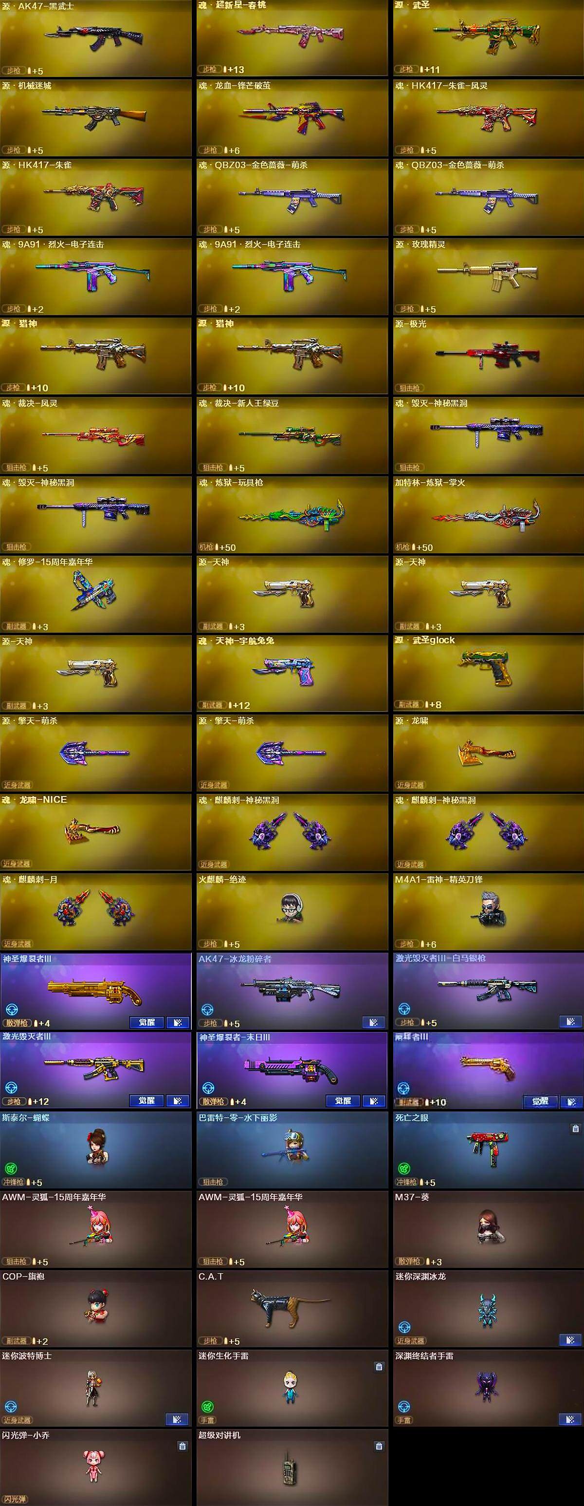 【人偶武器】:火麒麟-绝迹,M4A1-雷神-精英刀锋,斯泰尔-蝴蝶,巴雷特-零-水下丽影,AWM-灵狐-15周年嘉年华*2,M37-葵,COP-旗袍,C.A.T