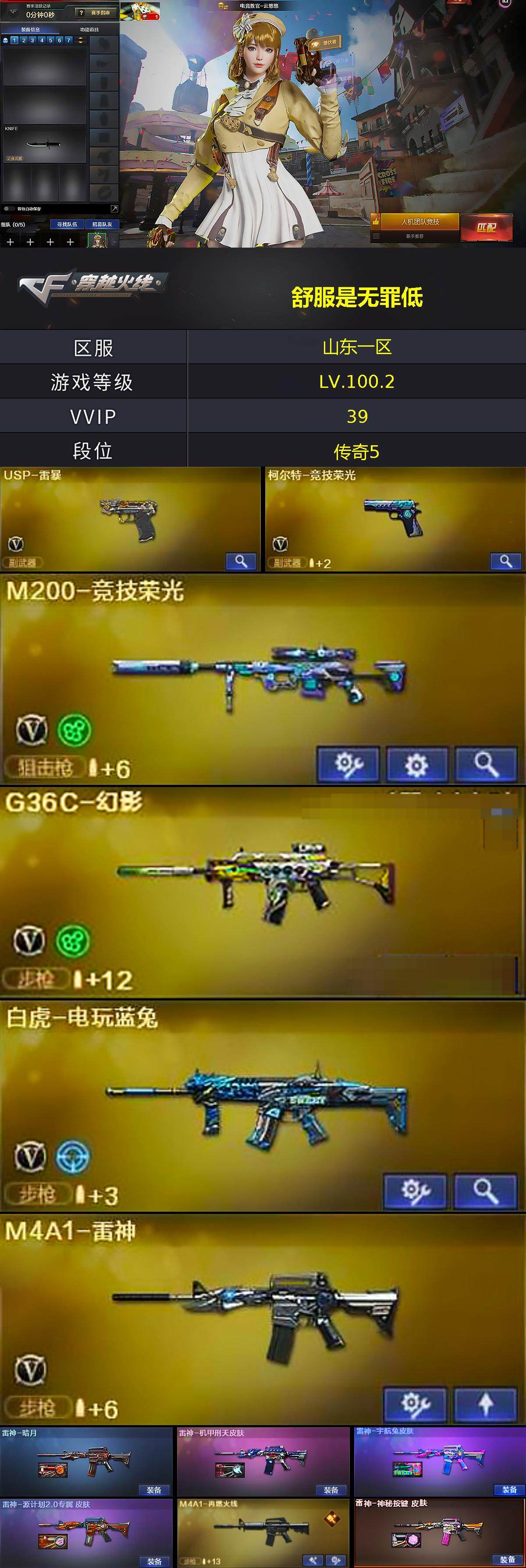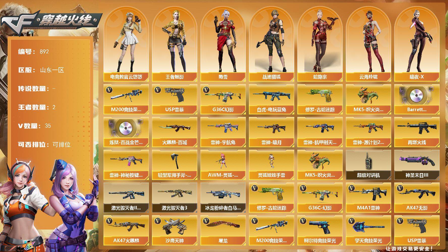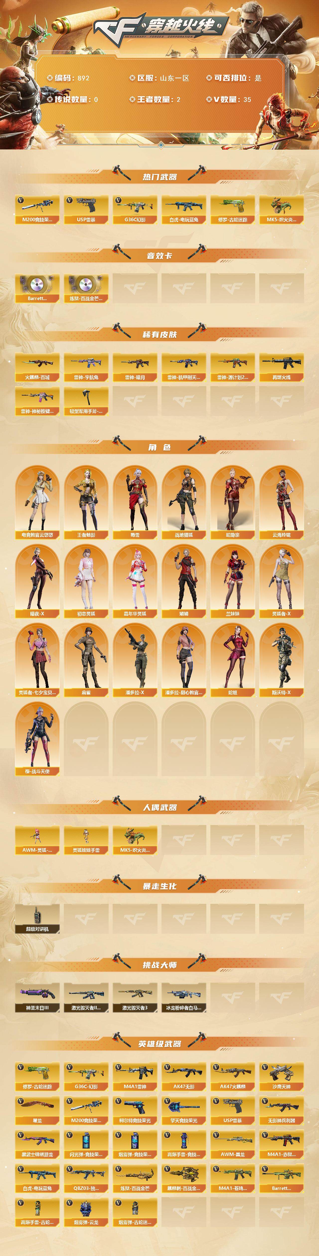 [14418048]山东一区-35V-2王者-0炫金 【热门武器】:G36C-幻影,修罗-古蛇迷踪,M200-竞技荣光,白虎-电玩蓝兔,MK5-炽火炎龙,USP-雷暴 【音效卡】:Barrett-碧霄极光音效卡,炼狱-百战金芒-庆典舞曲音效卡 【皮肤】:雷神-暗月,雷神-机甲刑天皮肤,雷神-宇航兔皮肤,雷神-源计划2.0专属 皮肤,M4A1-再燃火线,雷神-神秘按键 皮肤,火麒麟-百城,轻型军用手斧-再燃火线 【角色】:电竞教官-云悠悠,战地猎狐,王者-魅影,蛇隐宗,云海玲珑,暗夜-X,初恋灵狐,嘉年华灵狐,娟娟,兰妹妹,灵狐者-X,灵狐者-七夕宝贝,麻雀,潘多拉-X,潘多拉-甜心教官,蛇姬,斯沃特-X,蜀雪,樱-战斗天使 【人偶武器】:MK5-炽火炎龙,AWM-灵狐-15周年嘉年华*2,灵狐娃娃手雷 【暴走生化】:超级对讲机 【挑战大师】:冰龙粉碎者-白马银枪,激光毁灭者III-白马银枪,激光毁灭者III,神圣爆裂者-末日III 【英雄级武器】:AK47-火麒麟,M4A1-雷神,AK47-无影,无影-神兵利器,G36C-幻影,黑武士-锦绣游龙,QBZ03-独角-III,白虎-电玩蓝兔,M200-竞技荣光,炼狱-百战金芒,沙鹰-天神,USP-雷暴,柯尔特-竞技荣光,修罗-古蛇迷踪,屠龙,擎天-竞技荣光,麒麟刺-百战金芒,高爆手雷-竞技荣光*2,高爆手雷-古蛇迷踪,闪光弹-竞技荣光*4,烟雾弹-竞技荣光,烟雾弹-云龙,烟雾弹-古蛇迷踪,M4A1-赤狱骑士,M4A1-苍鸣雷神,AWM-昌龙,Barrett-碧霄极光*2 【道具】:BS战队炫彩背包,古蛇迷踪炫彩背包,百战金芒炫彩背包,老虎背包,背包-洛丽塔,超级背包,女皇终结者-魔龙之吻,救世主-黑桃战神,绿色巨人,灵魂忍者*2,变异宝贝,迷雾幽灵*2,生化弹匣,夺命之镰,防化服*3,金色流光-枪王排位*2,星辰流光-枪王排位,流光-鎏金之域,流光-再燃火线,枪王排位28赛季金色流光,枪王排位29赛季金色流光,语音特效-盛典烟火,古蛇迷踪打击特效,蛇隐宗表情,萌萌小葵表情,C4-再燃火线,防弹头盔*4,防弹衣*4,C4工具钳*4,手雷包*4 【特殊枪械】: