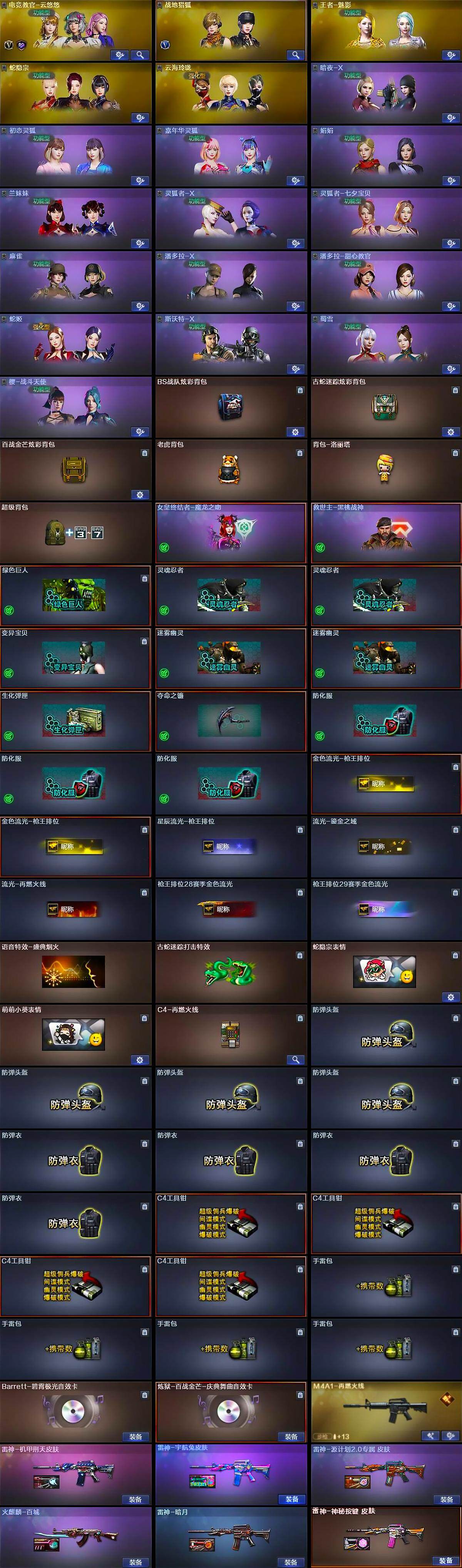 【道具】:BS战队炫彩背包,古蛇迷踪炫彩背包,百战金芒炫彩背包,老虎背包,背包-洛丽塔,超级背包,女皇终结者-魔龙之吻,救世主-黑桃战神,绿色巨人,灵魂忍者*2,变异宝贝,迷雾幽灵*2,生化弹匣,夺命之镰,防化服*3,金色流光-枪王排位*2,星辰流光-枪王排位,流光-鎏金之域,流光-再燃火线,枪王排位28赛季金色流光,枪王排位29赛季金色流光,语音特效-盛典烟火,古蛇迷踪打击特效,蛇隐宗表情,萌萌小葵表情,C4-再燃火线,防弹头盔*4,防弹衣*4,C4工具钳*4,手雷包*4