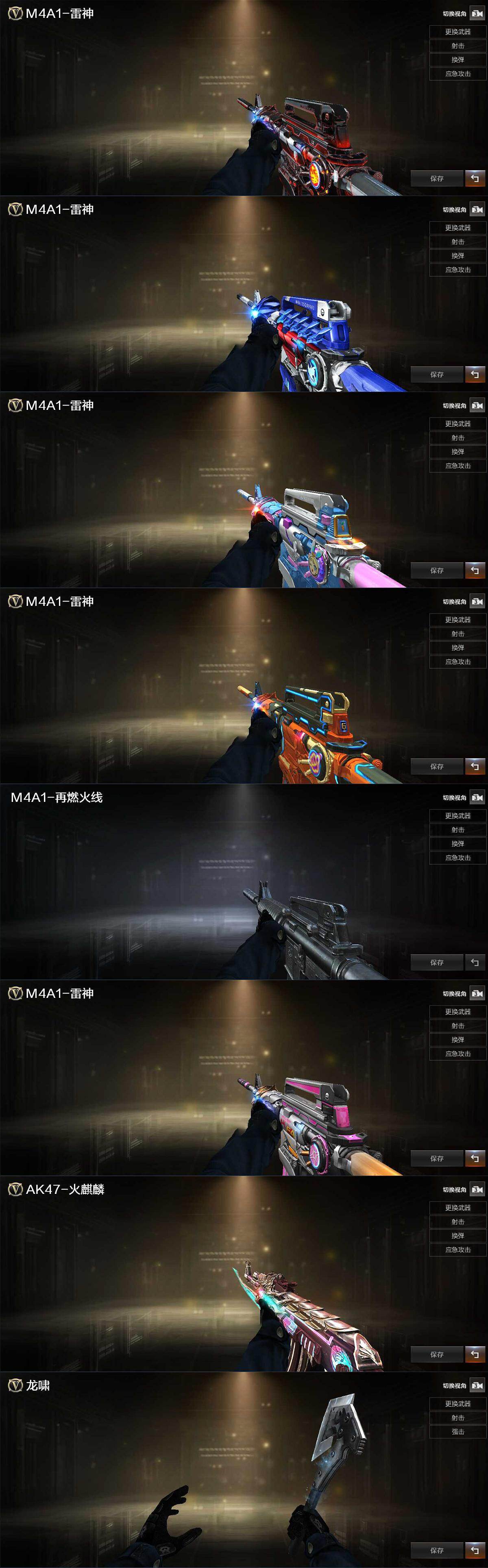 【皮肤】:雷神-暗月,雷神-机甲刑天皮肤,雷神-宇航兔皮肤,雷神-源计划2.0专属 皮肤,M4A1-再燃火线,雷神-神秘按键 皮肤,火麒麟-百城,轻型军用手斧-再燃火线