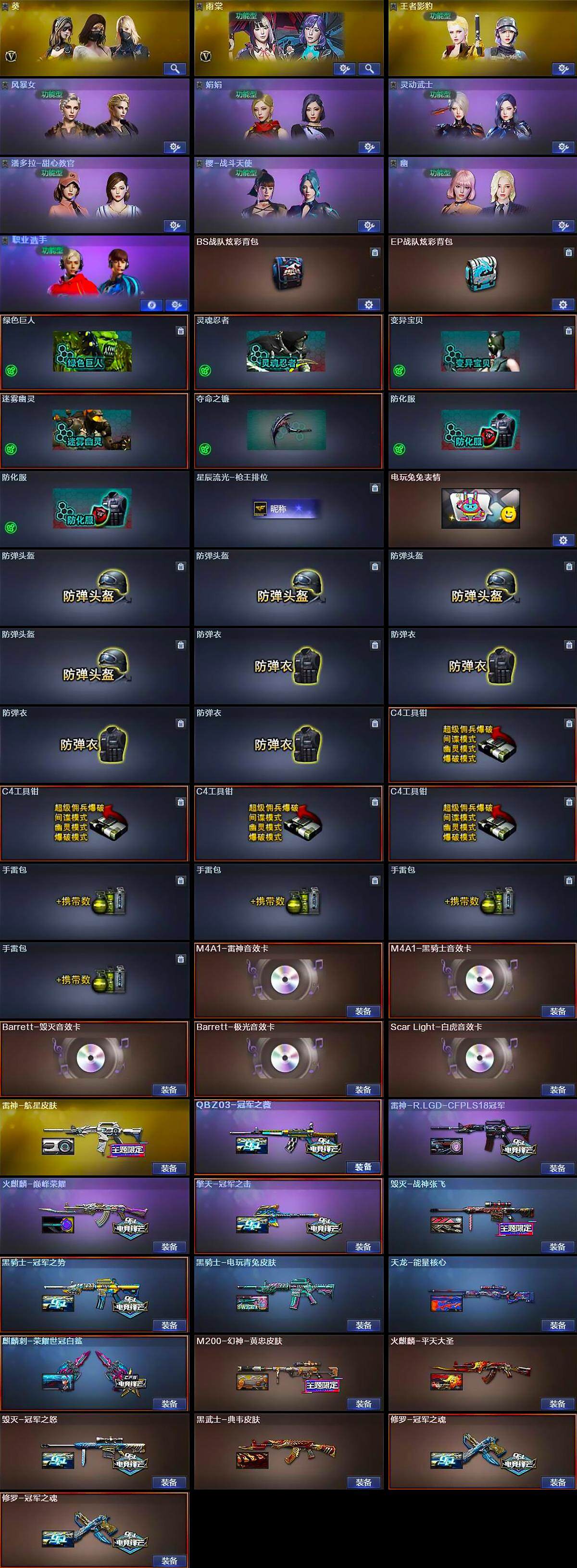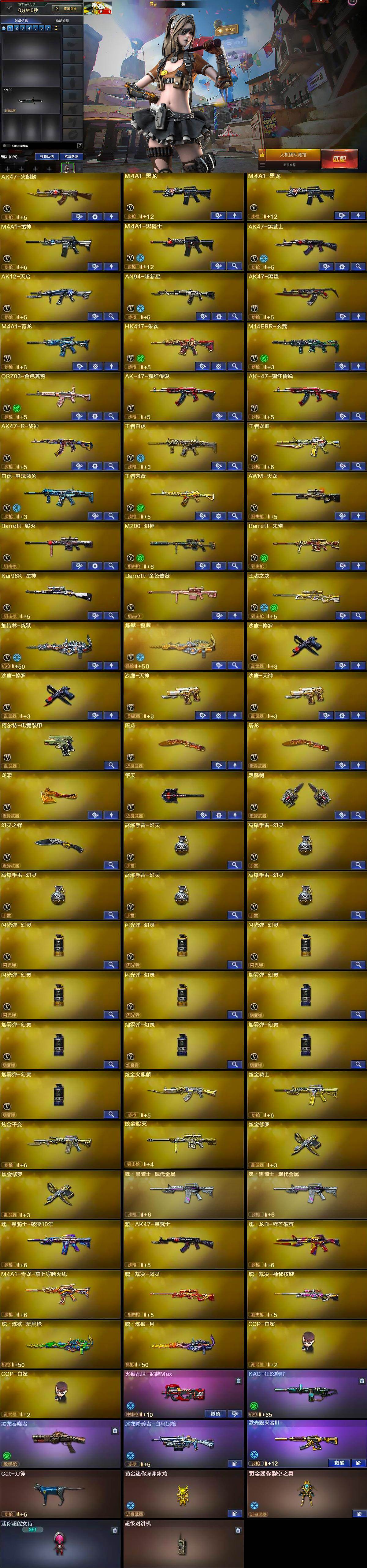 【英雄级武器】:AK47-火麒麟,M4A1-黑龙*2,M4A1-雷神,M4A1-黑骑士,AK47-黑武士,AK12-天启,AN94-超新星,AK47-黑鲨,M4A1-青龙,HK417-朱雀,M14EBR-玄武,QBZ03-金色蔷薇,AK-47-猩红传说*2,AK47-B-战神,王者白虎-觉醒版,王者龙血-觉醒版,白虎-电玩蓝兔,王者芳薇-觉醒版,AWM-天龙,Barrett-毁灭,M200-幻神,Barrett-朱雀,Kar98K-星神,Barrett-金色蔷薇,王者之决-觉醒版,加特林-炼狱,炼狱-悦蓝-觉醒版,沙鹰-修罗*2,沙鹰-天神*2,柯尔特-电竞装甲,屠龙*2,龙啸,擎天,麒麟刺,幻灵之锋,高爆手雷-幻灵*5,闪光弹-幻灵*5,烟雾弹-幻灵*5