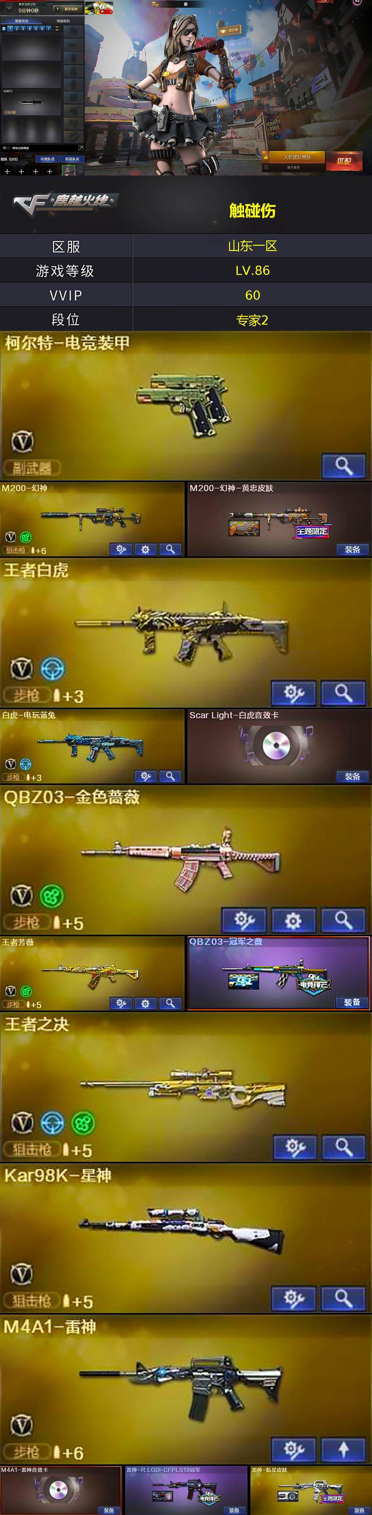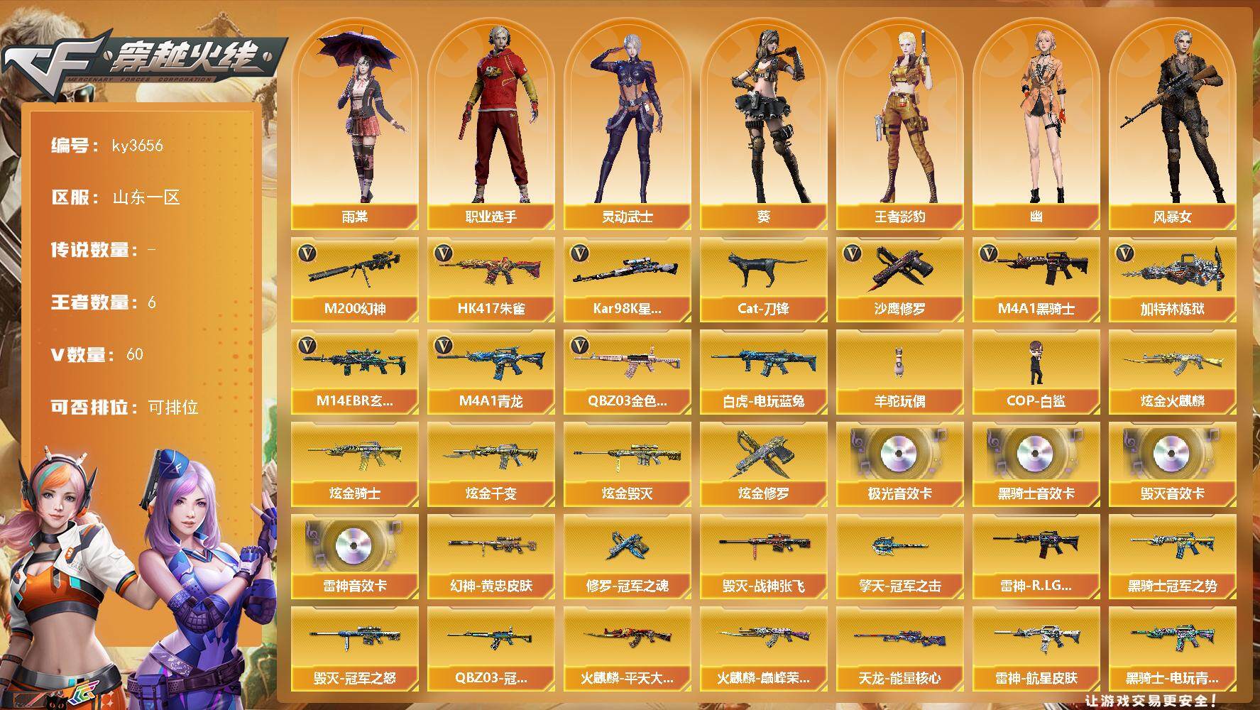 [14418254]山东一区-60V-6王者-6炫金 【热门武器】:QBZ03-金色蔷薇,M14EBR-玄武,HK417-朱雀,M4A1-青龙,M200-幻神,白虎-电玩蓝兔,Kar98K-星神,Cat-刀锋,M4A1-黑骑士,加特林-炼狱,羊驼玩偶,COP-白鲨*2,沙鹰-修罗*2 【王者炫金武器】:炫金火麒麟,炫金骑士,炫金千变,炫金毁灭,炫金修罗*2 【音效卡】:M4A1-雷神音效卡,M4A1-黑骑士音效卡,Barrett-毁灭音效卡,Barrett-极光音效卡 【皮肤】:M200-幻神-黄忠皮肤,QBZ03-冠军之薇,雷神-R.LGD-CFPLS18冠军,雷神-航星皮肤,火麒麟-平天大圣,火麒麟-巅峰荣耀,毁灭-冠军之怒,毁灭-战神张飞,黑骑士-冠军之势,黑骑士-电玩青兔皮肤,黑武士-典韦皮肤,AK47-B-常胜将军-曹操,AK47-B-常胜将军-刘备*2,天龙-能量核心,修罗-冠军之魂*2,擎天-冠军之击,麒麟刺-荣耀世冠白鲨 【角色】:葵,雨棠,王者影豹,风暴女,娟娟,灵动武士,流浪蔷薇,潘多拉-甜心教官,樱-战斗天使,幽,职业选手 【人偶武器】:COP-白鲨*2,Cat-刀锋,黄金迷你深渊冰龙,黄金迷你裂空之翼,迷你超能女侍 【暴走生化】:KAC-狂怒咆哮,黑龙吞噬者,超级对讲机 【挑战大师】:火狱乱世-超越Max,冰龙粉碎者-白马银枪,激光毁灭者III 【英雄级武器】:AK47-火麒麟,M4A1-黑龙*2,M4A1-雷神,M4A1-黑骑士,AK47-黑武士,AK12-天启,AN94-超新星,AK47-黑鲨,M4A1-青龙,HK417-朱雀,M14EBR-玄武,QBZ03-金色蔷薇,AK-47-猩红传说*2,AK47-B-战神,王者白虎-觉醒版,王者龙血-觉醒版,白虎-电玩蓝兔,王者芳薇-觉醒版,AWM-天龙,Barrett-毁灭,M200-幻神,Barrett-朱雀,Kar98K-星神,Barrett-金色蔷薇,王者之决-觉醒版,加特林-炼狱,炼狱-悦蓝-觉醒版,沙鹰-修罗*2,沙鹰-天神*2,柯尔特-电竞装甲,屠龙*2,龙啸,擎天,麒麟刺,幻灵之锋,高爆手雷-幻灵*5,闪光弹-幻灵*5,烟雾弹-幻灵*5 【道具】:BS战队炫彩背包,EP战队炫彩背包,绿色巨人,灵魂忍者,变异宝贝,迷雾幽灵,夺命之镰,防化服*2,星辰流光-枪王排位,电玩兔兔表情,防弹头盔*4,防弹衣*
