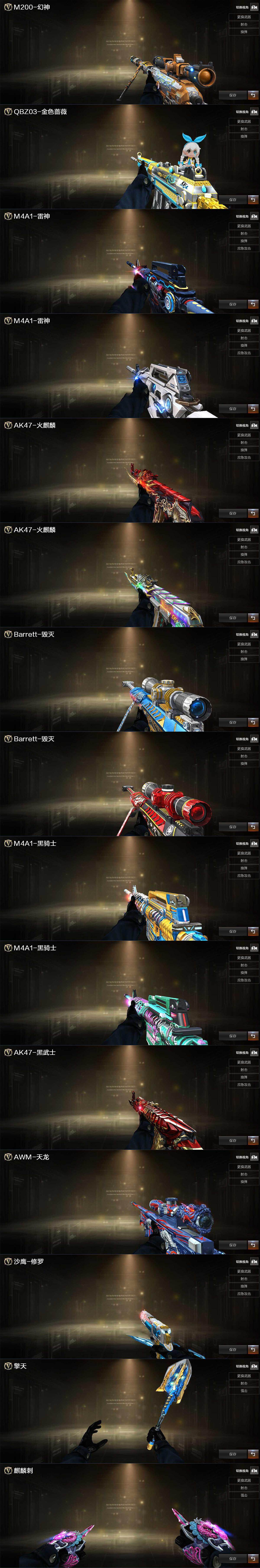 【热门武器】:QBZ03-金色蔷薇,M14EBR-玄武,HK417-朱雀,M4A1-青龙,M200-幻神,白虎-电玩蓝兔,Kar98K-星神,Cat-刀锋,M4A1-黑骑士,加特林-炼狱,羊驼玩偶,COP-白鲨*2,沙鹰-修罗*2