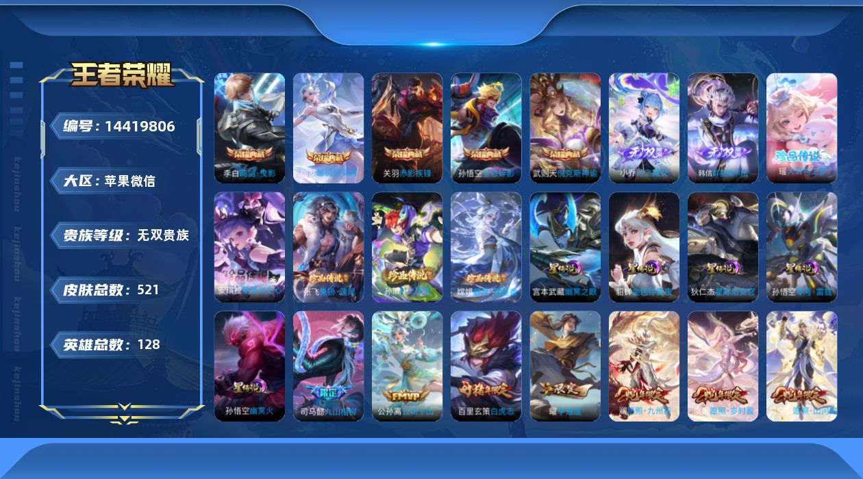 [14419806]苹果WX-V11-1水晶未悦换-128英雄-521皮肤-6水-1典藏英雄-2无双-5珍品传说-63传说-184史诗-6星元