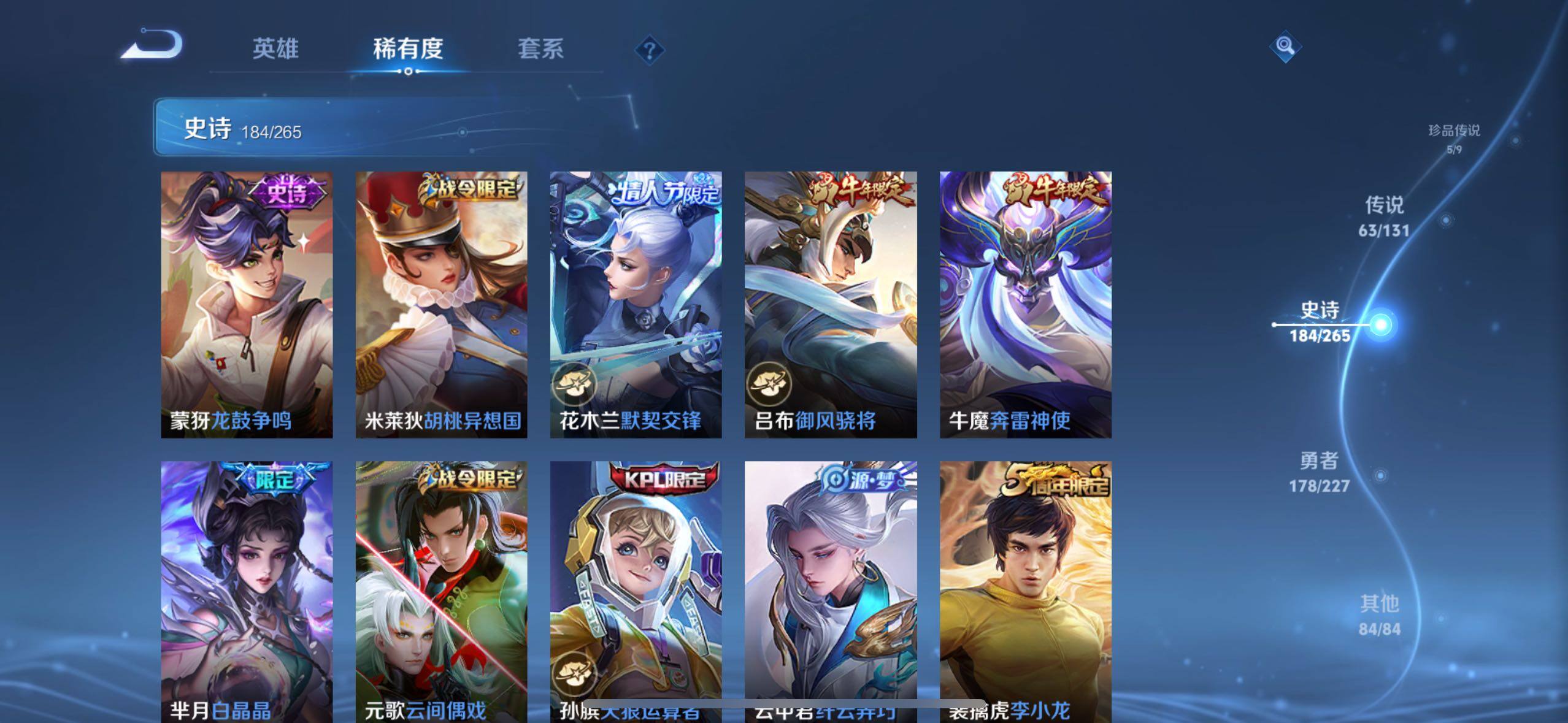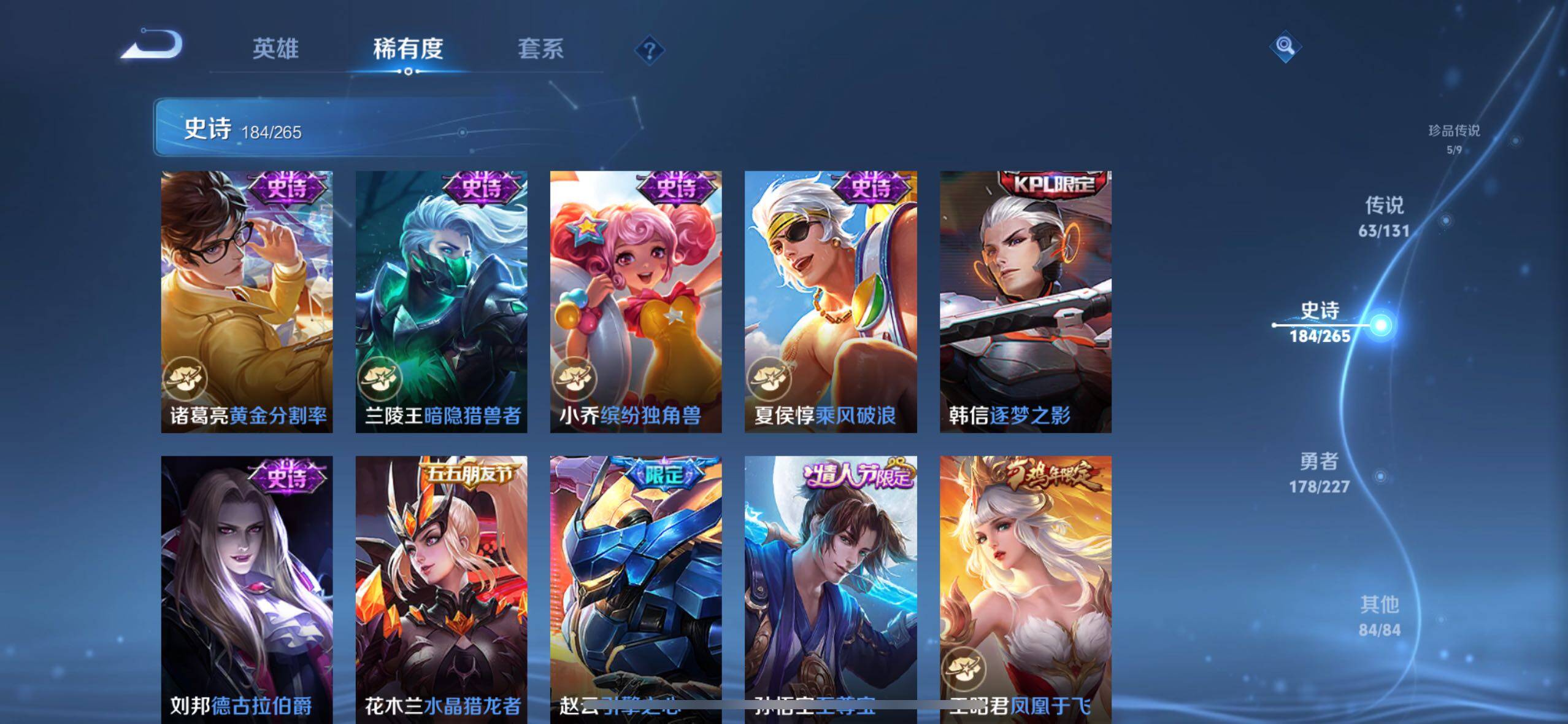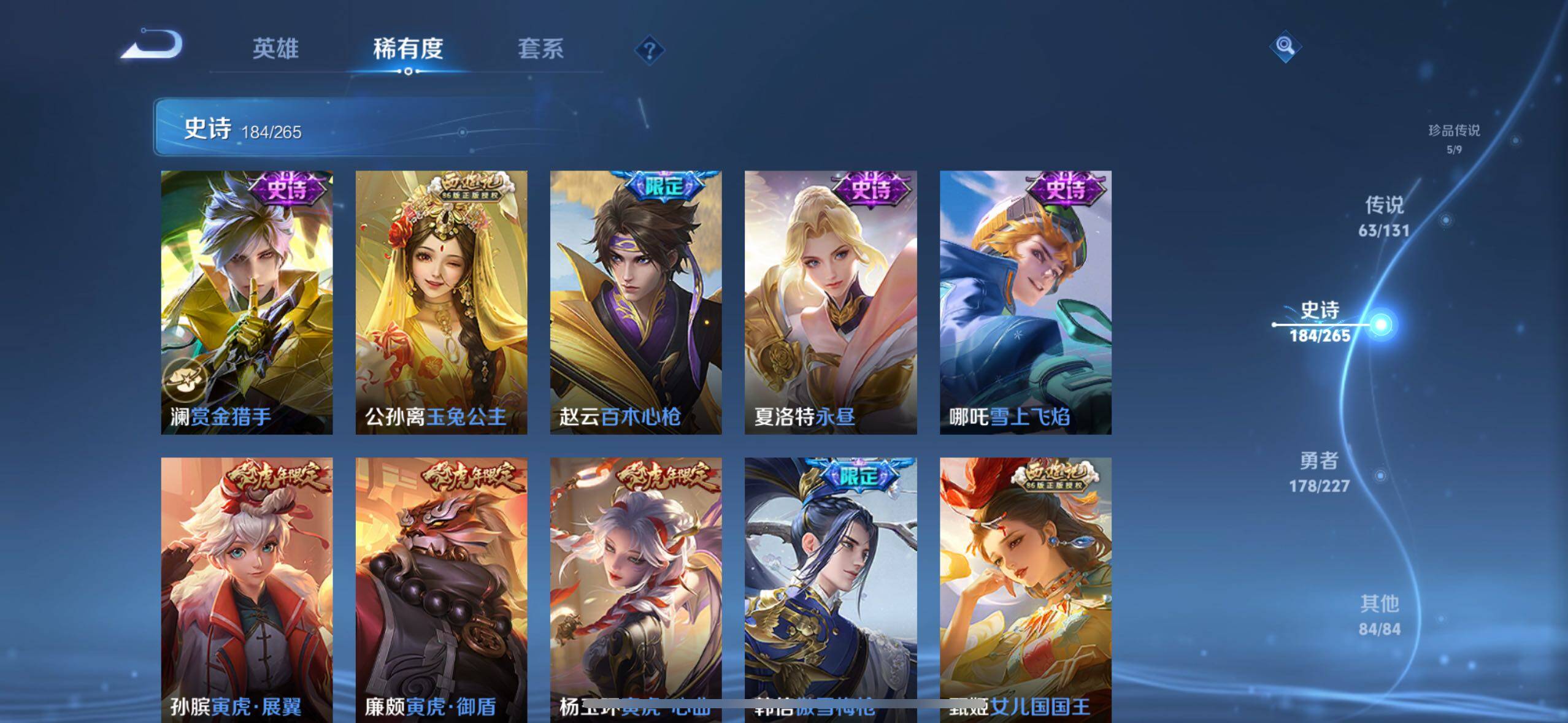 关羽冰锋战神,裴擒虎李小龙,上官婉儿梁祝,牛魔奔雷神使,貂蝉逐梦之音,公孙离祈雪灵祝,吕布御风骁将,诸葛亮时雨天司,关羽武圣,马超神威,典韦岱宗,韩信飞衡,伽罗太华,曹操天狼征服者,裴擒虎天狼狩猎者,孙膑天狼运算者,伽罗天狼溯光者,哪吒逐梦之翼,韩信逐梦之影,东皇太一逐梦之光,铠青龙志,百里玄策白虎志,花木兰瑞麟志,苏烈玄武志,百里守约朱雀志,王昭君凤凰于飞,项羽霸王别姬,虞姬霸王别姬,小乔纯白花嫁,周瑜真爱至上,孙悟空大圣娶亲,露娜一生所爱,花木兰默契交锋,兰陵王默契交锋,后羿如梦令,嫦娥如梦令,孙悟空至尊宝,裴擒虎梅西,干将莫邪冰霜恋舞曲,花木兰青春决赛季,蔡文姬奇迹圣诞,公孙离蜜橘之夏,芈月白晶晶,赵云引擎之心,鲁班七号乒乒小将,猪八戒猪悟能,廉颇寅虎·御盾,孙尚香异界灵契,老夫子圣诞老人,孙悟空孙行者,甄姬女儿国国王,镜匿光追影者,韩信傲雪梅枪,鲁班七号寅虎·瑞焰,孙膑寅虎·展翼,杨玉环寅虎·心曲,裴擒虎寅虎·赤拳,赵云百木心枪,公孙离玉兔公主,后羿无尽星芒,马可波罗深海之息,金蝉唐三藏,娜可露露前尘镜,橘右京枫霜尽,鲁班大师匿光启智者,妲己时之奇旅,王昭君星穹之声,不知火舞绯月行,盾山梦圆繁星,马可波罗山海·玄木吟,盘古冰霜神祇,西施至美·乘鲤谣,甄姬至美·化雀舞,桑启鸣野蒿,澜愿照·九州拓,蔡文姬愿照·福禄聚,虞姬愿照·岁时盈,司空震愿照·山河定,妲己愿照·众生和,女娲愿照·千秋盛