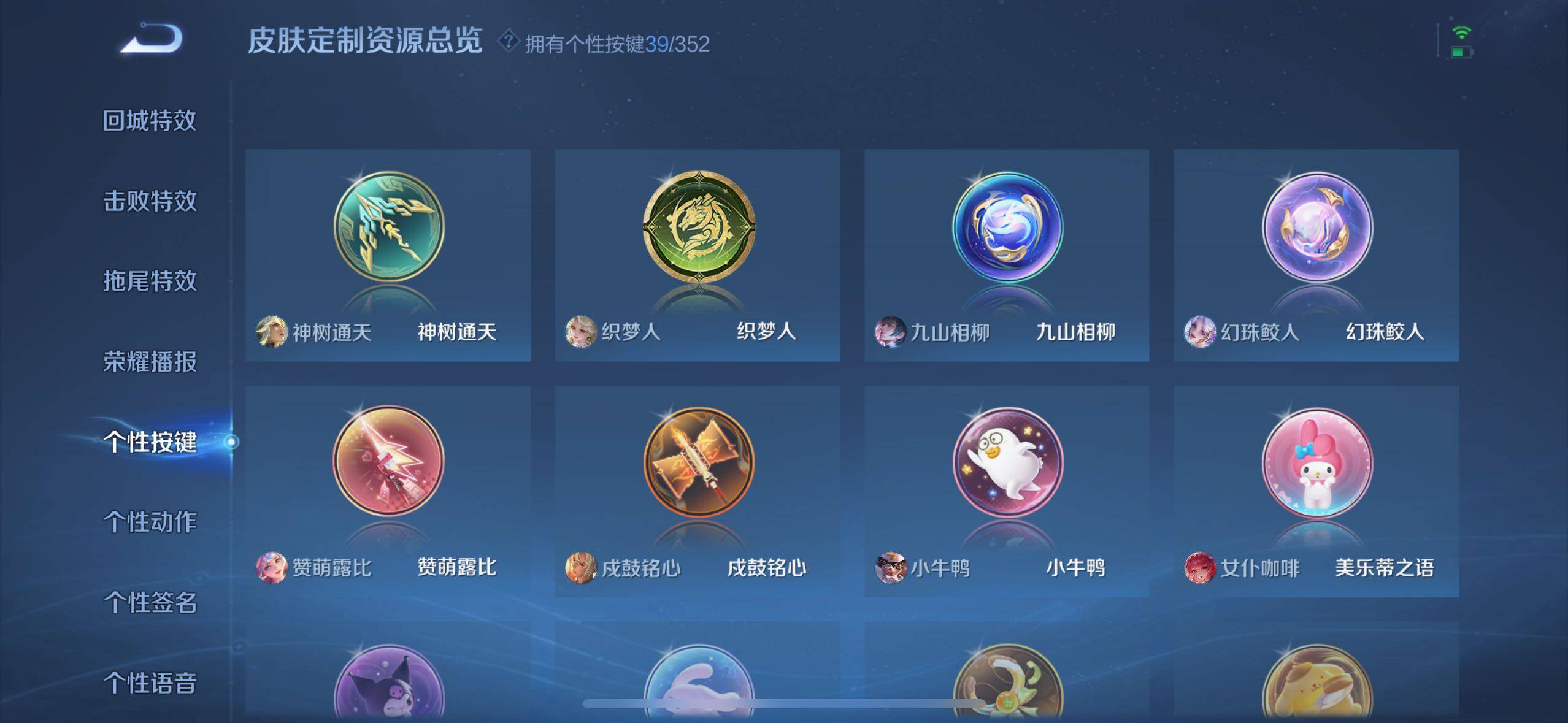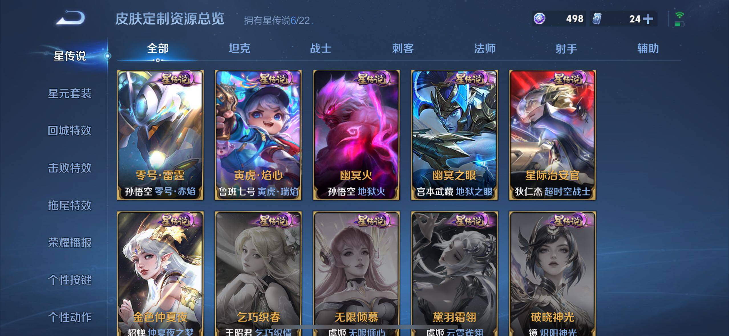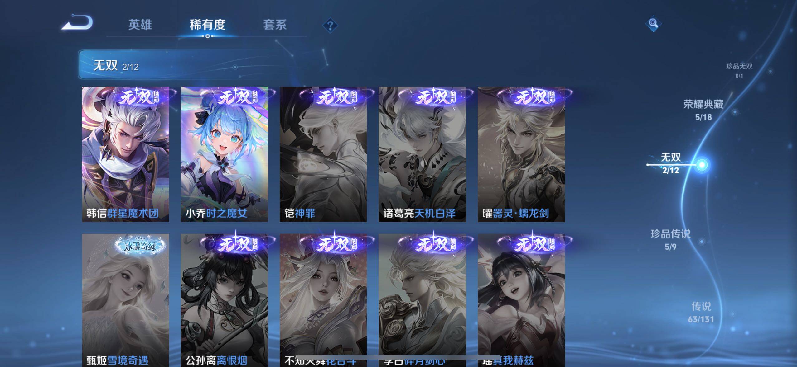 关羽冰锋战神,裴擒虎李小龙,上官婉儿梁祝,牛魔奔雷神使,貂蝉逐梦之音,公孙离祈雪灵祝,吕布御风骁将,诸葛亮时雨天司,关羽武圣,马超神威,典韦岱宗,韩信飞衡,伽罗太华,曹操天狼征服者,裴擒虎天狼狩猎者,孙膑天狼运算者,伽罗天狼溯光者,哪吒逐梦之翼,韩信逐梦之影,东皇太一逐梦之光,铠青龙志,百里玄策白虎志,花木兰瑞麟志,苏烈玄武志,百里守约朱雀志,王昭君凤凰于飞,项羽霸王别姬,虞姬霸王别姬,小乔纯白花嫁,周瑜真爱至上,孙悟空大圣娶亲,露娜一生所爱,花木兰默契交锋,兰陵王默契交锋,后羿如梦令,嫦娥如梦令,孙悟空至尊宝,裴擒虎梅西,干将莫邪冰霜恋舞曲,花木兰青春决赛季,蔡文姬奇迹圣诞,公孙离蜜橘之夏,芈月白晶晶,赵云引擎之心,鲁班七号乒乒小将,猪八戒猪悟能,廉颇寅虎·御盾,孙尚香异界灵契,老夫子圣诞老人,孙悟空孙行者,甄姬女儿国国王,镜匿光追影者,韩信傲雪梅枪,鲁班七号寅虎·瑞焰,孙膑寅虎·展翼,杨玉环寅虎·心曲,裴擒虎寅虎·赤拳,赵云百木心枪,公孙离玉兔公主,后羿无尽星芒,马可波罗深海之息,金蝉唐三藏,娜可露露前尘镜,橘右京枫霜尽,鲁班大师匿光启智者,妲己时之奇旅,王昭君星穹之声,不知火舞绯月行,盾山梦圆繁星,马可波罗山海·玄木吟,盘古冰霜神祇,西施至美·乘鲤谣,甄姬至美·化雀舞,桑启鸣野蒿,澜愿照·九州拓,蔡文姬愿照·福禄聚,虞姬愿照·岁时盈,司空震愿照·山河定,妲己愿照·众生和,女娲愿照·千秋盛