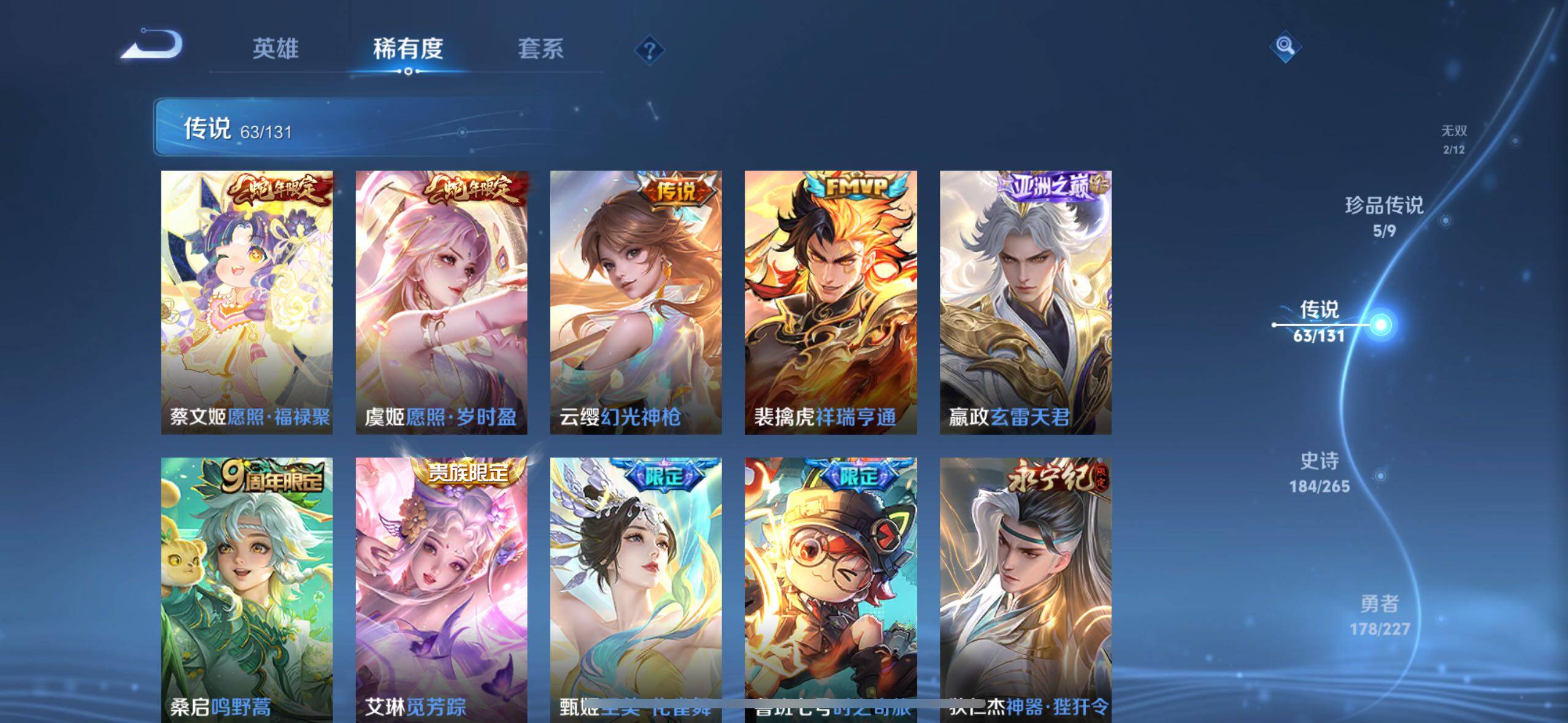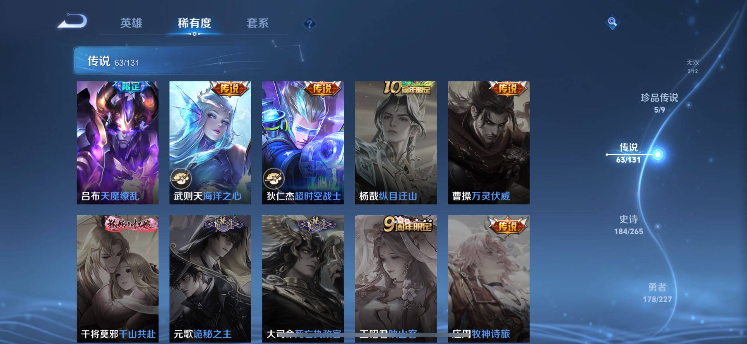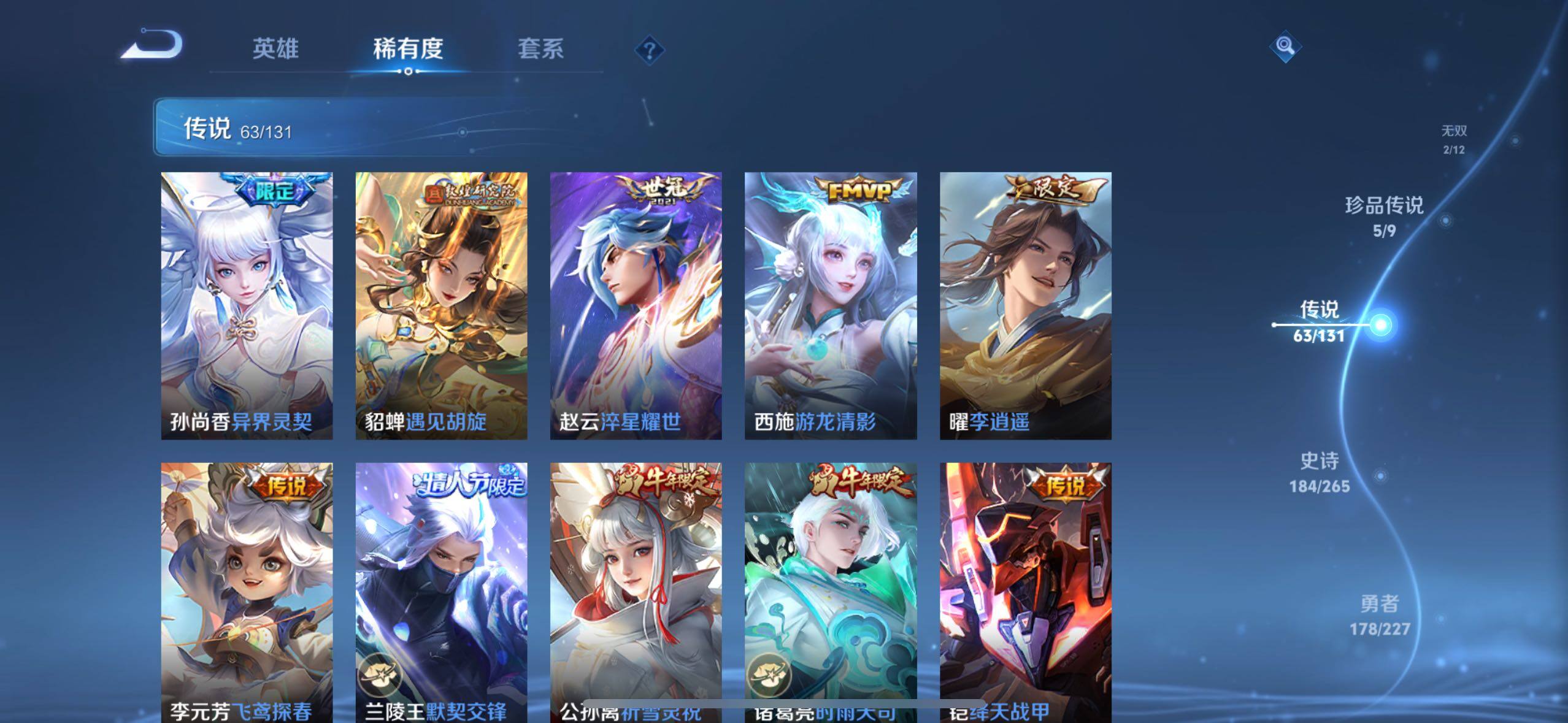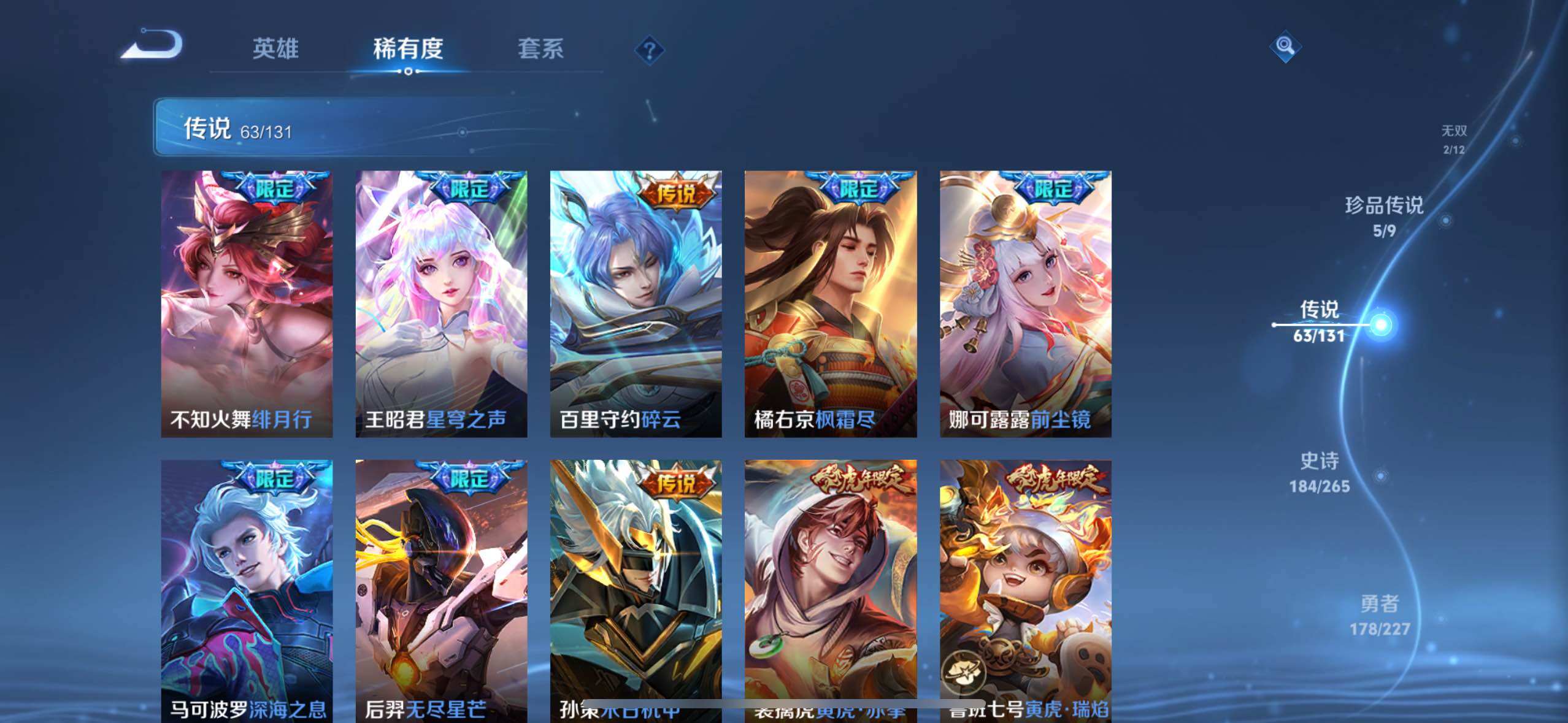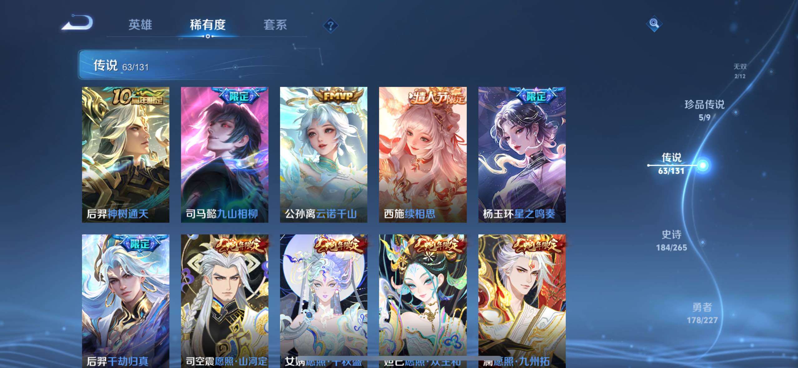 【传说皮肤】:后羿神树通天,司马懿九山相柳,公孙离云诺千山,西施续相思,杨玉环星之鸣奏,后羿千劫归真,司空震愿照山河定,女娲愿照千秋盛,妲己愿照众生和,澜愿照九州拓,蔡文姬愿照福禄聚,虞姬愿照岁时盈,云缨幻光神枪,裴擒虎祥瑞亨通,嬴政玄雷天君,桑启鸣野蒿,艾琳觅芳踪,甄姬至美化雀舞,鲁班七号时之奇旅,狄仁杰神器狴犴令,不知火舞绯月行,王昭君星穹之声,百里守约碎云,橘右京枫霜尽,娜可露露前尘镜,马可波罗深海之息,后羿无尽星芒,孙策末日机甲,裴擒虎寅虎赤拳,鲁班七号寅虎瑞焰,孙尚香异界灵契,貂蝉遇见胡旋,赵云淬星耀世,西施游龙清影,曜李逍遥 ,李元芳飞鸢探春,兰陵王默契交锋,公孙离祈雪灵祝,诸葛亮时雨天司,铠绛天战甲,镜炽阳神光,虞姬启明星使,孙悟空零号赤焰,关羽武圣,曜云鹰飞将,李信一念神魔,伽罗太华,貂蝉猫影幻舞,干将莫邪久胜战神,百里玄策白虎志,花木兰冠军飞将,梦奇胖达荣荣,后羿黄金射手座,杨戬永曜之星,诸葛亮武陵仙君,貂蝉仲夏夜之梦,李白凤求凰,孙尚香末日机甲,宫本武藏地狱之眼,孙悟空地狱火,吕布天魔缭乱,武则天海洋之心,狄仁杰超时空战士
