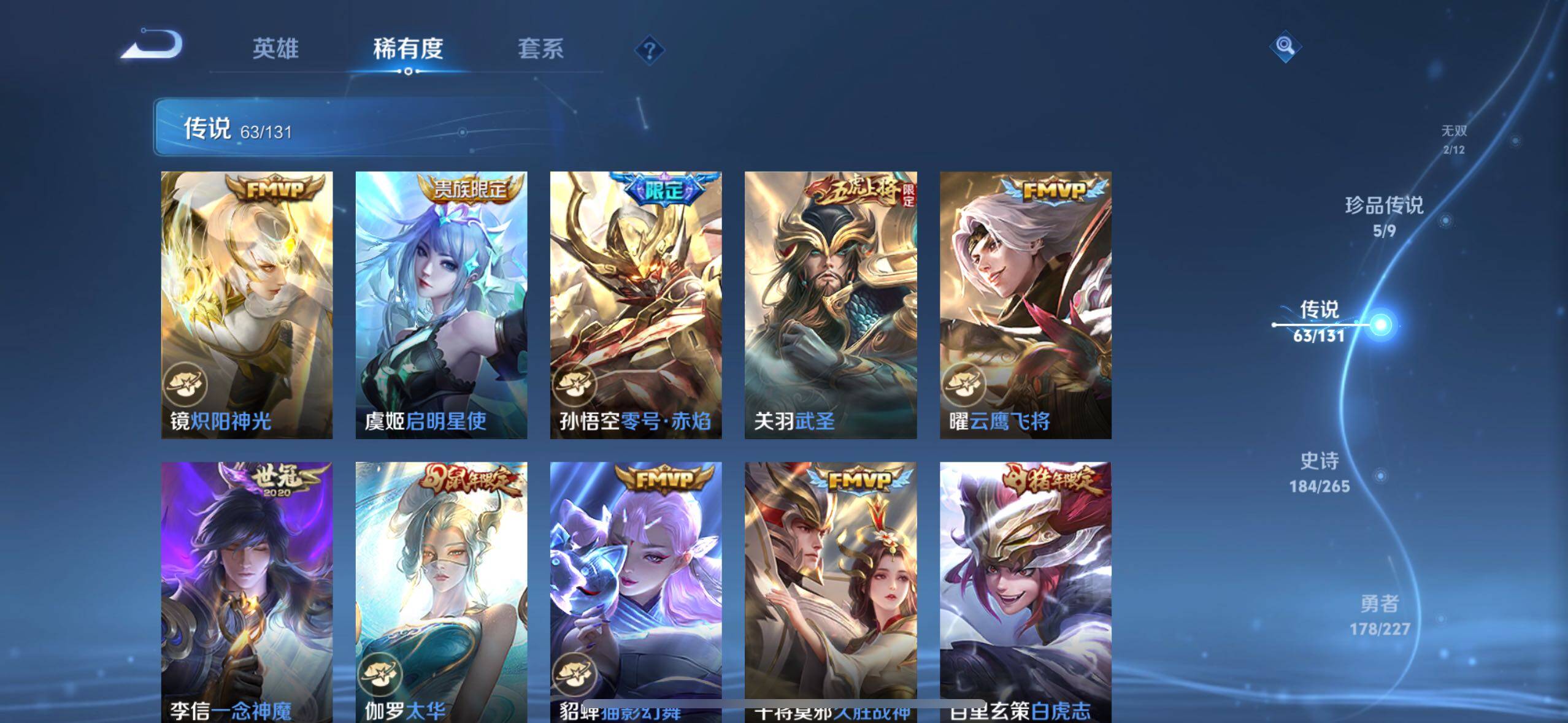 - PX_2104952-??信/最强王者/166皮肤/124英雄/2典藏/0珍品无双/1无双/0珍品传说/14传说/50史诗/8稀有英雄 【2 典藏皮肤】全息碎影 孙悟空,九霄神辉 花木兰, 【1 无双皮肤】碎月剑心 李白, 【14 传说皮肤】启明星使 虞姬,云霓雀翎 虞姬,无双飞将 马超,白虎志 百里玄策,地狱火 孙悟空,仲夏夜之梦 貂蝉,落雪白狼 亚连,海洋之心 武则天,炽阳神光 镜,黄金射手座