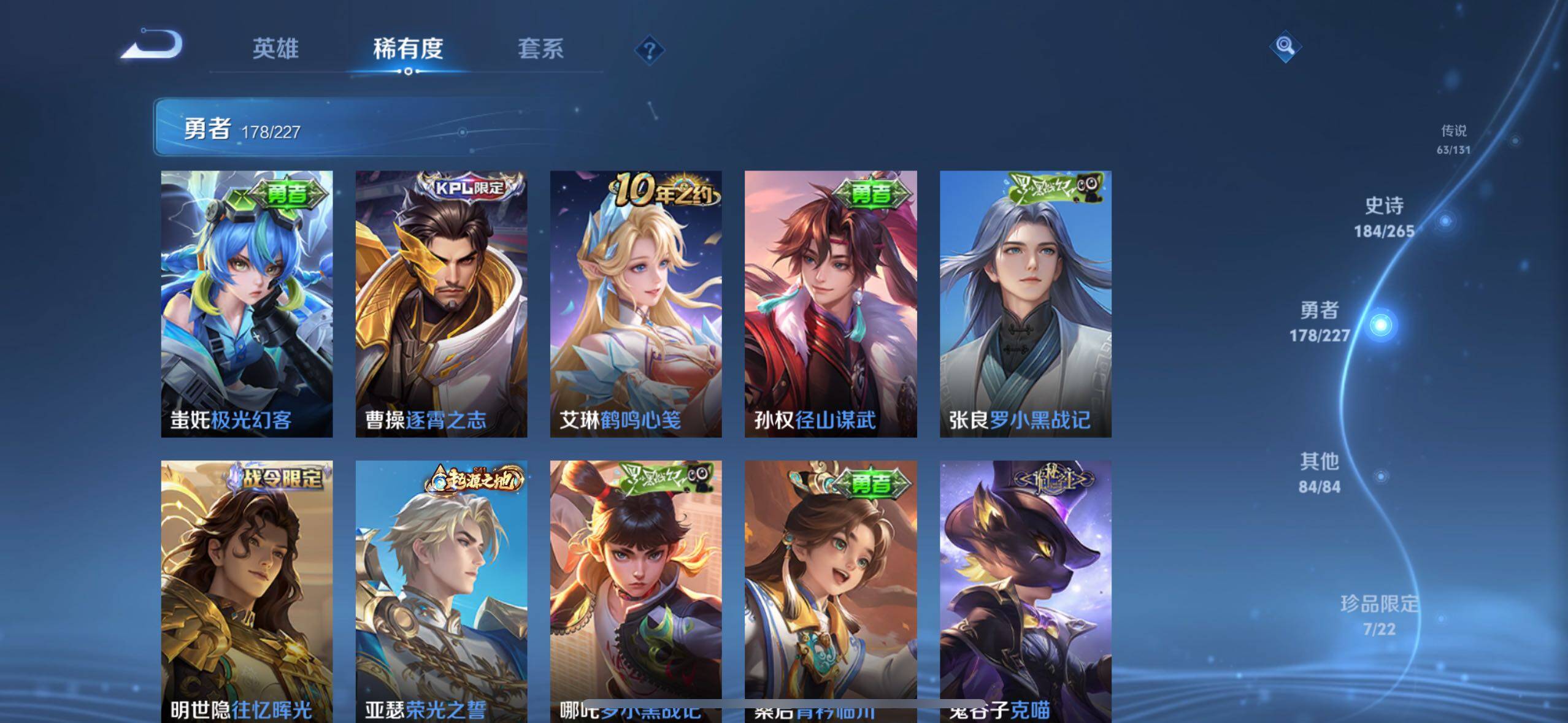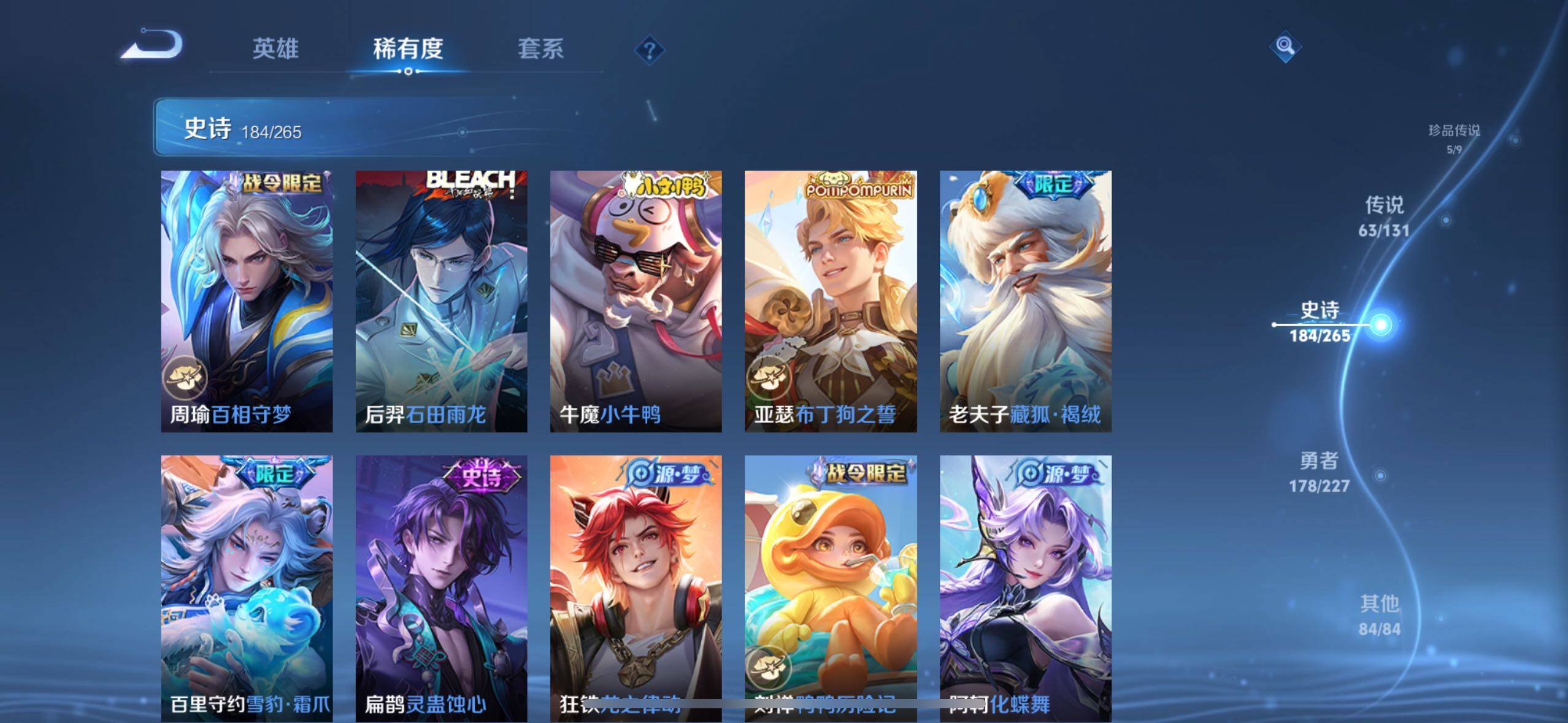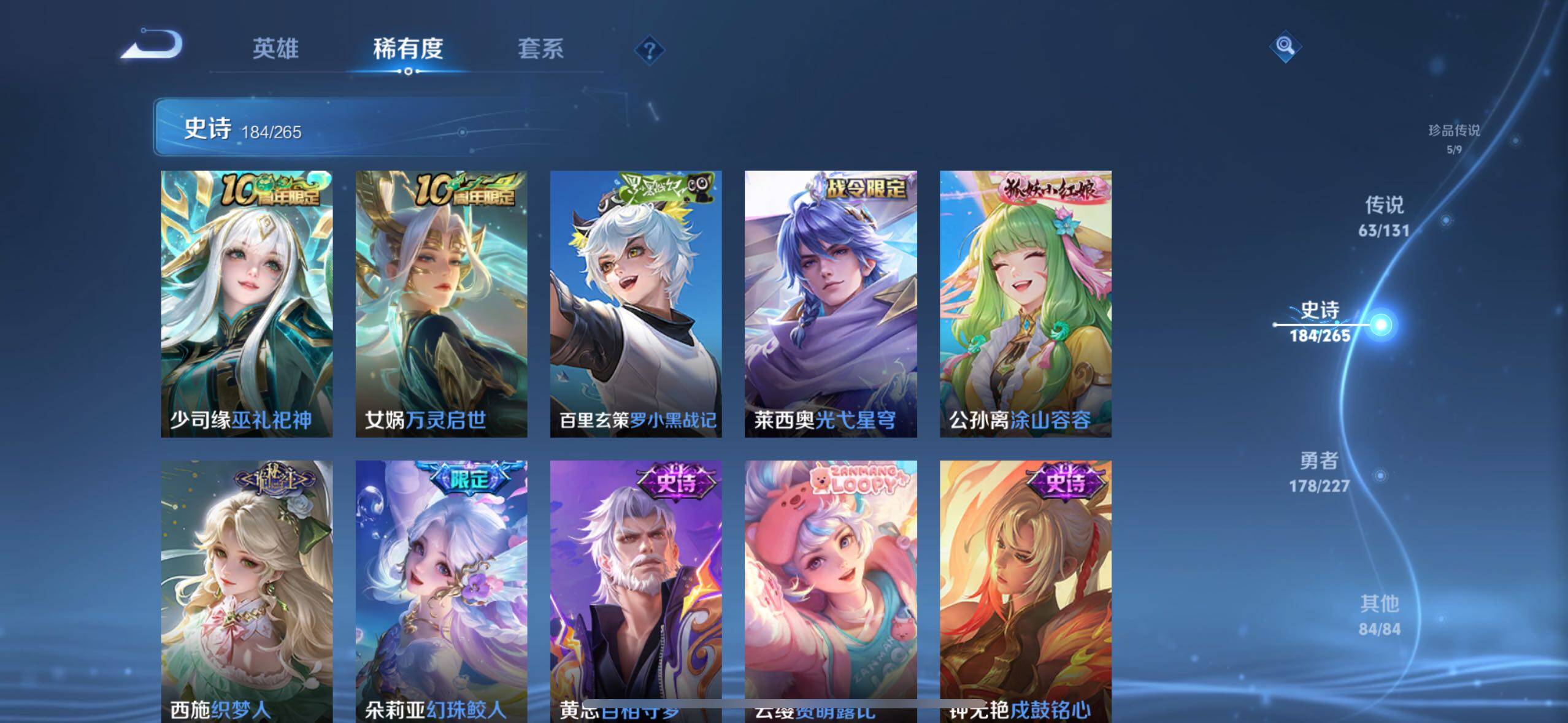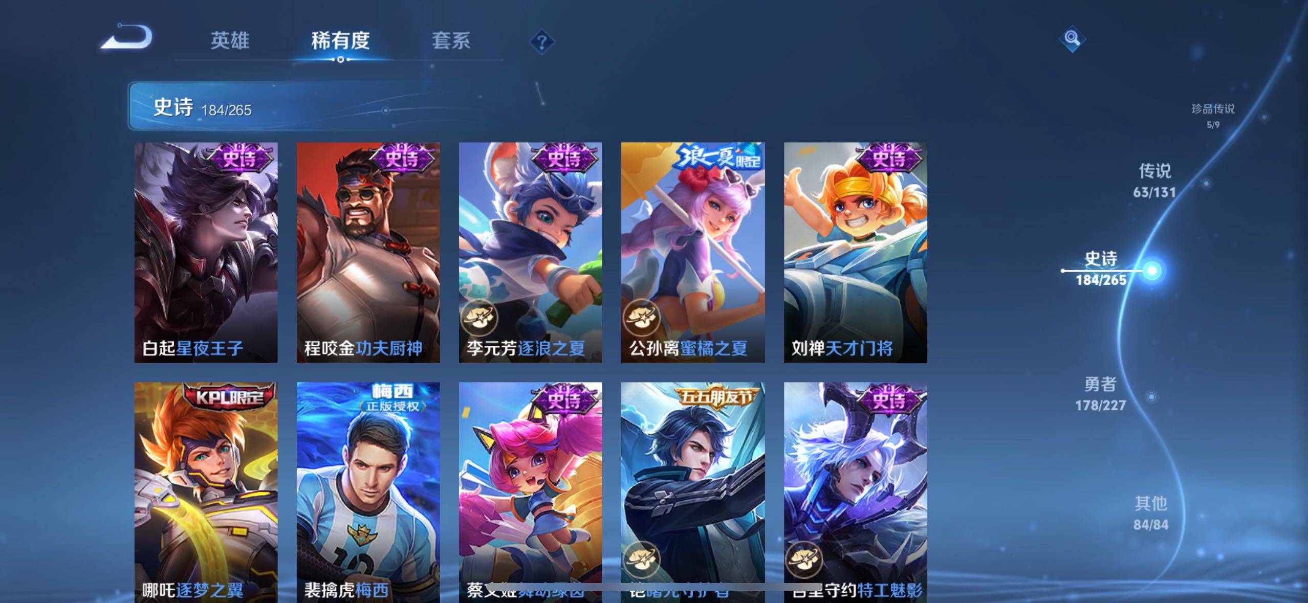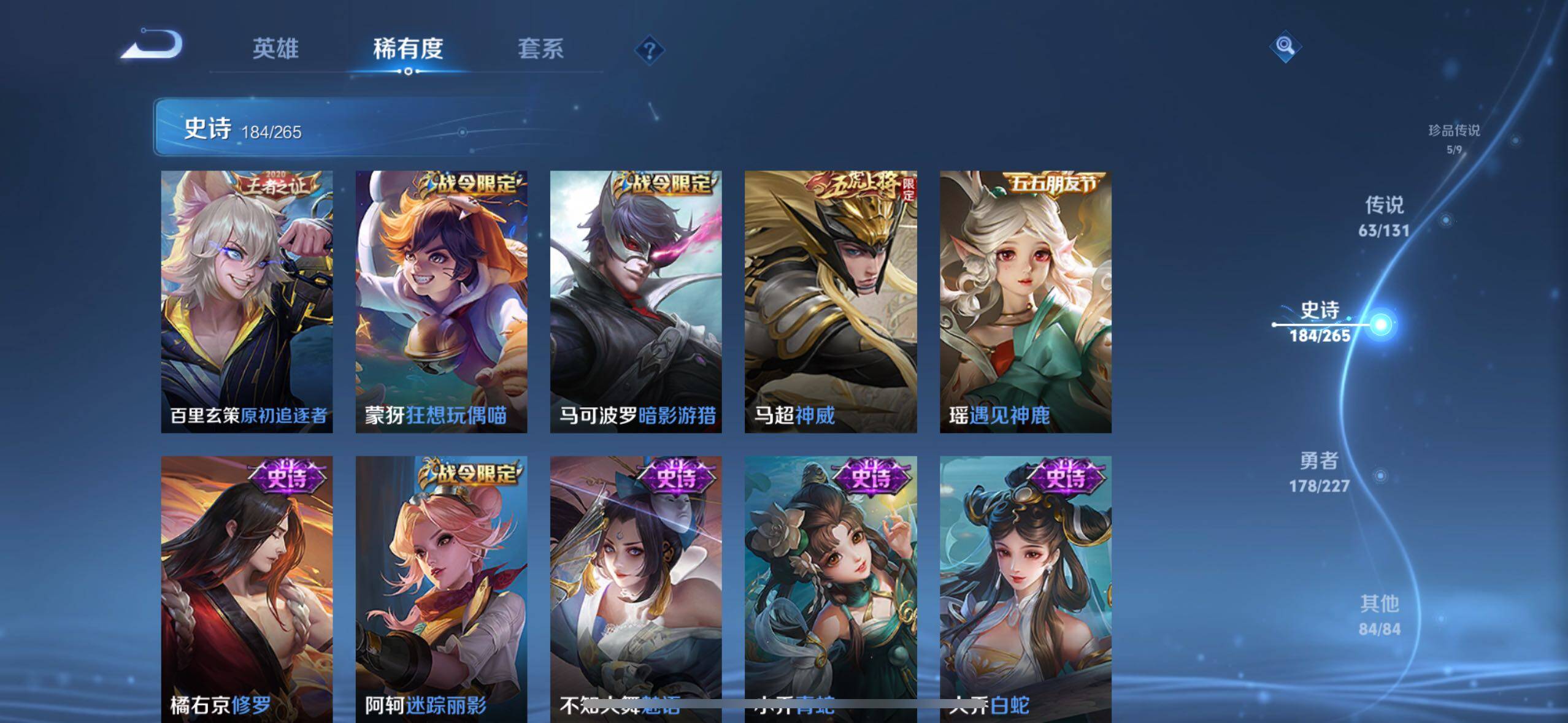 虞姬凯尔特女王,白起狰,太乙真人饕餮,曹操烛龙,芈月重明,典韦穷奇,狂铁御狮,米莱狄御霄,夏侯惇朔风刀,明世隐疑决卦,老夫子醍醐杖,鬼谷子原初探秘者,狄仁杰万华元夜,程咬金演武夺筹,钟馗驱傩正仪,苏烈千军破阵,吕布猎兽之王,嬴政白昼王子,典韦蓝屏警告,钟馗神迹守卫,鲁班七号狮舞东方,沈梦溪星空之诺,李元芳银河之约,刘邦夺宝奇兵,马可波罗暗影游猎,蒙犽狂想玩偶喵,元歌云间偶戏,弈星混沌棋,达摩沙漠行僧,兰陵王金庭之子,沈梦溪大漠名商,李元芳云中旅人,桑启海盐诗旅,裴擒虎擒涛扼浪,鲁班大师探海日志,张良古海寻踪