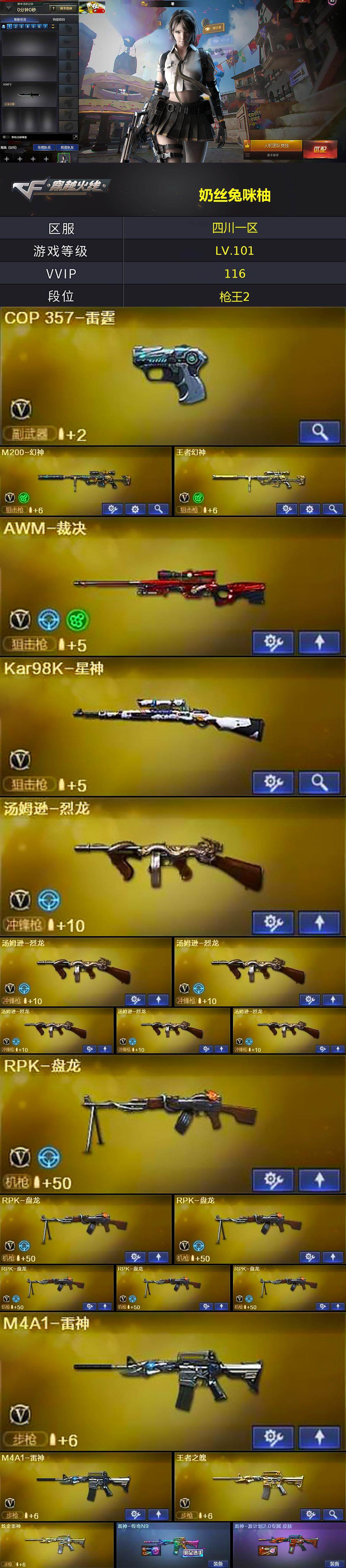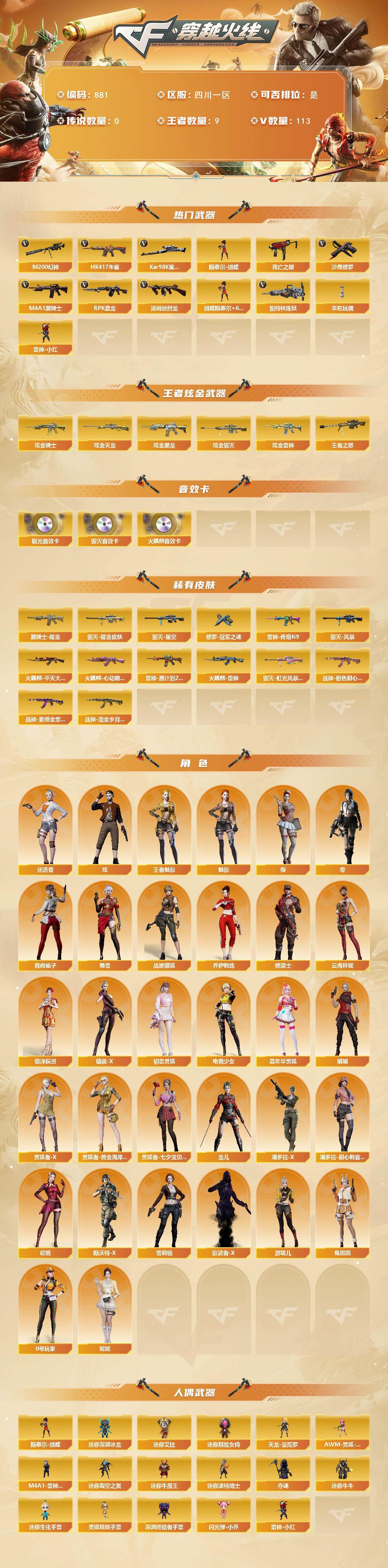 [14420727]四川一区-113V-9王者-6炫金 【热门武器】:HK417-朱雀,M200-幻神,死亡之眼,Kar98K-星神,M4A1-黑骑士*2,汤姆逊-烈龙*6,RPK-盘龙*6,加特林-炼狱*3,斯泰尔-蝴蝶,羊驼玩偶,雷神-小红,沙鹰-修罗*3 【王者炫金武器】:王者之怒,炫金骑士,炫金黑龙*2,炫金雷神,炫金毁灭,炫金天龙 【音效卡】:AK47-火麒麟音效卡,Barrett-毁灭音效卡,Barrett-极光音效卡*2 【皮肤】:雷神-传奇N9,雷神-源计划2.0专属 皮肤,火麒麟-雷神,火麒麟-平天大圣,火麒麟-心动糖果,毁灭耀金皮肤,毁灭-星空,毁灭-风暴,毁灭-虹光风暴 皮肤,黑骑士耀金皮肤,超新星-深海萌鲨 皮肤,战神-粉色甜心皮肤*3,战神-紫绶金章皮肤*4,战神-流金岁月皮肤*2,修罗-冠军之魂 【角色】:零,樱,魅影,炫,迷迭香,妮妮,战地猎狐,王者-魅影,奇洋探员,乔伊教练,修道士,云海玲珑,暗夜-X,初恋灵狐,电竞少女,嘉年华灵狐,娟娟,0号玩家,灵狐者-X,灵狐者-黄金海岸,灵狐者-七夕宝贝,龙儿,潘多拉-X,潘多拉-甜心教官,青霞仙子,蛇姬,斯沃特-X,蜀雪,兔囡囡,雪莉杨,影武者-X,游珑儿 【人偶武器】:雷神-小红,天龙-曼陀罗,M4A1-雷神-精英刀锋,斯泰尔-蝴蝶,AWM-灵狐-15周年嘉年华,迷你深渊冰龙,迷你裂空之翼,迷你牛魔王,迷你波特博士,夺魂*2,迷你牛牛,迷你生化手雷,深渊终结者手雷,闪光弹-小乔,迷你艾比,迷你超能女侍,灵狐娃娃手雷 【暴走生化】:死亡之眼,超级对讲机 【挑战大师】:神圣爆裂者III,AK47-冰龙粉碎者,冰龙粉碎者-白马银枪,激光毁灭者III-白马银枪*2,激光毁灭者III*2,神圣爆裂者-末日III*2 【英雄级武器】:AK47-火麒麟*2,M4A1-黑龙,M4A1-雷神*2,M4A1-黑骑士*2,AK47-黑武士,AK12-天启*3,AK47-黑鲨,M4A1-龙血,M4A1-雷霆,HK417-朱雀,无影-神兵利器,黑武士-锦绣游龙,超新星-热带奇洋,M4A1-猎神,烈火-动感闪耀,王者之魄-觉醒版,王者之幻-觉醒版,AK-47-猩红传说*7,AK47-B-战神,黑骑士-海王*2,黑武士-CF网剧冠军,Barrett-毁灭*3,Barrett-极光,AWM-裁决,M200-幻神,Kar98K-星神,王者之
