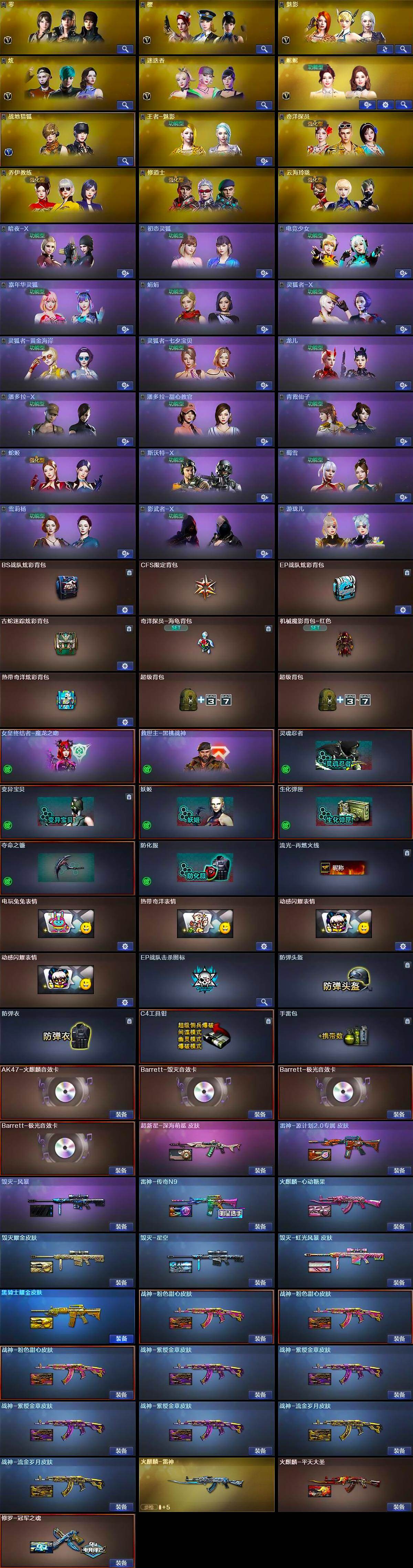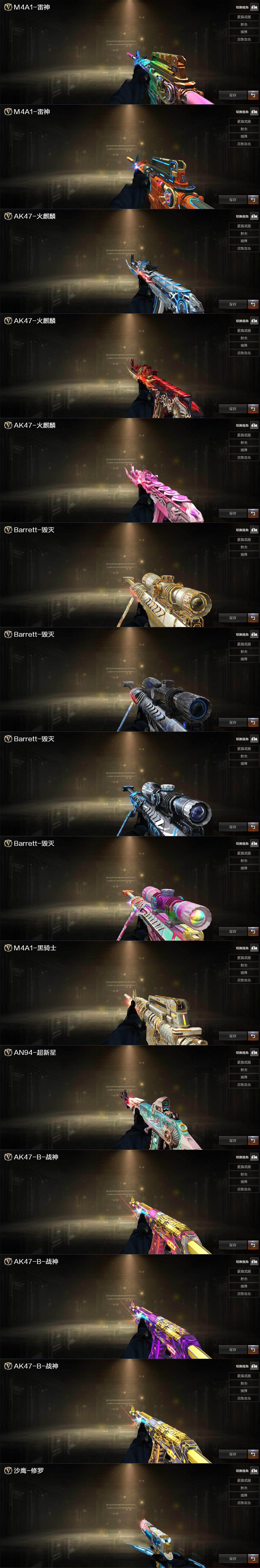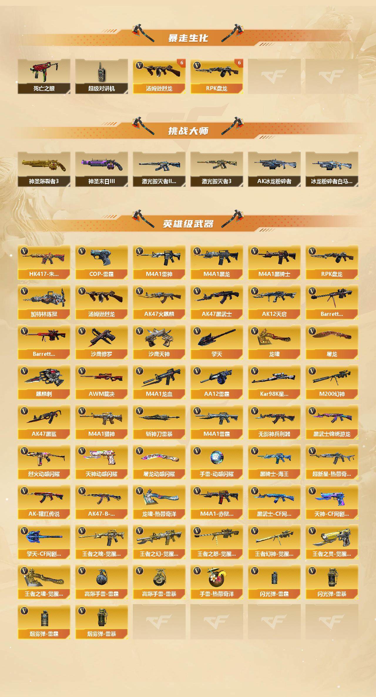 【英雄级武器】:AK47-火麒麟*2,M4A1-黑龙,M4A1-雷神*2,M4A1-黑骑士*2,AK47-黑武士,AK12-天启*3,AK47-黑鲨,M4A1-龙血,M4A1-雷霆,HK417-朱雀,无影-神兵利器,黑武士-锦绣游龙,超新星-热带奇洋,M4A1-猎神,烈火-动感闪耀,王者之魄-觉醒版,王者之幻-觉醒版,AK-47-猩红传说*7,AK47-B-战神,黑骑士-海王*2,黑武士-CF网剧冠军,Barrett-毁灭*3,Barrett-极光,AWM-裁决,M200-幻神,Kar98K-星神,王者之