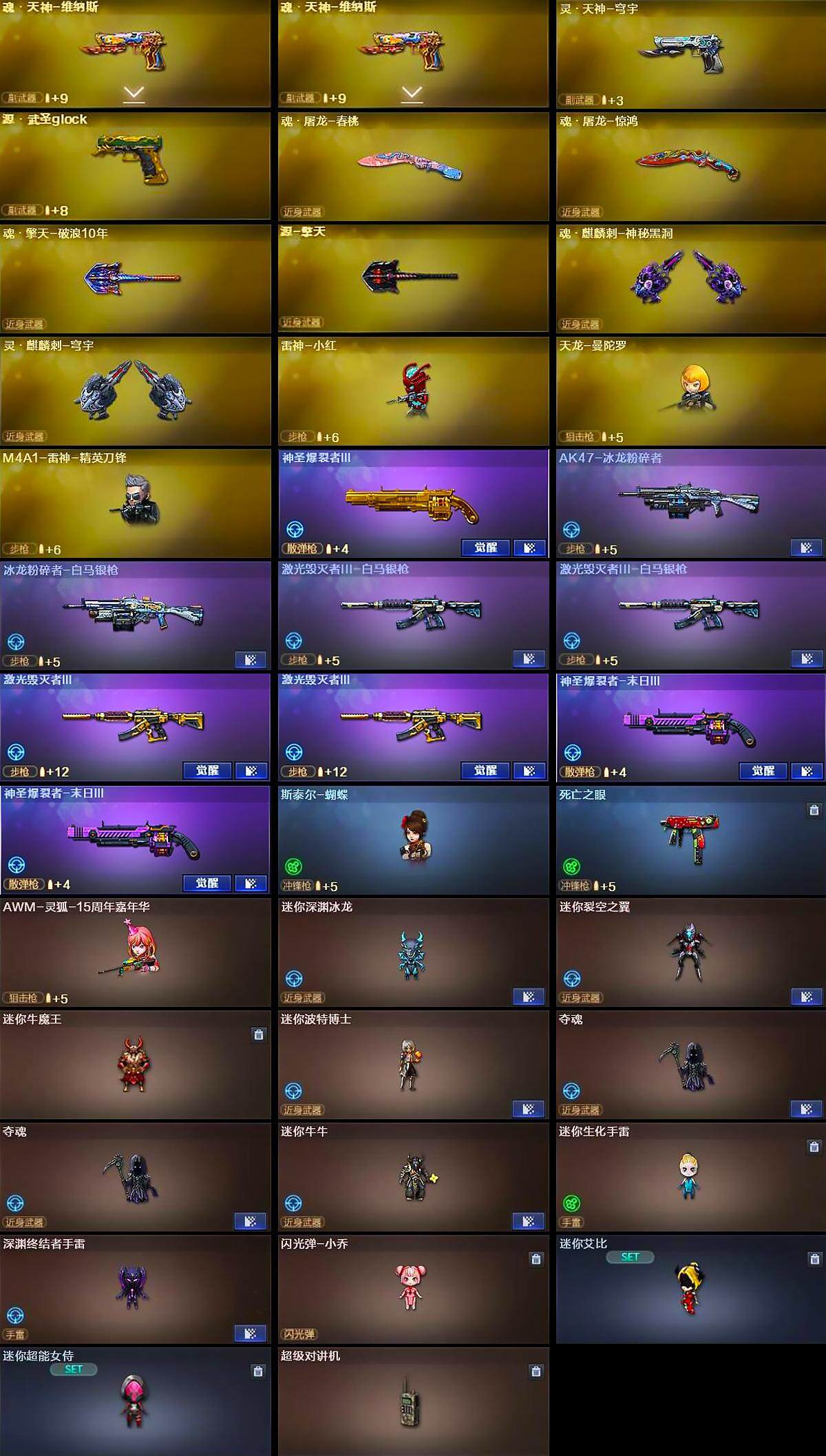 【人偶武器】:雷神-小红,天龙-曼陀罗,M4A1-雷神-精英刀锋,斯泰尔-蝴蝶,AWM-灵狐-15周年嘉年华,迷你深渊冰龙,迷你裂空之翼,迷你牛魔王,迷你波特博士,夺魂*2,迷你牛牛,迷你生化手雷,深渊终结者手雷,闪光弹-小乔,迷你艾比,迷你超能女侍,灵狐娃娃手雷