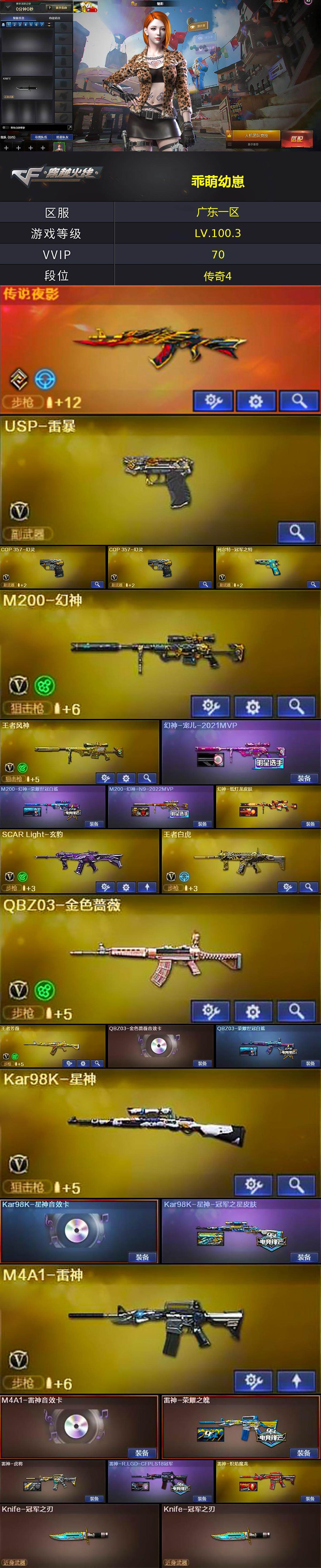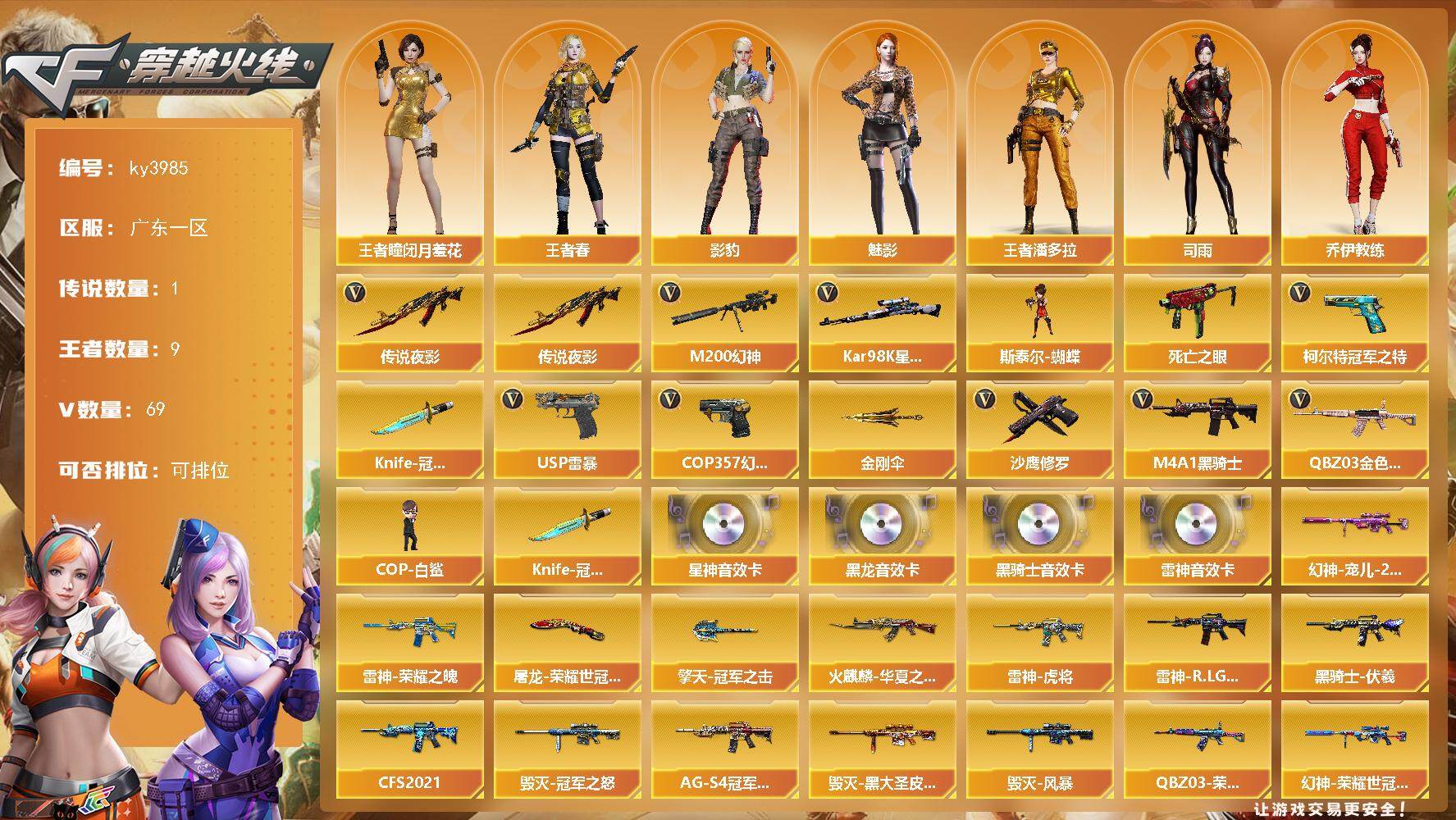 [14427283]广东一区-69V-9王者-0炫金 【传说武器】:传说夜影 【热门武器】:传说夜影,QBZ03-金色蔷薇,M200-幻神,死亡之眼,柯尔特-冠军之特,Kar98K-星神,M4A1-黑骑士,斯泰尔-蝴蝶,COP-白鲨,USP-雷暴,COP 357-幻灵*2,沙鹰-修罗,Knife-冠军之刃*4,金刚伞 【音效卡】:M4A1-雷神音效卡,M4A1-黑龙音效卡,M4A1-黑骑士音效卡,Kar98K-星神音效卡 【皮肤】:幻神-宠儿-2021MVP,M200-幻神-荣耀世冠白鲨,M200-幻神-N9-2022MVP,幻神-纸灯龙皮肤,QBZ03-荣耀世冠白鲨,Kar98K-星神-冠军之星皮肤,雷神-荣耀之魄,雷神-虎将,雷神-R.LGD-CFPLS18冠军,雷神-炽焰魔龙,火麒麟-华夏之心,毁灭-冠军之怒,毁灭-黑大圣皮肤,毁灭-风暴,黑龙-暗月,黑骑士-CFS2021,黑骑士-伏羲,黑骑士-AG-S4冠军典藏,天启-暗月,极光-能量核心,修罗-15周年嘉年华 皮肤,屠龙-荣耀世冠AG,龙啸-纸灯龙皮肤,擎天-冠军之击,麒麟刺-荣耀世冠白鲨 【角色】:魅影,影豹,司雨,王者-瞳-闭月羞花,王者春,王者潘多拉,乔伊教练,云海玲珑,暗夜-X,芳心审判者,风暴女,虎妞,嘉年华灵狐,娟娟,灵狐者-X,龙儿,曼陀罗-X,潘多拉-X,潜龙队-X,斯沃特-X,雪莉杨,影武者-X,游珑儿 【人偶武器】:COP-白鲨,斯泰尔-蝴蝶,海滩汪汪-巴雷特 【暴走生化】:死亡之眼,超级对讲机 【挑战大师】:神圣爆裂者III,AK47-冰龙粉碎者,激光毁灭者III,神圣爆裂者-末日III 【英雄级武器】:AK47-火麒麟,M4A1-黑龙,M4A1-雷神,M4A1-黑骑士,AK12-天启,黑武士-锦绣游龙,SCAR Light-玄豹,QBZ03-金色蔷薇,烈火-动感闪耀,王者白虎-觉醒版,王者芳薇-觉醒版,Barrett-毁灭,Barrett-极光,M200-幻神,Kar98K-星神,王者之怒-觉醒版,王者之光-觉醒版,王者风神-觉醒版,沙鹰-修罗,USP-雷暴,COP 357-幻灵*2,柯尔特-冠军之特,天神-动感闪耀,屠龙*2,龙啸,擎天,麒麟刺,屠龙-动感闪耀,擎天-云海游龙,斩神刀-雷暴*2,高爆手雷-雷霆,高爆手雷-雷暴*4,高爆手雷-幻灵*4,高爆手雷-神工天巧*2,手雷-动感闪耀,手雷-云