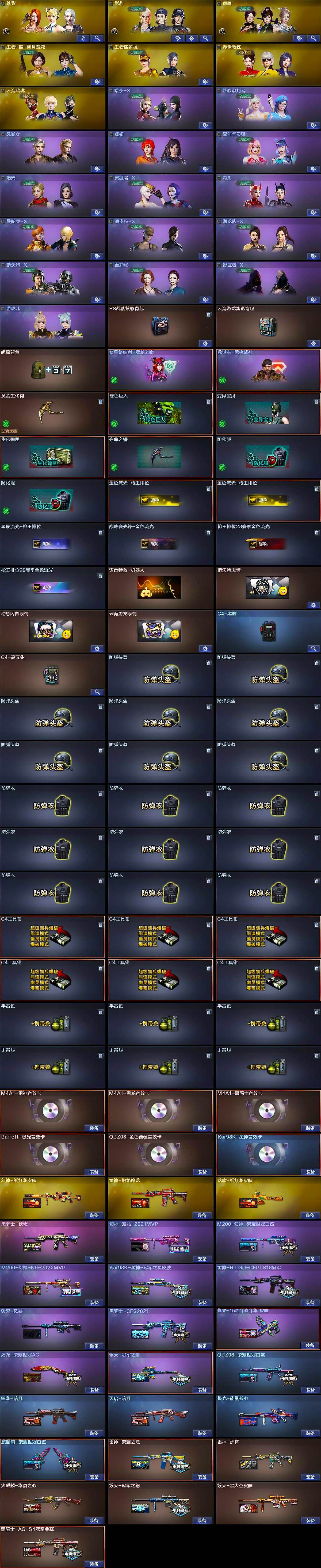 【英雄级武器】:AK47-火麒麟,M4A1-黑龙,M4A1-雷神,M4A1-黑骑士,AK12-天启,黑武士-锦绣游龙,SCAR Light-玄豹,QBZ03-金色蔷薇,烈火-动感闪耀,王者白虎-觉醒版,王者芳薇-觉醒版,Barrett-毁灭,Barrett-极光,M200-幻神,Kar98K-星神,王者之怒-觉醒版,王者之光-觉醒版,王者风神-觉醒版,沙鹰-修罗,USP-雷暴,COP 357-幻灵*2,柯尔特-冠军之特,天神-动感闪耀,屠龙*2,龙啸,擎天,麒麟刺,屠龙-动感闪耀,擎天-云海游龙,斩神刀-雷暴*2,高爆手雷-雷霆,高爆手雷-雷暴*4,高爆手雷-幻灵*4,高爆手雷-神工天巧*2,手雷-动感闪耀,手雷-云