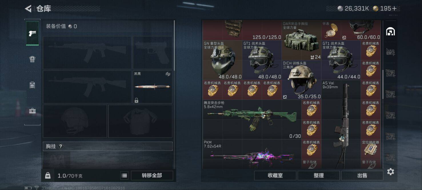 - [12256601]总资产:125.2M 1干员外观 10传说枪械 哈夫币:1.356K 高级安全箱(2×3)9.15号到期 可二次 可修改实名 烽火地带段位:黑鹰 全面战场段位:军士长 传说武器皮肤:SR-25射手步枪-水墨云图,SCAR-H战斗步枪-水墨云图,AS Val突击步枪-蛇年祥瑞,SCAR-H战斗步枪-铁艺苍穹,SMG45冲锋枪-骑士,勇士冲锋枪-能天使-午夜邮差,复合弓-黑-天际线,725双管霰弹枪-送葬人-无题密令,AK-12突击步枪-夜鹰,M4A1突击步枪-蚀金玫瑰 史诗武器皮肤:Ash-12战斗步枪-守夜人,M16A4突击步枪-竞赛选手,AS Val突击步枪-尖端治疗,M700狙击步枪-守夜人,SG552突击步枪-尖端治疗,MP5冲锋枪-深海恐惧,PKM通用机枪-荒野求生,SV-98狙击步枪-囚徒,PSG-1射手步枪-无垢,SVD狙击步枪-荒野求生,SR-3M紧凑突击步枪-荒野求生 干员外观:红狼-蚀金玫瑰