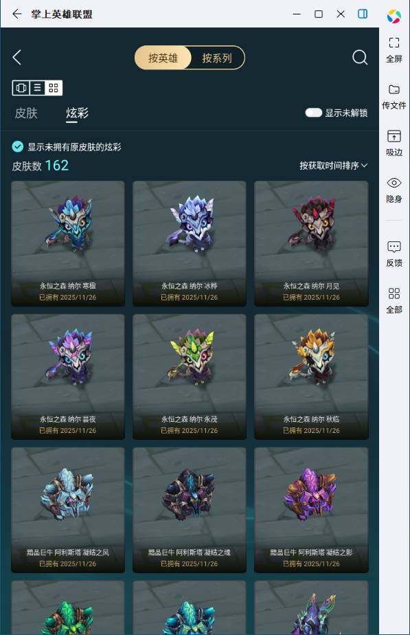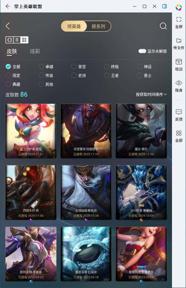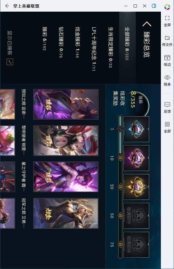 【臻彩皮肤】:无畏骑士瑟庄妮赤子初心,冠军之箭艾希凯旋圣装,霸天异形卡兹克掠空魅影,黎明使者锐雯黑夜使者,星之守护者辛德拉未来之光,星之守护者霞烈羽,可爱可爱粉红红布里茨,预知之眼亚索不怠