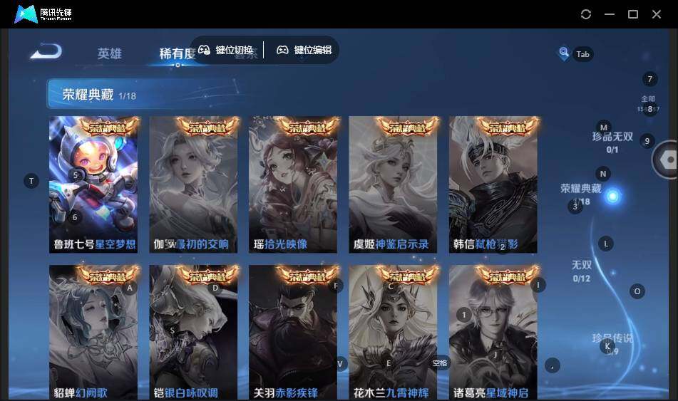 - PX_2089976-40 安卓QQ/荣耀王者/197皮肤/123英雄/1典藏/0珍品无双/0无双/0珍品传说/13传说/51史诗/8稀有英雄 【1 典藏皮肤】拾光映像 瑶, 【13 传说皮肤】鹤归松栖 云缨,无双飞将 马超,黄金狮子座 达摩,山海·炽霜斩 李信,淬星耀世 赵云,时之奇旅 大乔,妄想实况 马可波罗,超时空战士 狄仁杰,星之鸣奏 杨玉环,幻光神枪 云缨,愿照·千秋盛 女娲,鸣野蒿 桑