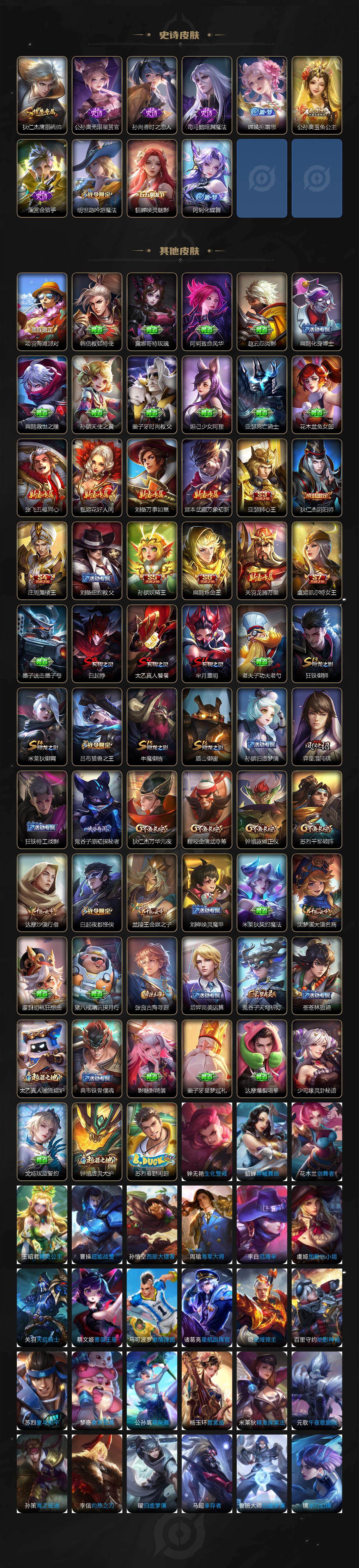 【史诗皮肤】:项羽苍穹之光,露娜紫霞仙子,钟无艳王者之锤,赵云皇家上将,貂蝉圣诞恋歌,王昭君偶像歌手,狄仁杰魔术师,宫本武藏鬼剑武藏,嬴政暗夜贵公子,妲己魅力维加斯,李白千年之狐,妲己热情桑巴,韩信白龙吟,花木兰水晶猎龙者,刘邦德古拉伯爵,小乔缤纷独角兽,兰陵王暗隐猎兽者,诸葛亮黄金分割率,雅典娜冰冠公主,安琪拉心灵骇客,李元芳逐浪之夏,程咬金功夫厨神,白起星夜王子,嬴政白昼王子,狄仁杰鹰眼统帅,公孙离无限星赏官,孙尚香时之恋人,司马懿暗渊魔法,嫦娥拒霜思,公孙离玉兔公主,澜赏金猎手,明世隐吟游魔法,貂蝉唤灵魅影,阿轲化蝶舞