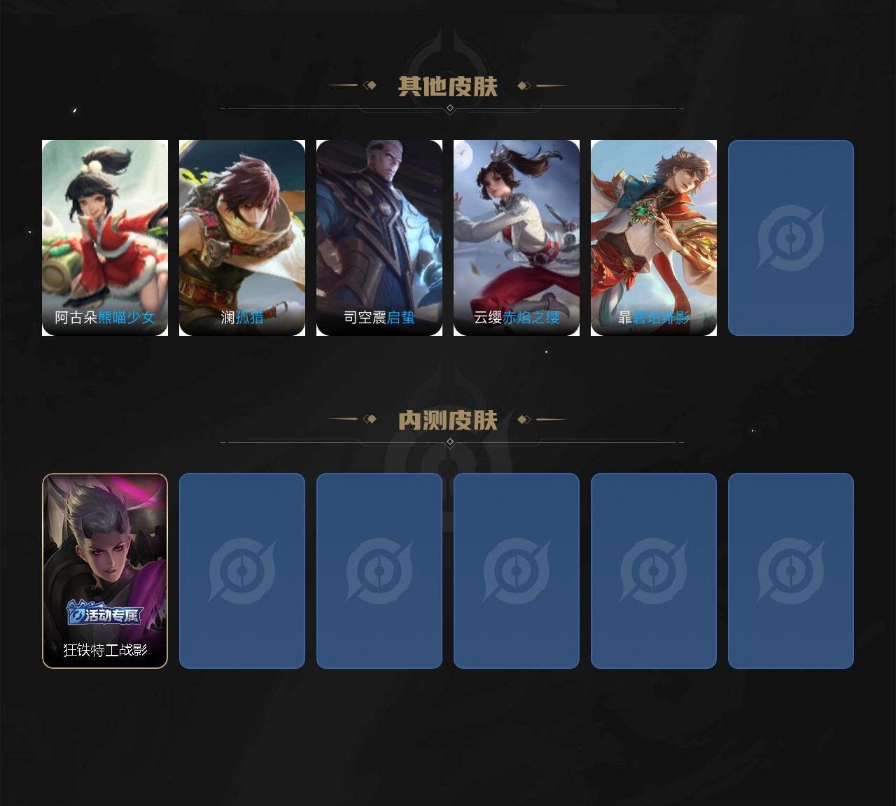 【其他皮肤】:项羽海滩派对,韩信教廷特使,露娜哥特玫瑰,阿轲致命风华,赵云忍炎影,扁鹊化身博士,扁鹊救世之瞳,孙膑天使之翼,姜子牙时尚教父,妲己少女阿狸,亚瑟死亡骑士,花木兰兔女郎,张飞五福同心,甄姬花好人间,刘备万事如意,宫本武藏万象初新,亚瑟狮心王,狄仁杰阴阳师,庄周蜃楼王,刘备纽约教父,孙膑妖精王