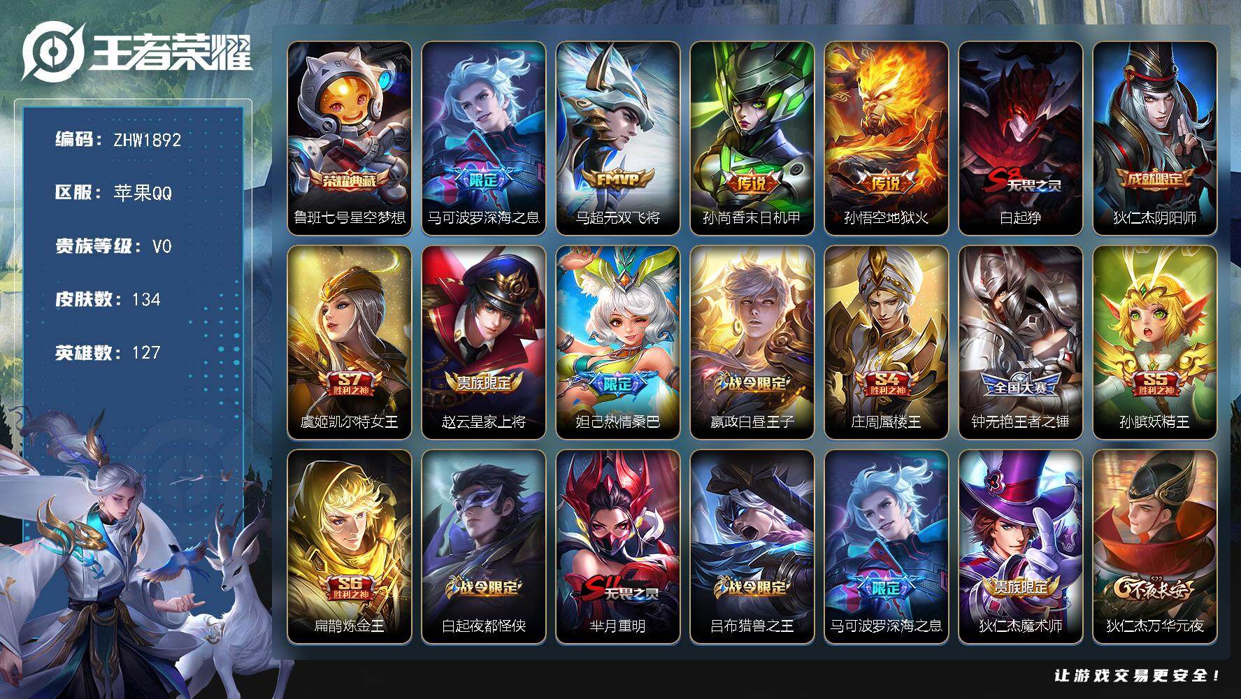 [14429426]可二次【店主推荐捡漏号!可直接换绑/2个市标】:苹果Q-V7-永恒钻石IV段位-127英雄-134皮肤-1典藏皮肤-4传说-34史诗