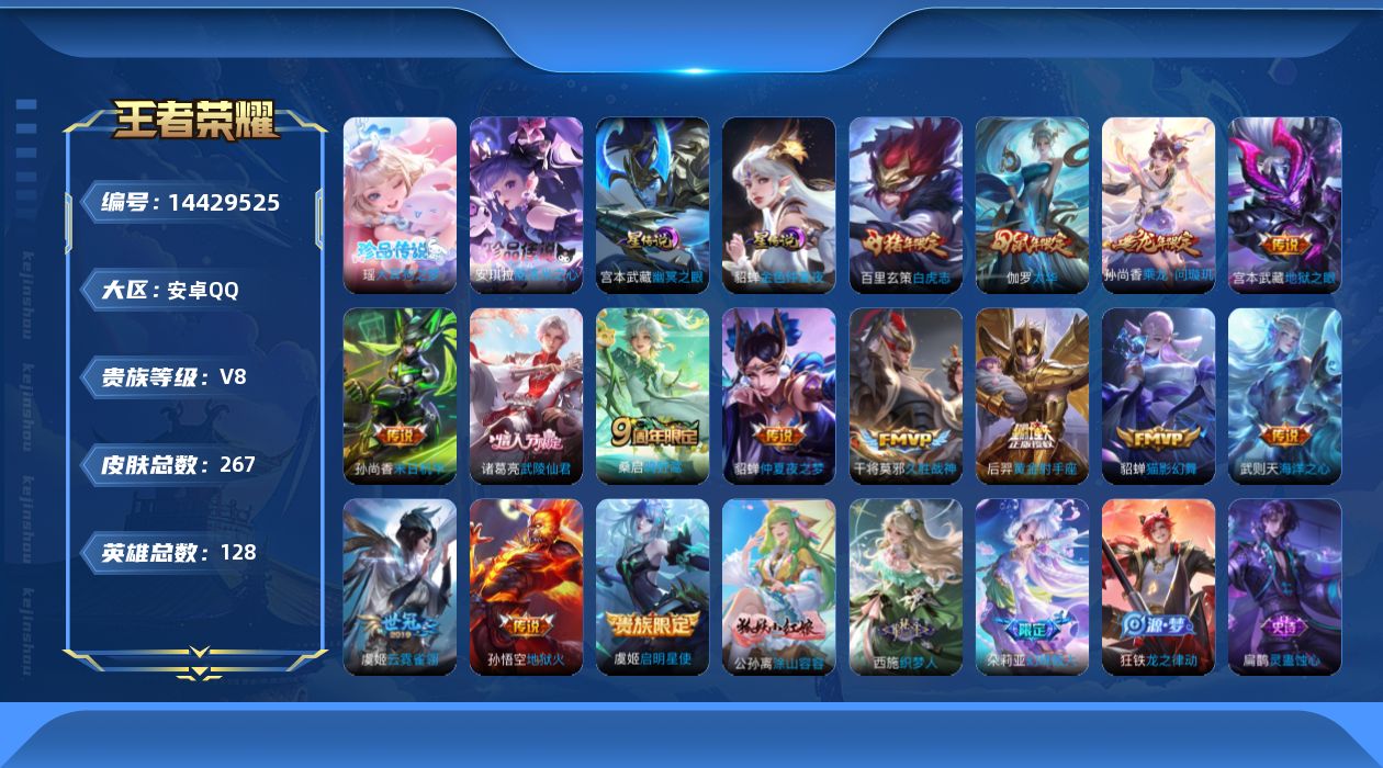 [14429525]【店主推荐捡漏号!可直接换绑】安卓Q-V8-最强王者段位-128英雄-267皮肤-1典藏英雄-2珍品传说-15传说-88史诗