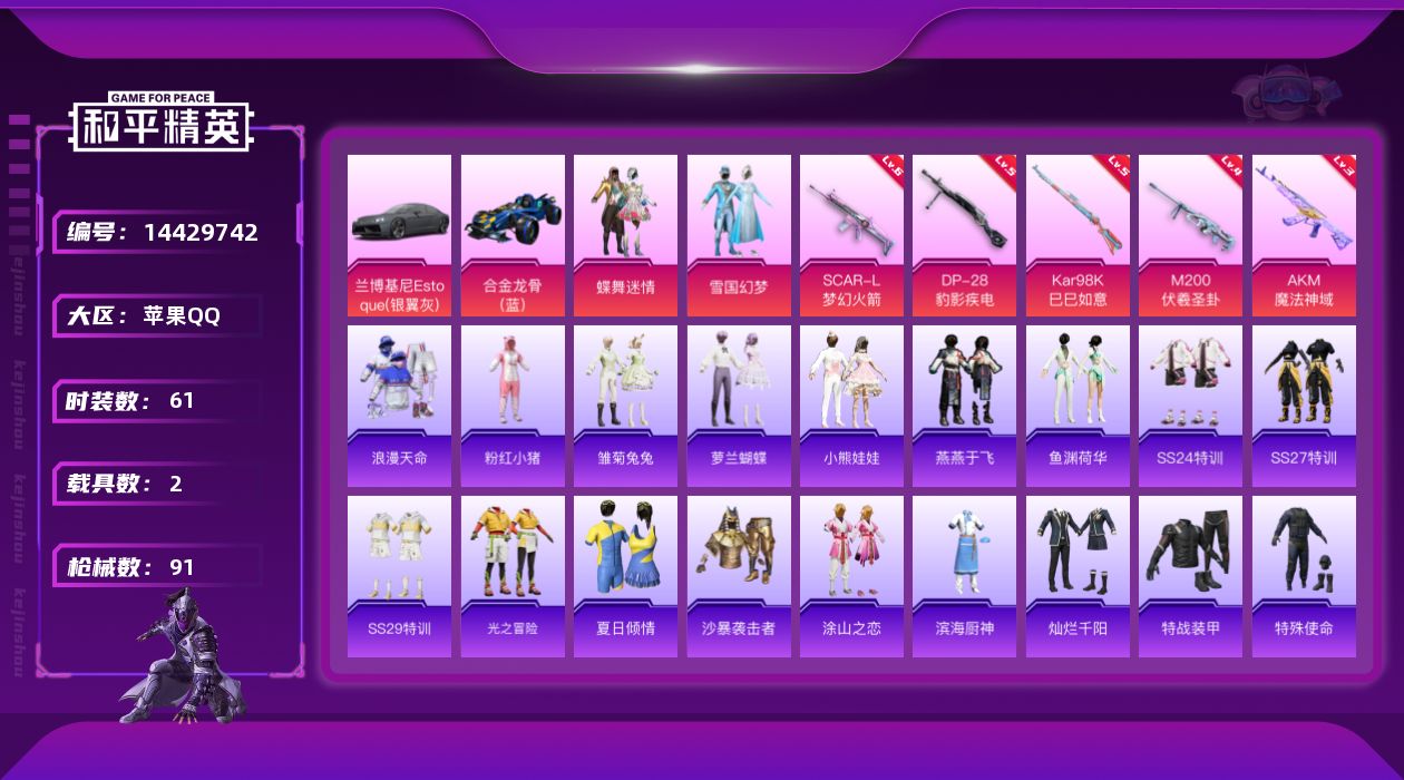 [14429742]【店主推荐捡漏号!可直接换绑】/素材身法号/老木乃伊/绝世印记1 苹果 手Q-2粉装-5特效枪-2载具-2粉色飞行器-2.9w热力值-7王牌印记-61套装-91枪皮【热门品类】:粉装-雪国幻梦,套装-浪漫天命,套装-冥河战士,套装-深海小丑鱼,套装-沙漠守护者,套装-AG战队服,套装-粉红小猪【粉色载具】:兰博基尼Estoque(银翼灰),合金龙骨(蓝)【粉色套装】:粉装-雪国幻梦,粉装-蝶舞迷情【粉色枪皮等级】:AKM-魔法神域(三级),SCAR-L-梦幻火箭(六级),Kar98K-巳巳如意(五级),M200-伏羲圣卦(四级),DP-28-豹影疾电(五级)【粉色飞行器】:春暖花开飞行器
