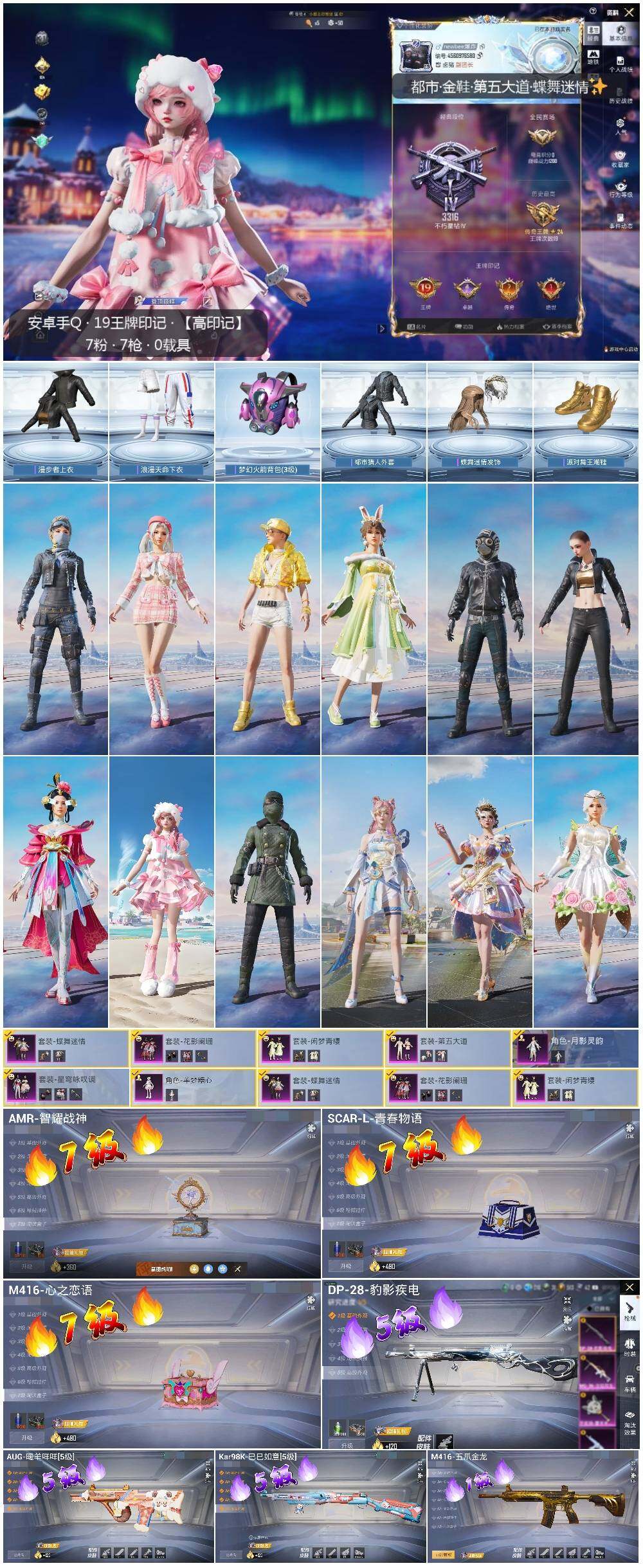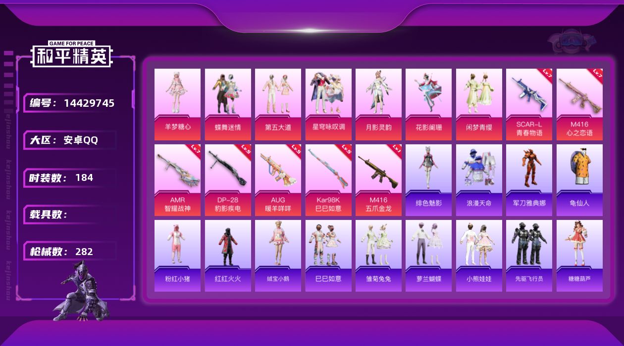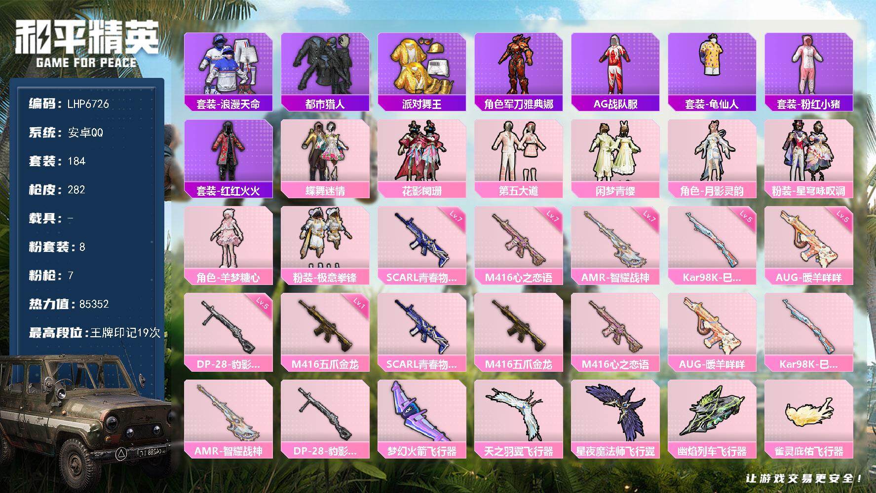 [14429745]【店主推荐捡漏号!可直接换绑】/素材身法号/绝世印记1 安卓 手Q-8粉装-7特效枪-6粉色飞行器-8.5w热力值-19王牌印记-184套装-282枪皮【热门品类】:套装-浪漫天命,套装-都市猎人,套装-派对舞王,角色-军刀雅典娜,套装-AG战队服,套装-龟仙人,套装-粉红小猪,套装-红红火火【粉色套装】:粉装-蝶舞迷情,粉装-花影阑珊,粉装-第五大道,粉装-闲梦青缨,角色-月影灵韵,粉装-星穹咏叹调,角色-羊梦糖心,粉装-极意拳锋【粉色枪皮等级】:SCAR-L-青春物语(七级),M416-五爪金龙(一级),M416-心之恋语(七级),AUG-暖羊咩咩(五级),Kar98K-巳巳如意(五级),AMR-智耀战神(七级),DP-28-豹影疾电(五级)【粉色飞行器】:梦幻火箭飞行器,天之羽翼飞行器,星夜魔法师飞行翼,幽焰列车飞行器,雀灵庇佑飞行器